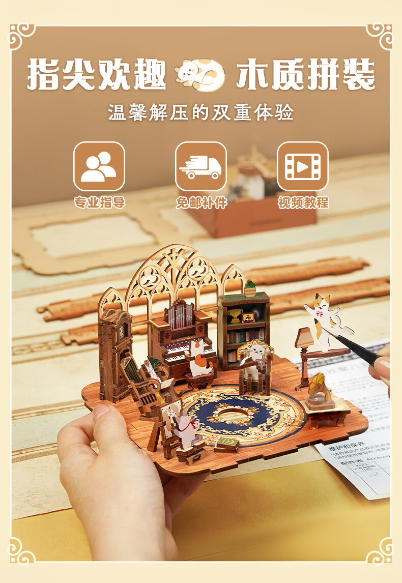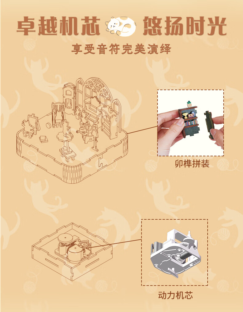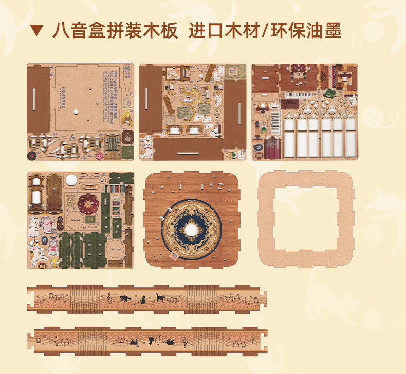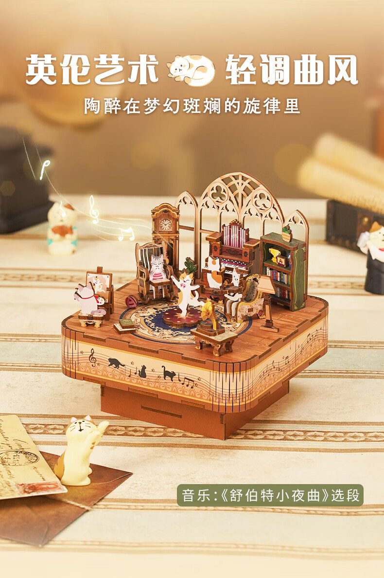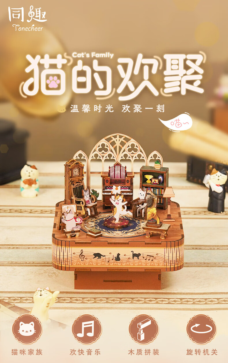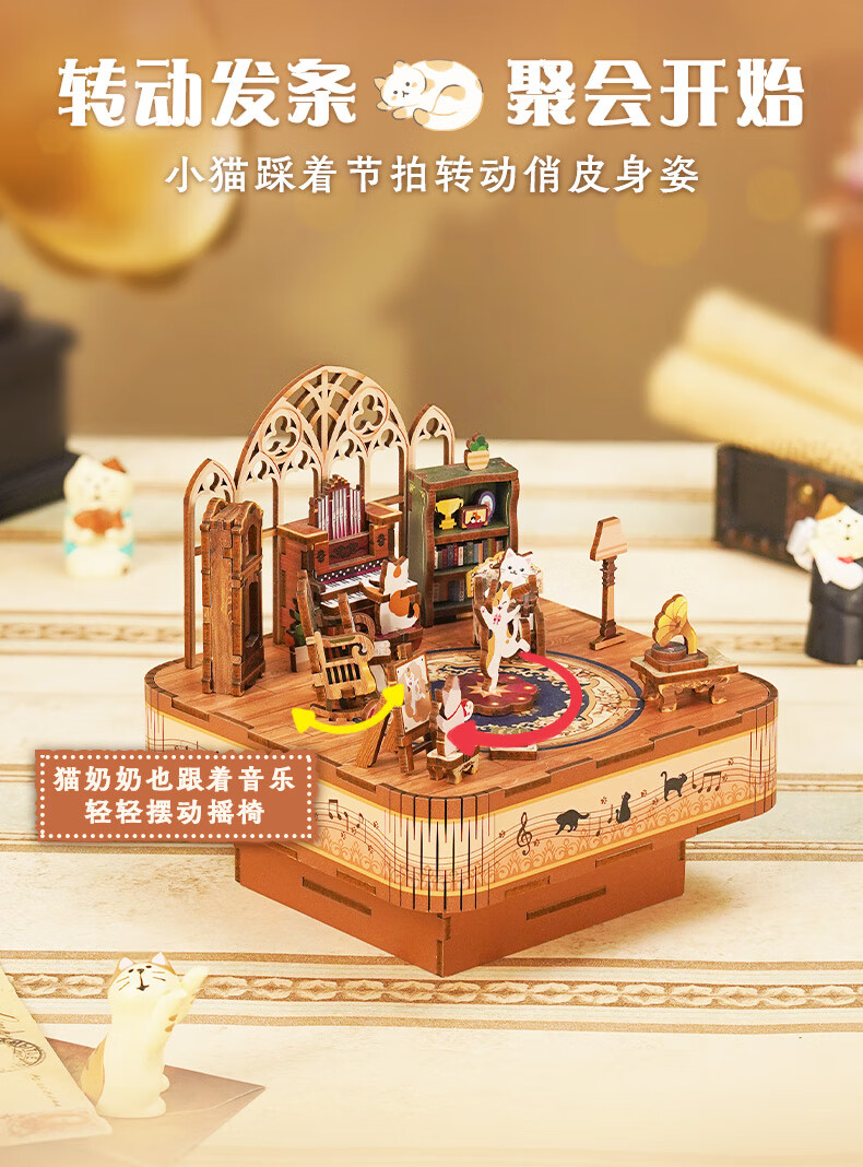 同趣猫的欢聚拼装八音盒旋转积木玩具木质拼图手工立体摆件生日礼物女