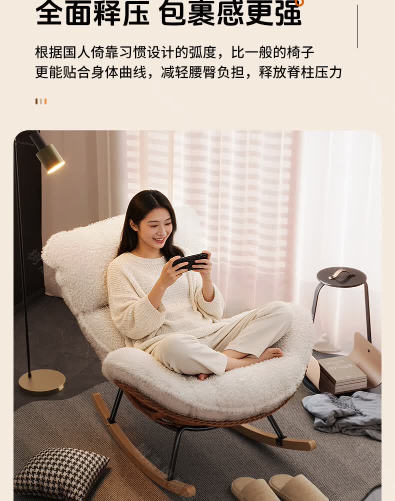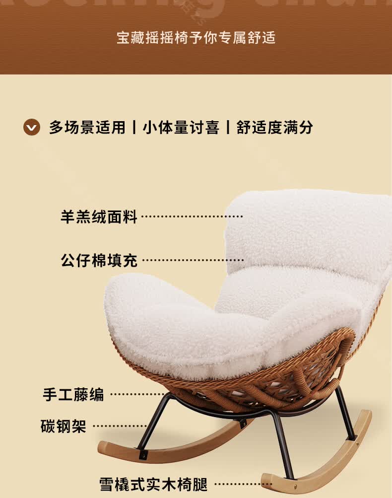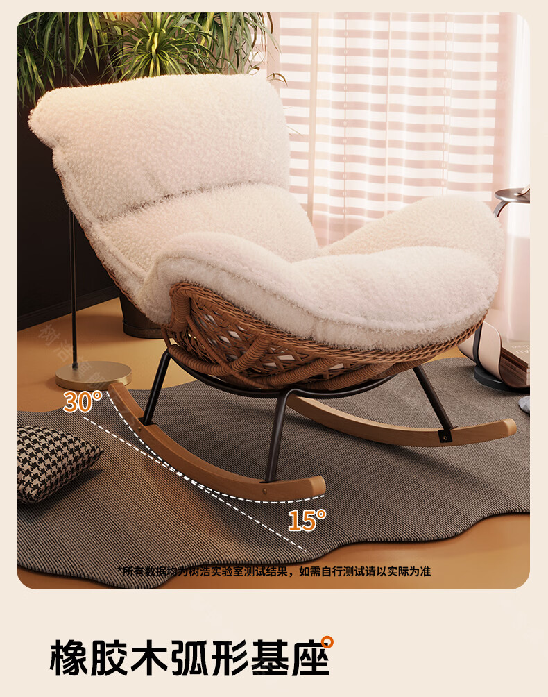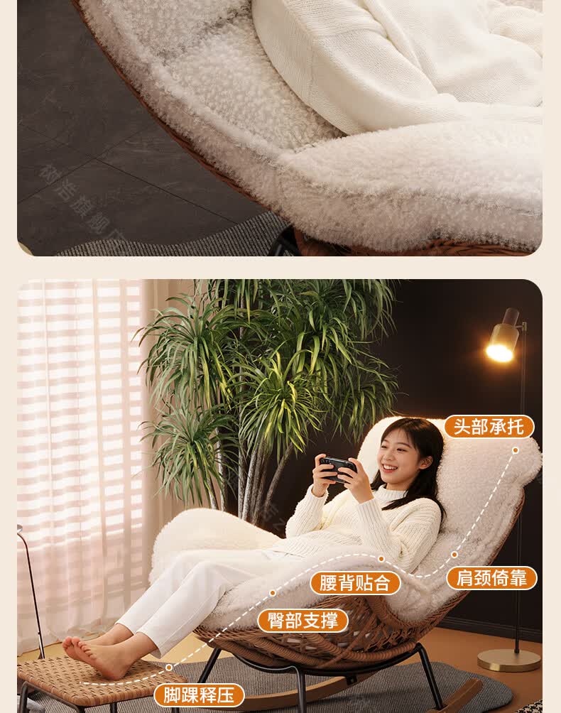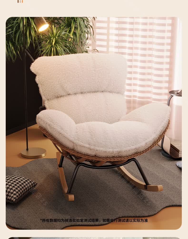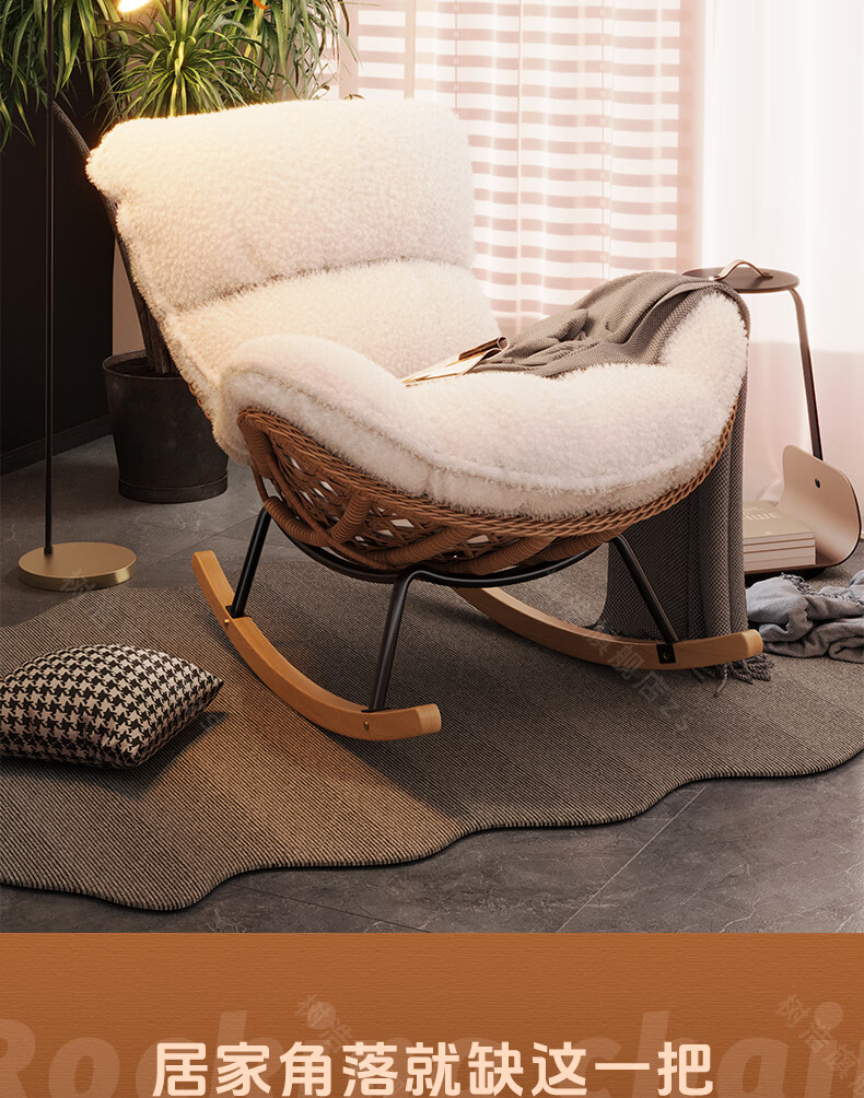 树浩摇摇椅躺椅阳台家用休闲藤编沙发椅懒人沙发户外庭院成人午休摇椅 【柔软羊羔绒】单藤椅-绒白色坐垫