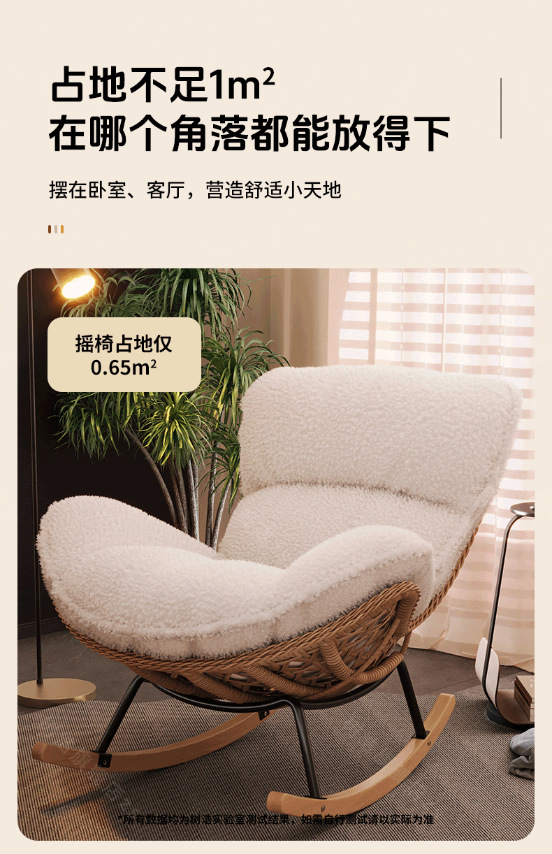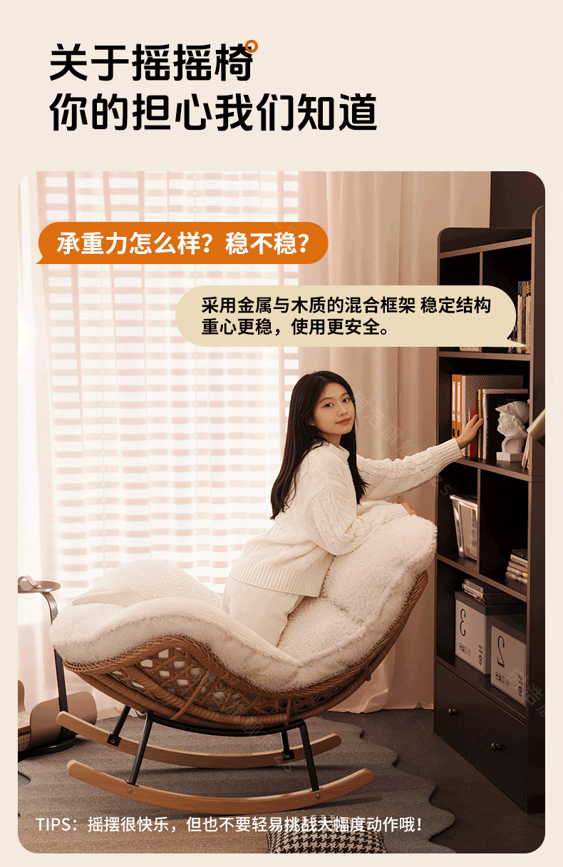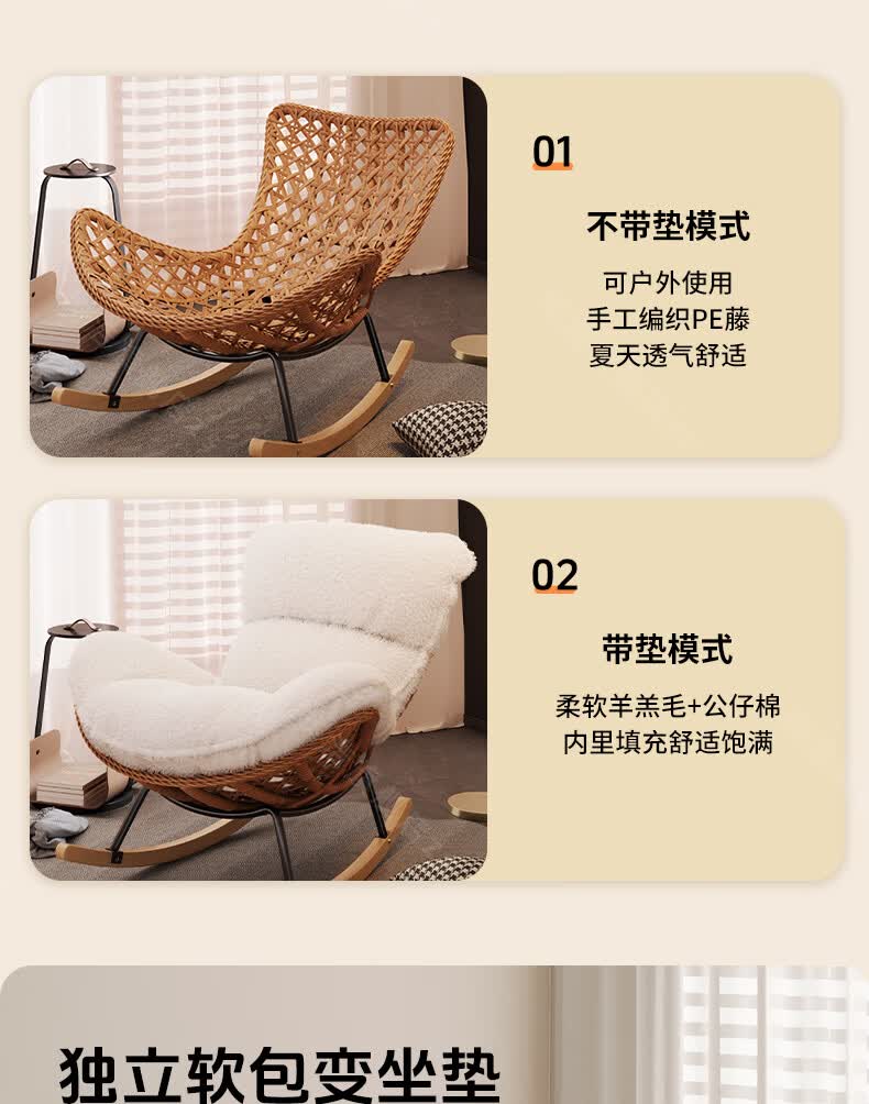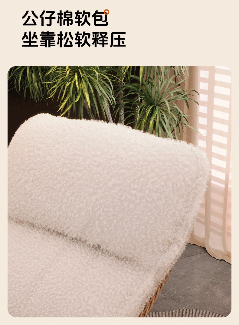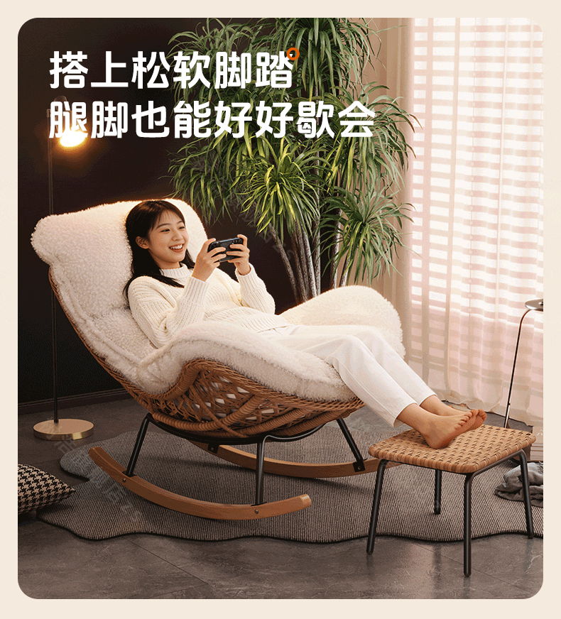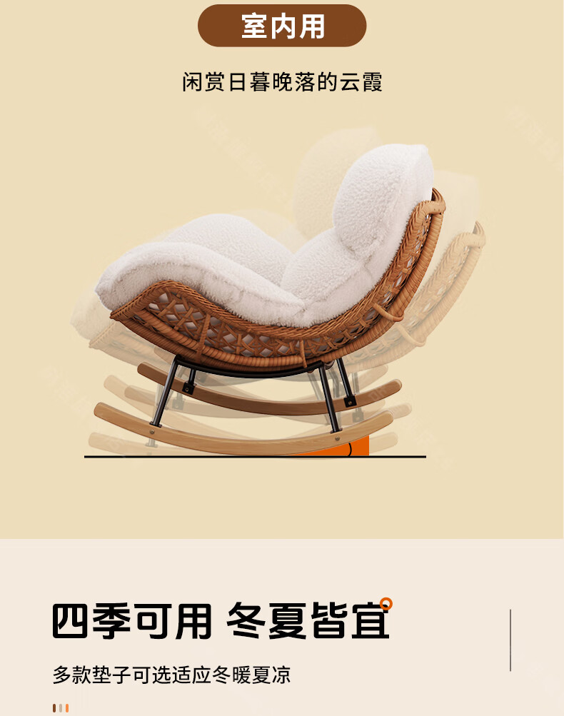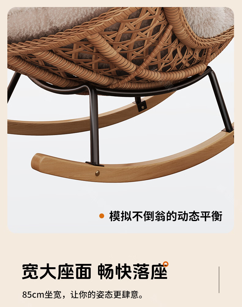 树浩摇摇椅躺椅阳台家用休闲藤编沙发椅懒人沙发户外庭院成人午休摇椅 【柔软羊羔绒】单藤椅-绒白色坐垫