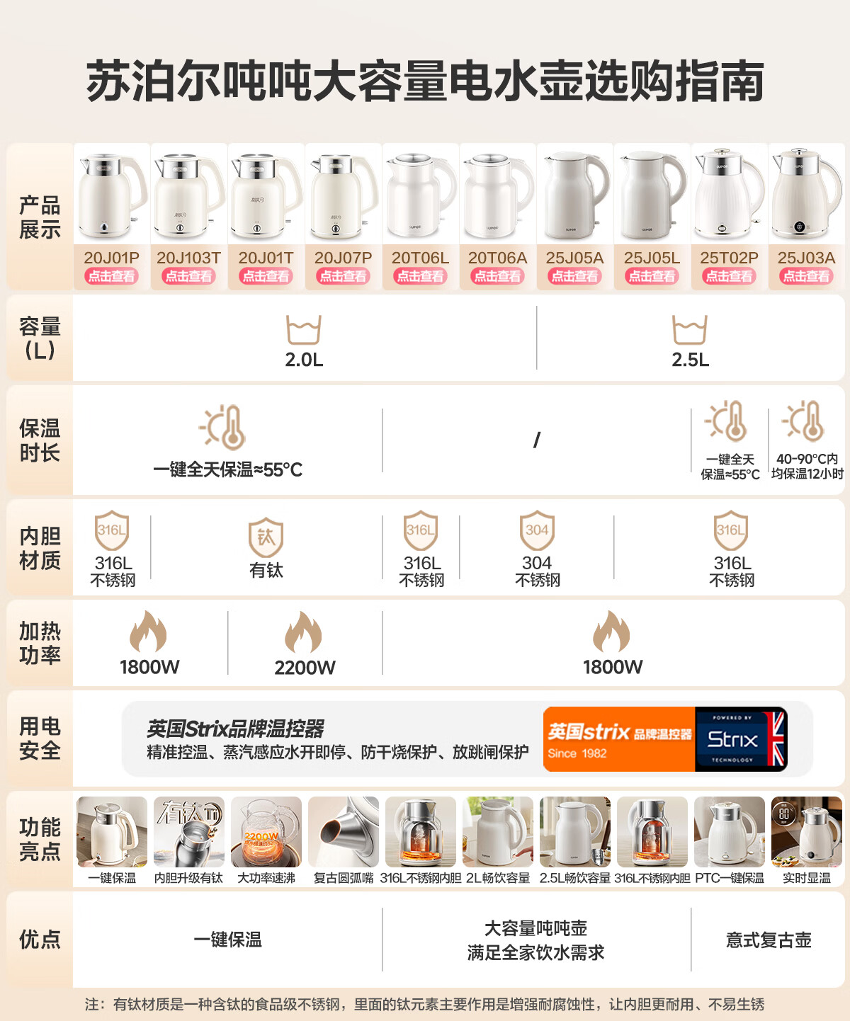 苏泊尔(SUPOR)吨吨大容量电水壶热水壶 2L无缝内胆电热水壶316L不锈钢烧水壶一键保温 恒温水壶 SW-20J01P