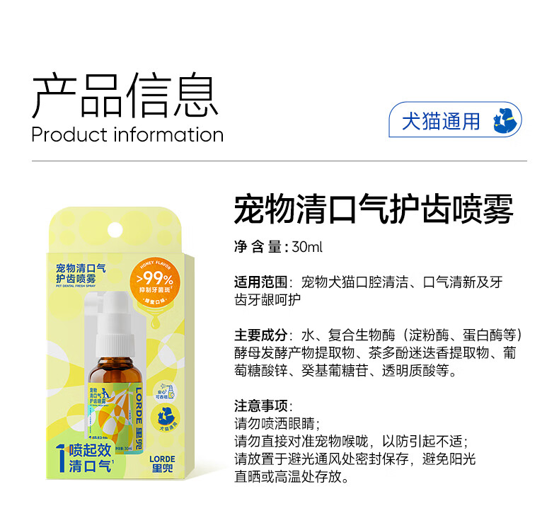 lorde 洁齿漱口水改善牙结石口臭抑菌狗狗猫咪护齿喷雾30ml【试用】