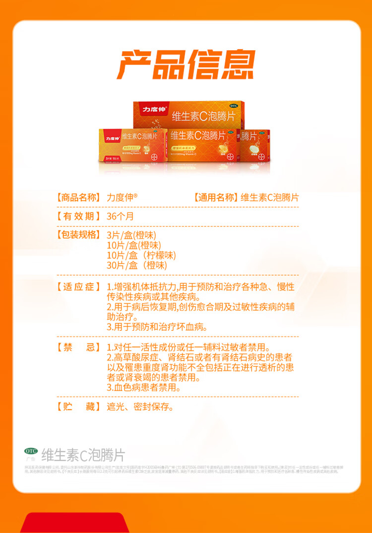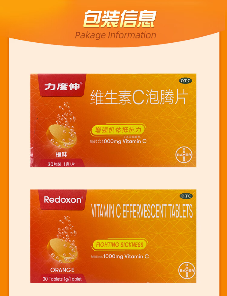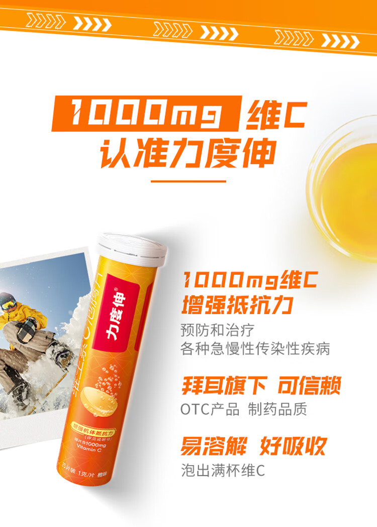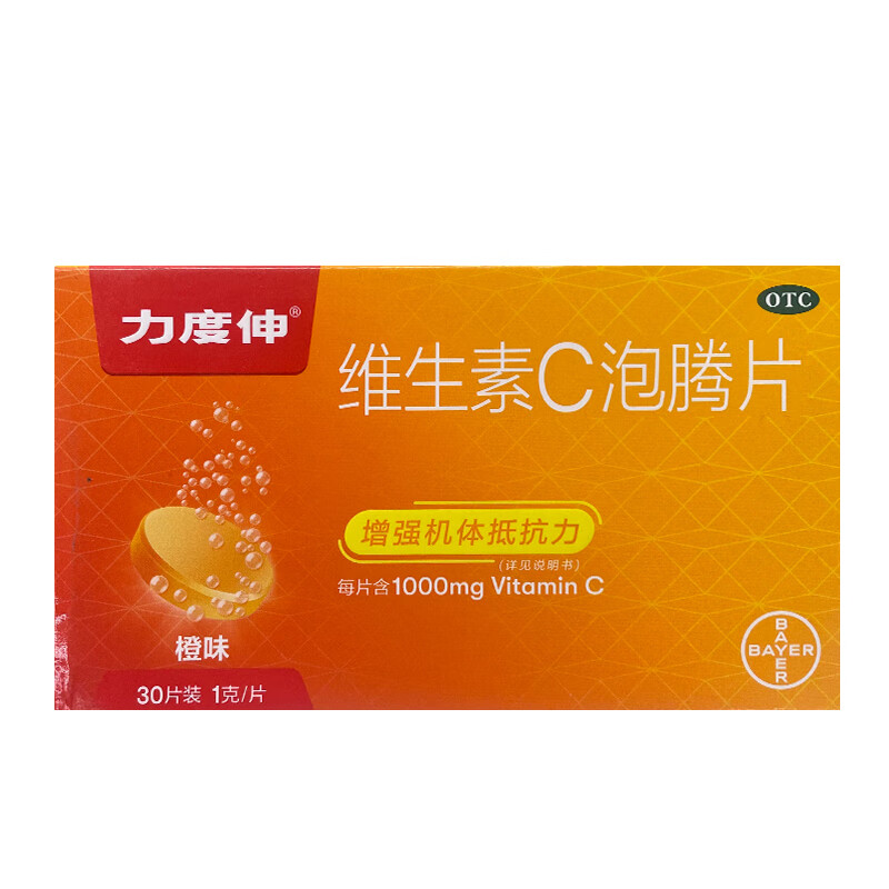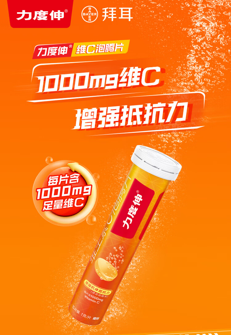 拜耳力度伸原研药 维C泡腾片橙味1g*30片 1盒装 增强免疫力抵抗力高含量VC换季抗疲劳预防感冒 补充维生素C