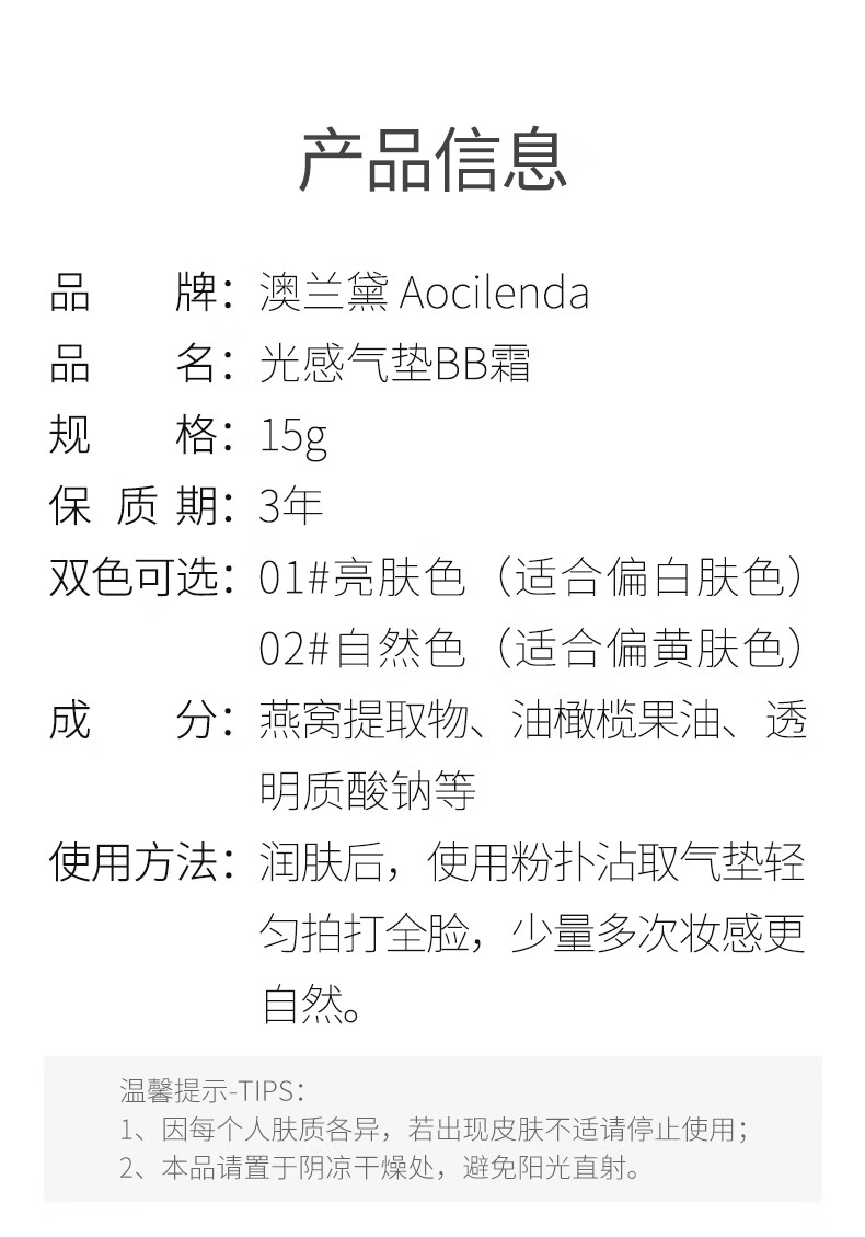 澳兰黛(AOCILENDA)燕窝滢润气垫bb霜备孕妇女护肤品遮瑕隔离粉底液彩妆自然色