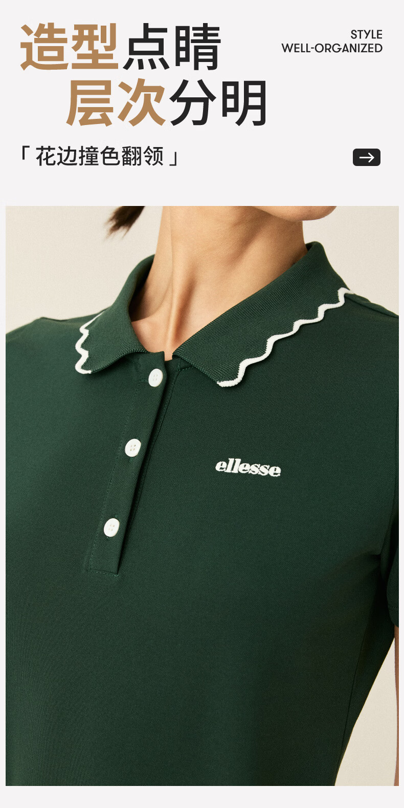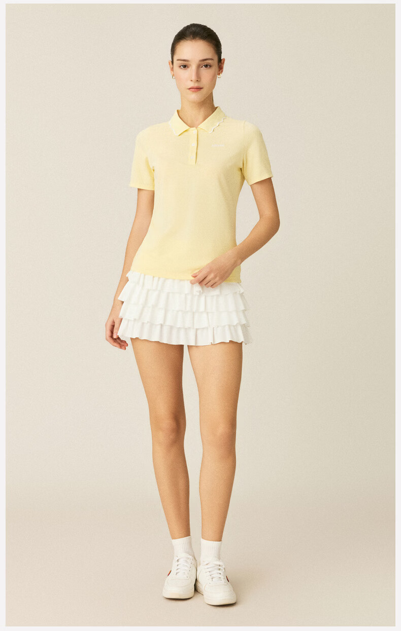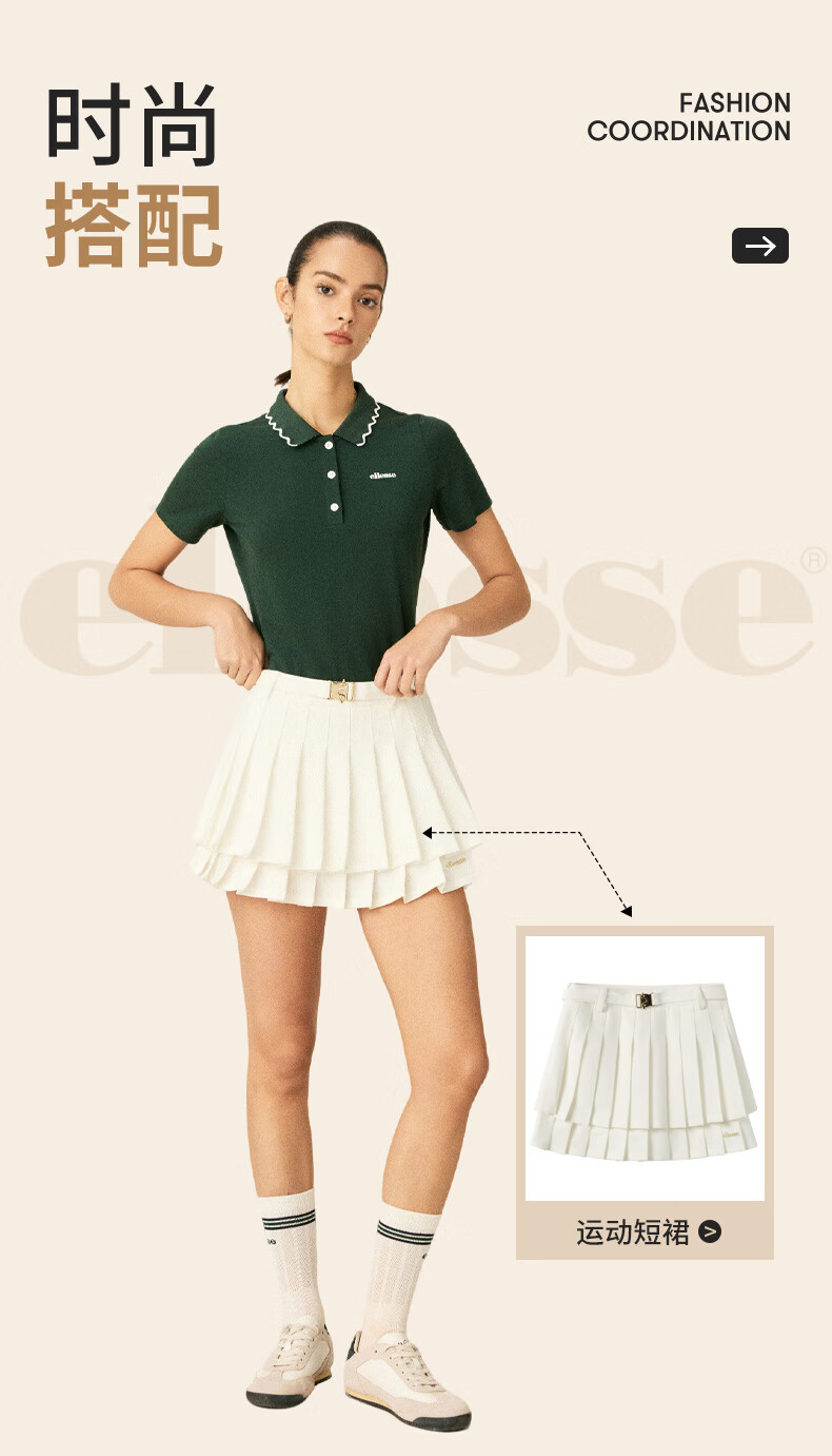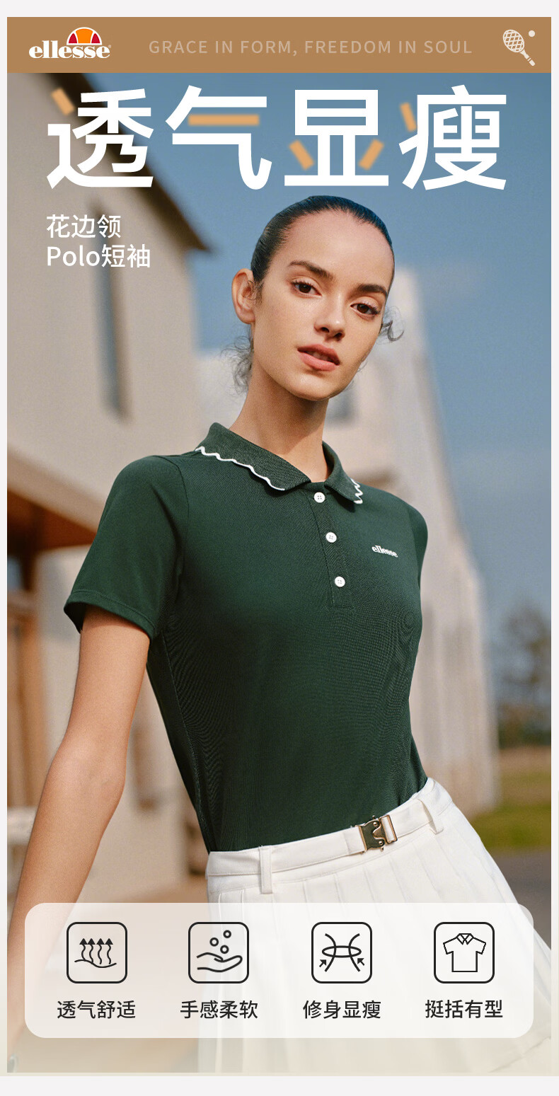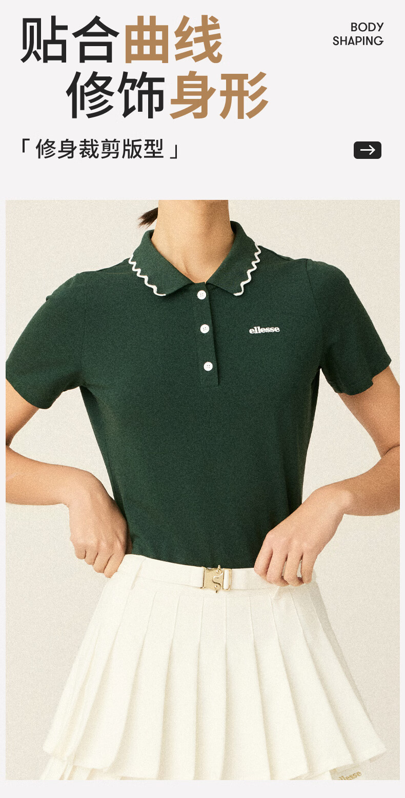 ellesse小贝壳26春季新品网球服运动透气显瘦POLO花边领短袖女 深林绿 S