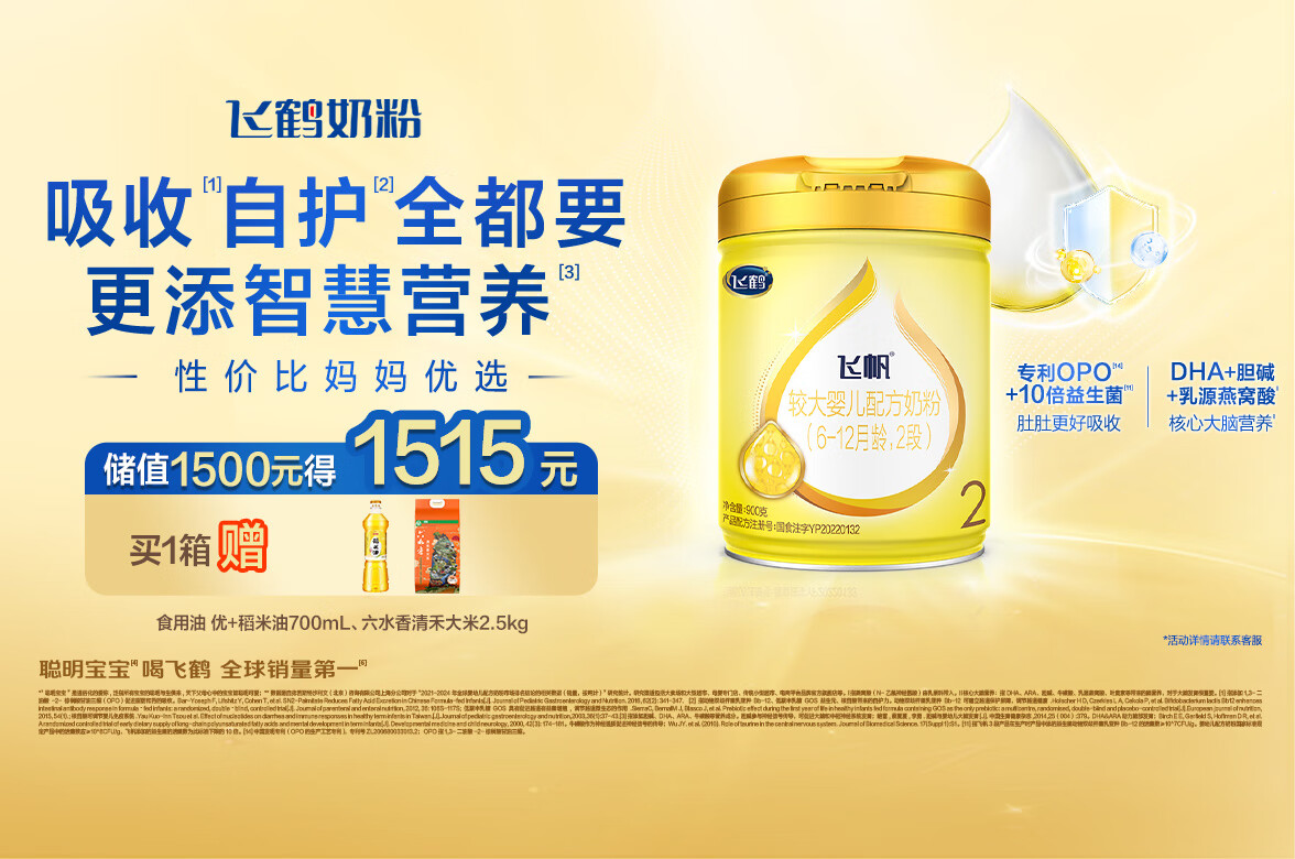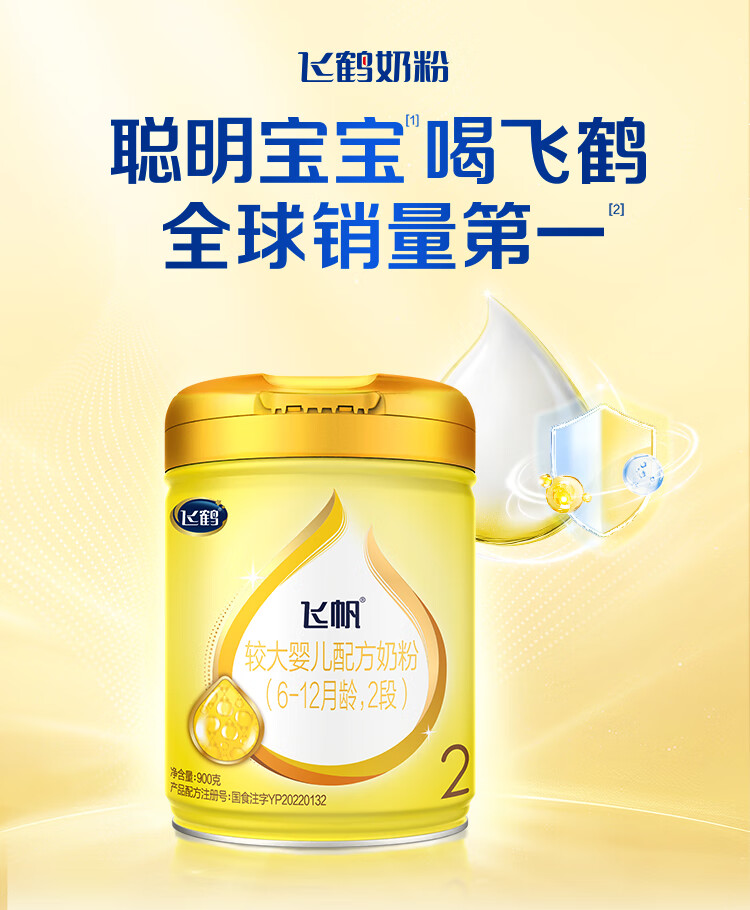 飞鹤飞帆DHA10倍益生菌专利OPO较大婴儿配方奶粉2段(6-12月)900g*1罐