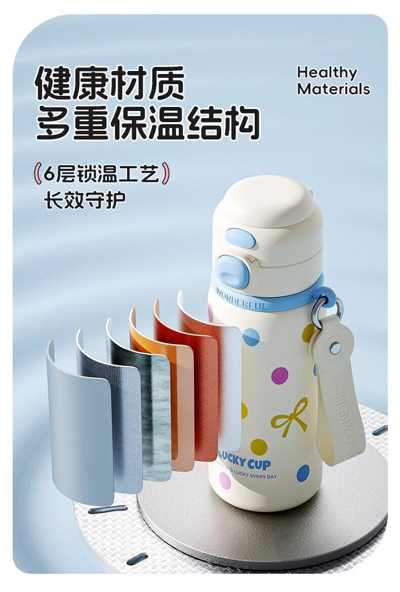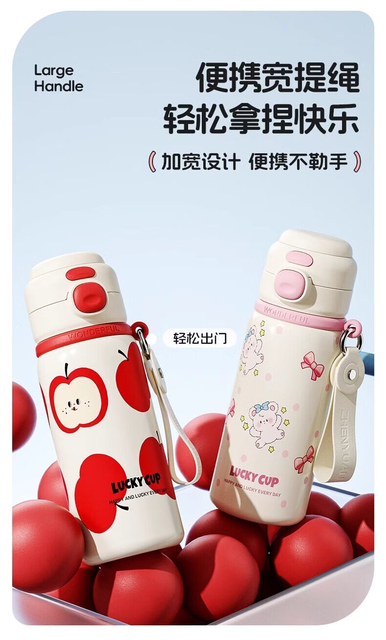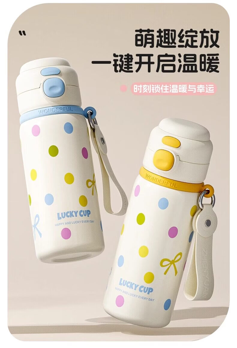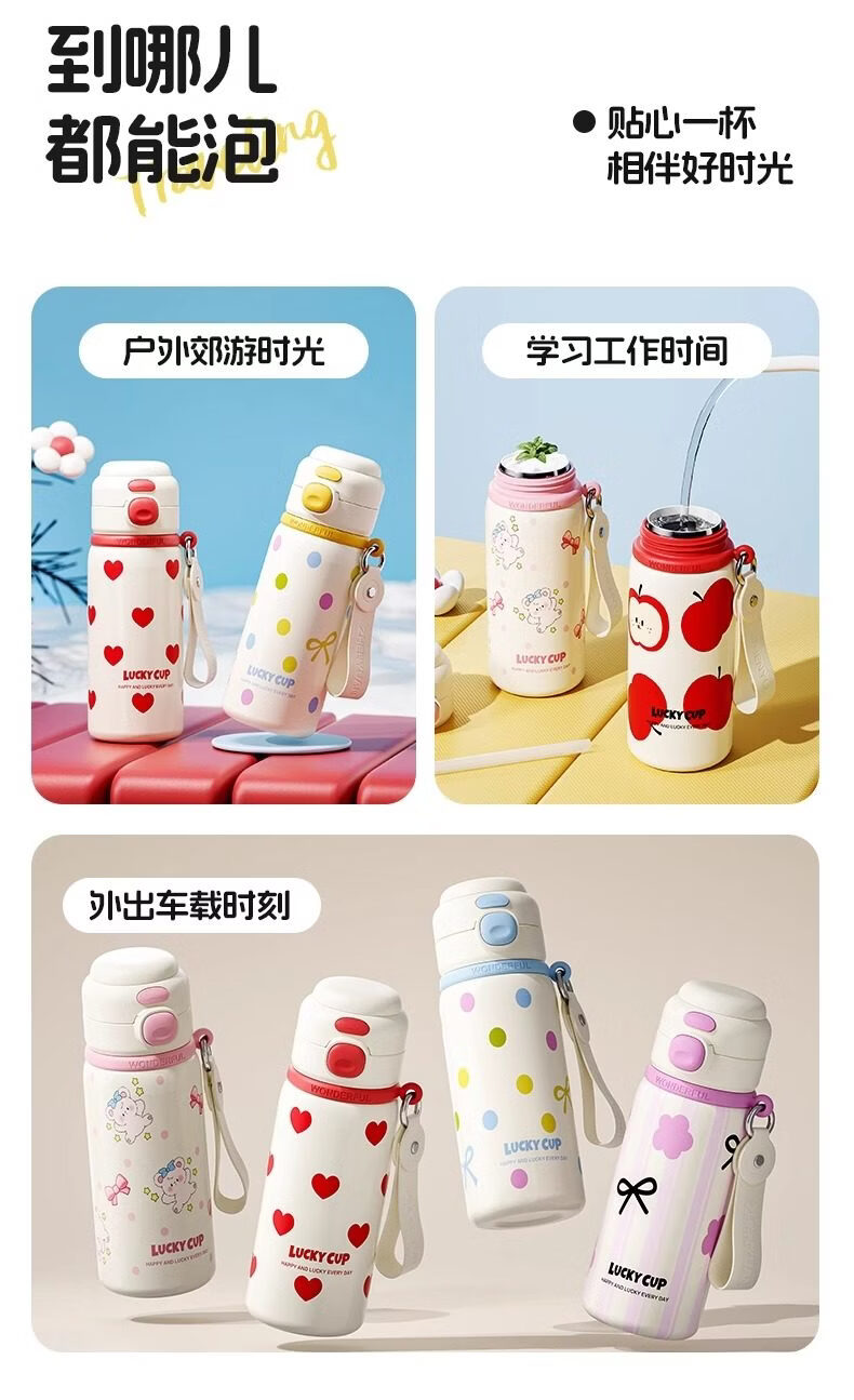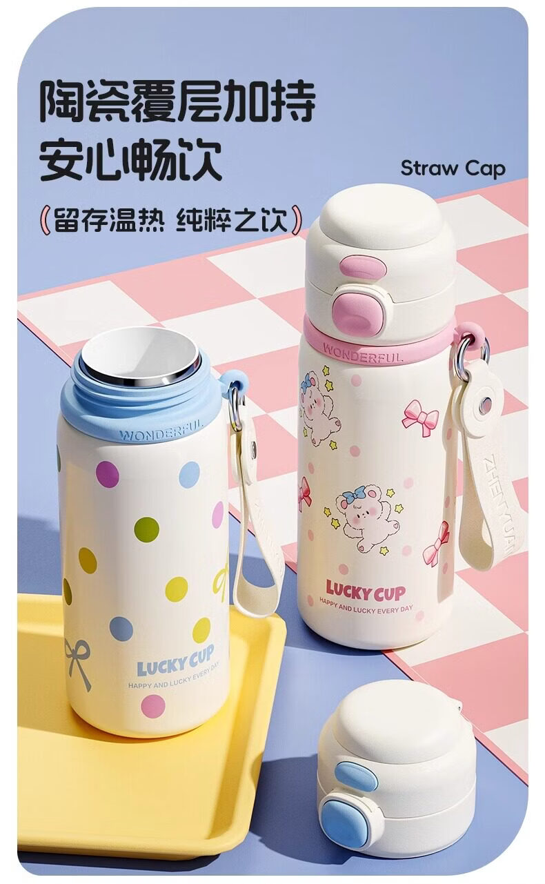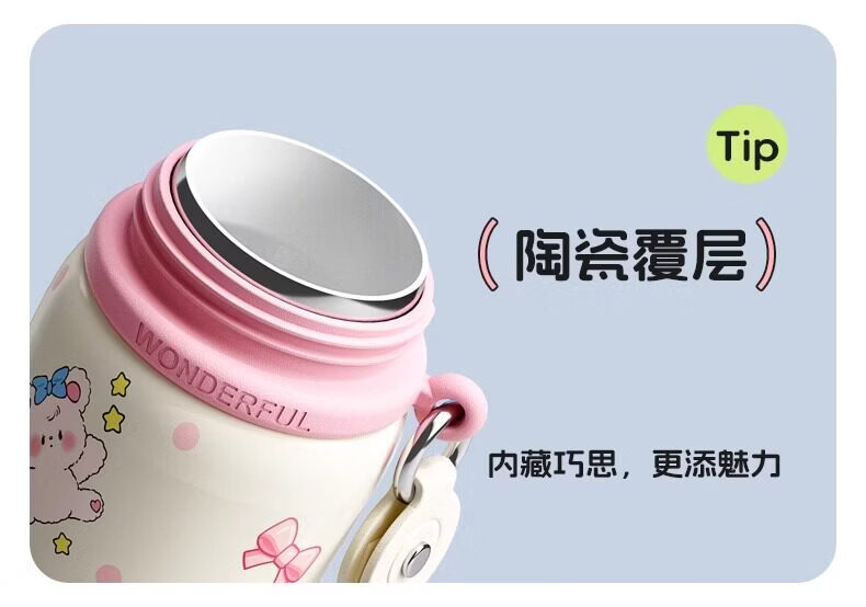 膳魔师(THERMOS)儿童保温杯6-12岁上学专用可爱吸管水杯女生高颜值新款陶瓷杯子学 甜梦粉-500ml(自带提绳) 316不锈钢