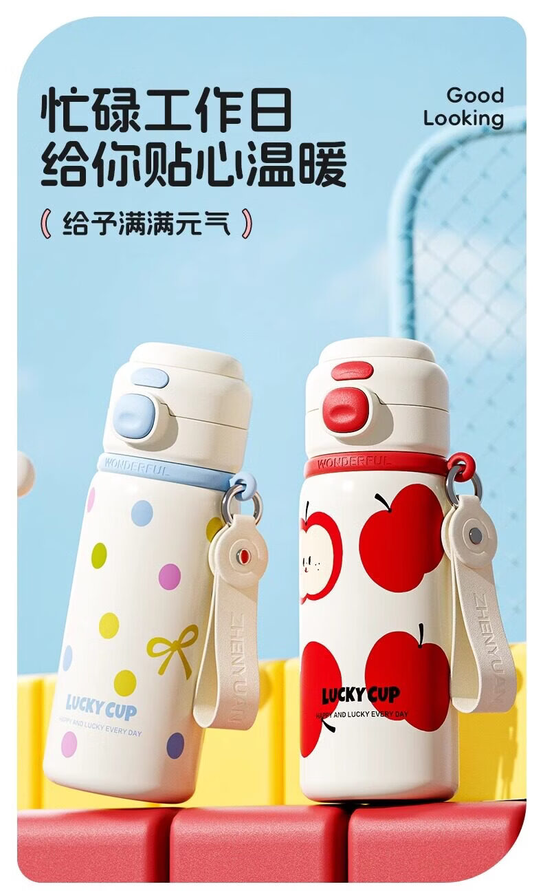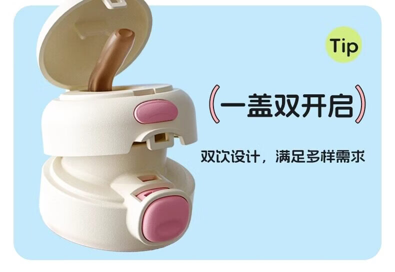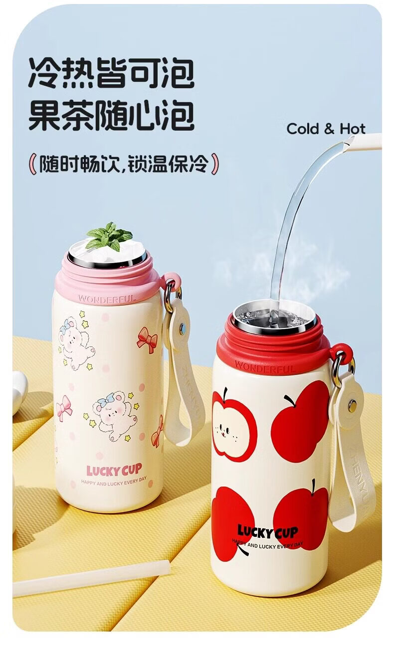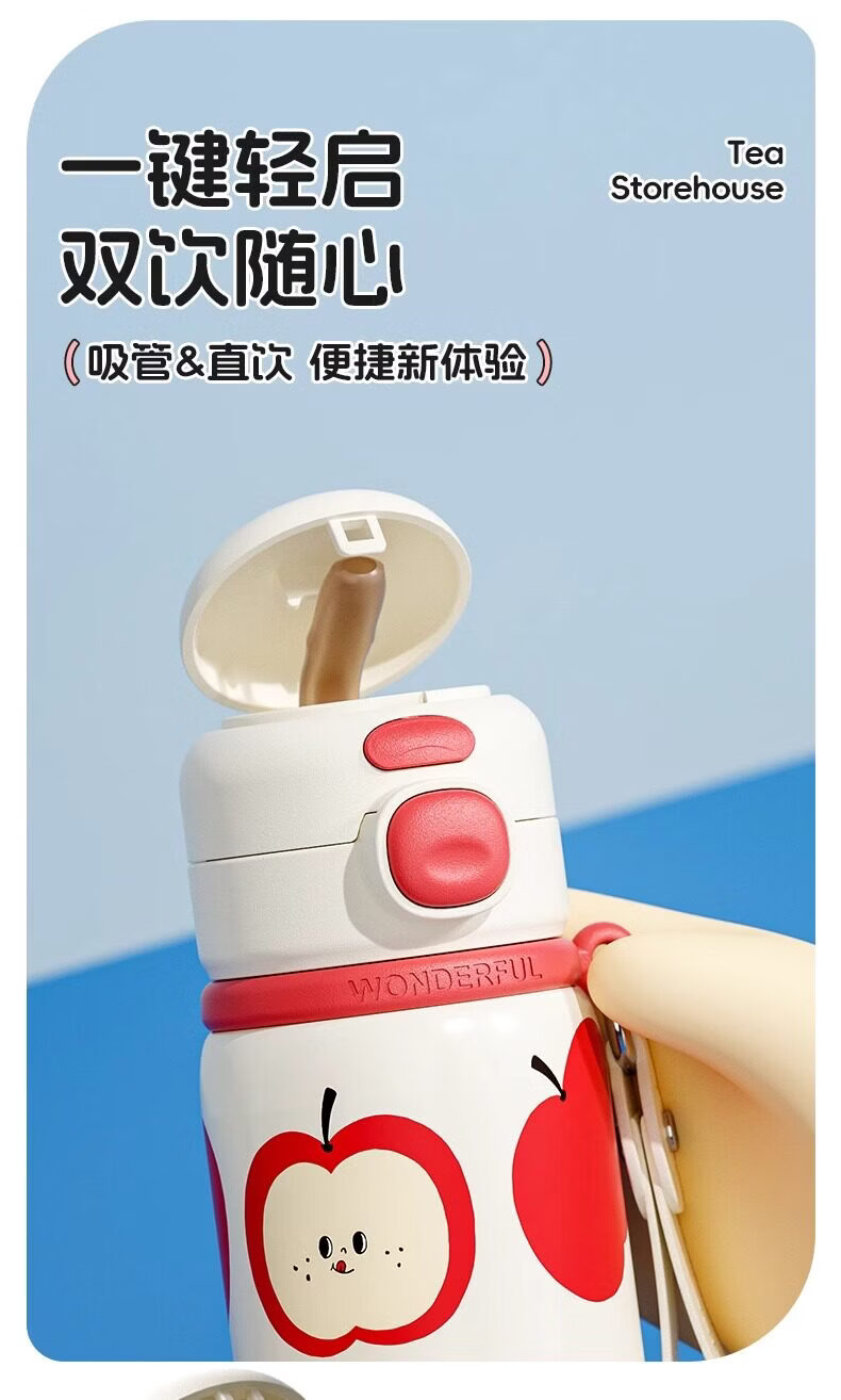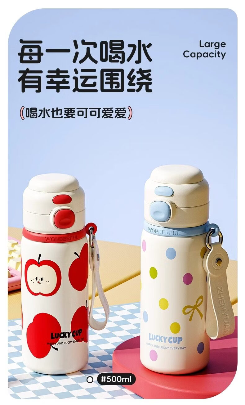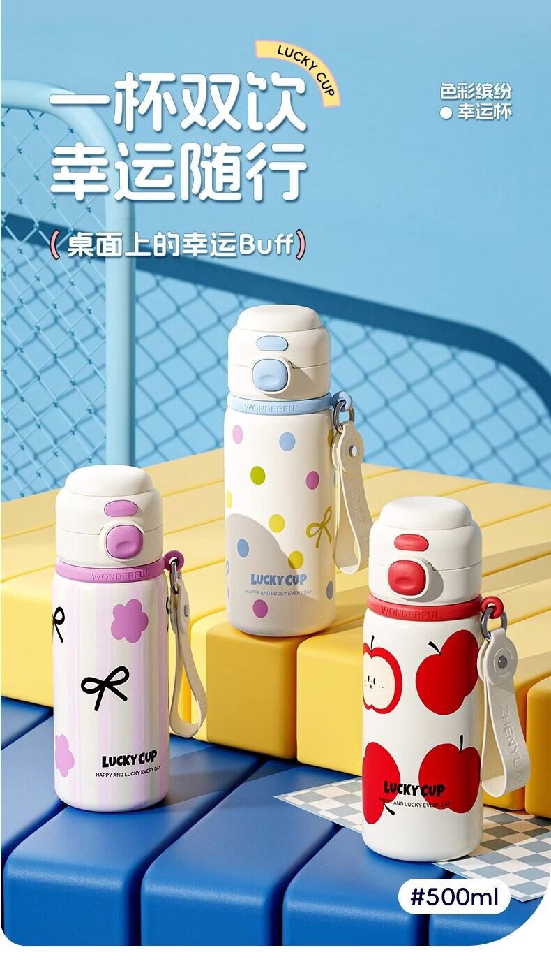 膳魔师(THERMOS)儿童保温杯6-12岁上学专用可爱吸管水杯女生高颜值新款陶瓷杯子学 甜梦粉-500ml(自带提绳) 316不锈钢