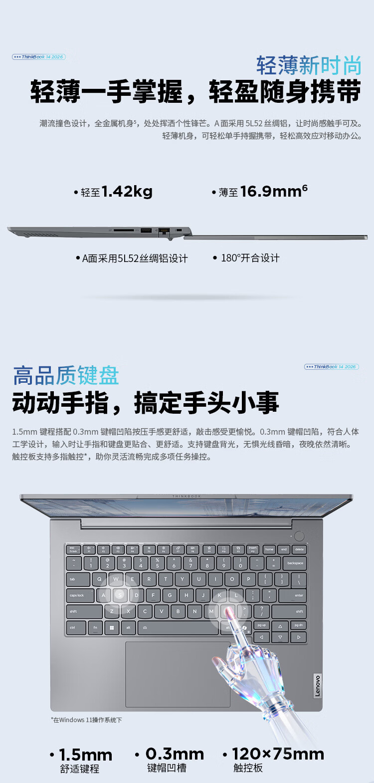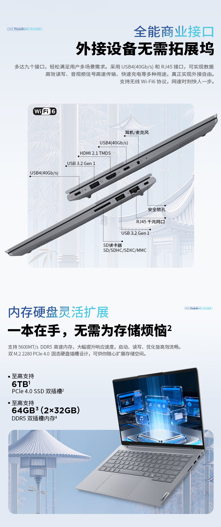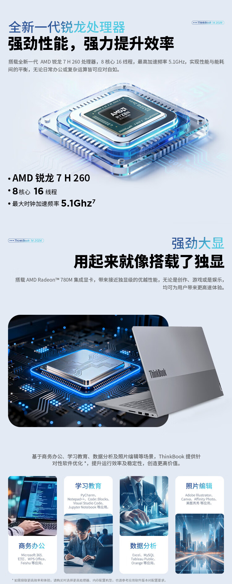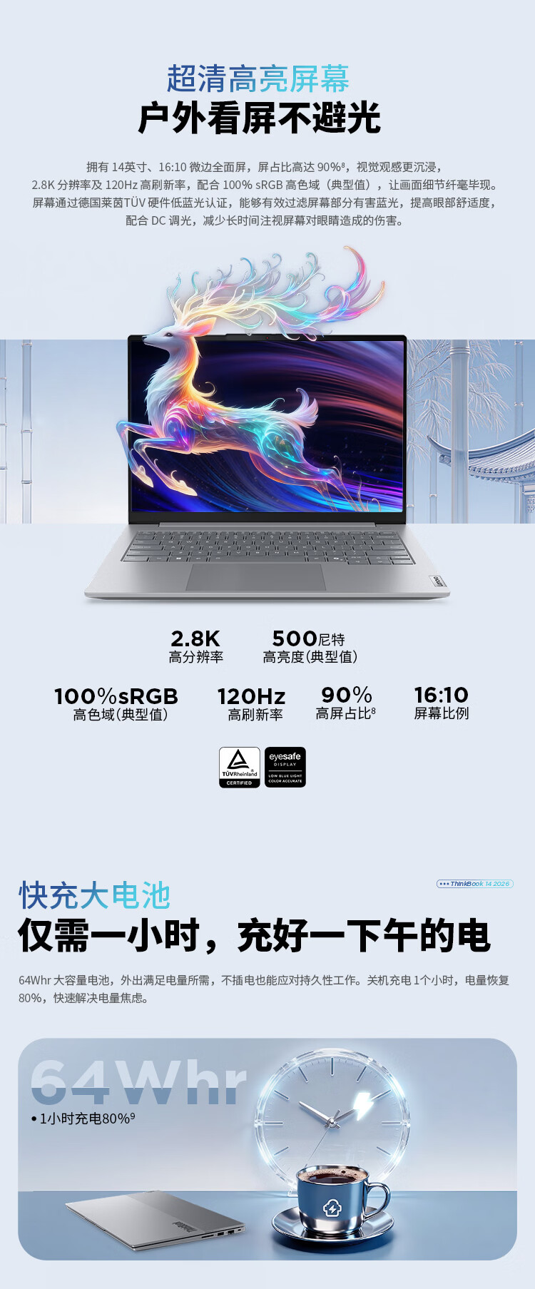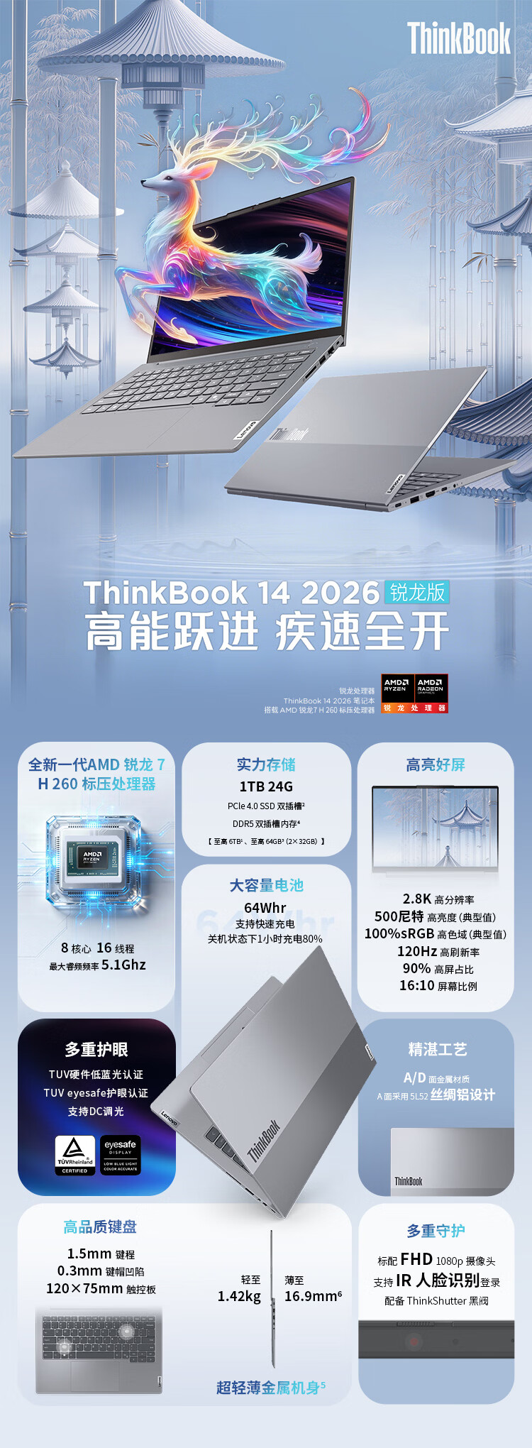 ThinkPad【国家补贴15%】联想笔记本电脑ThinkBook 14 2026锐龙AI全能本R7 H 260 14英寸24G 1T 2.8K高刷屏