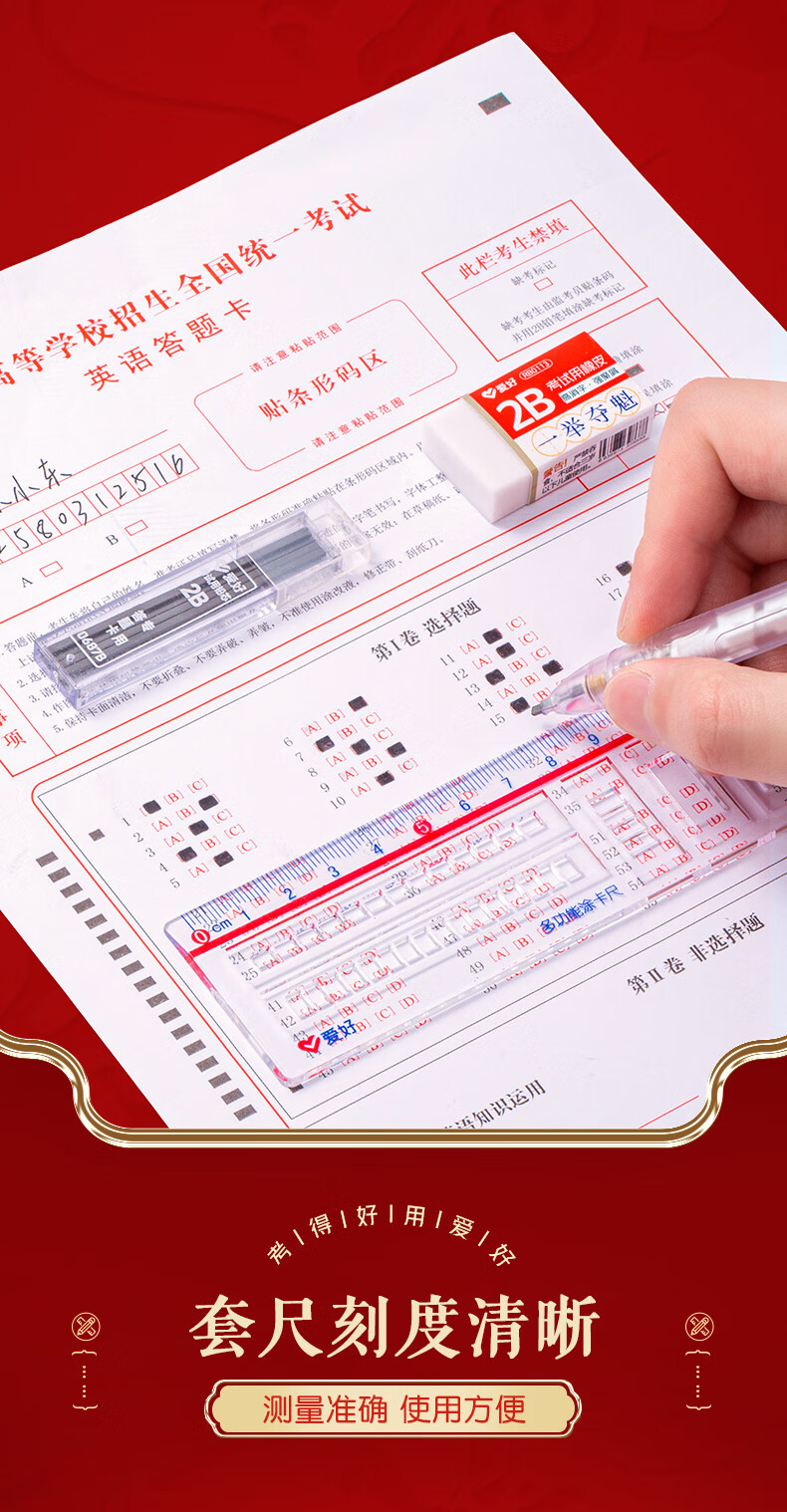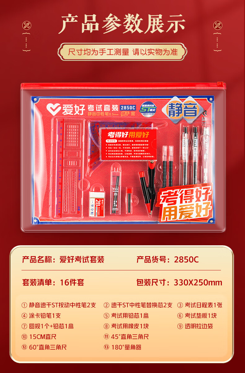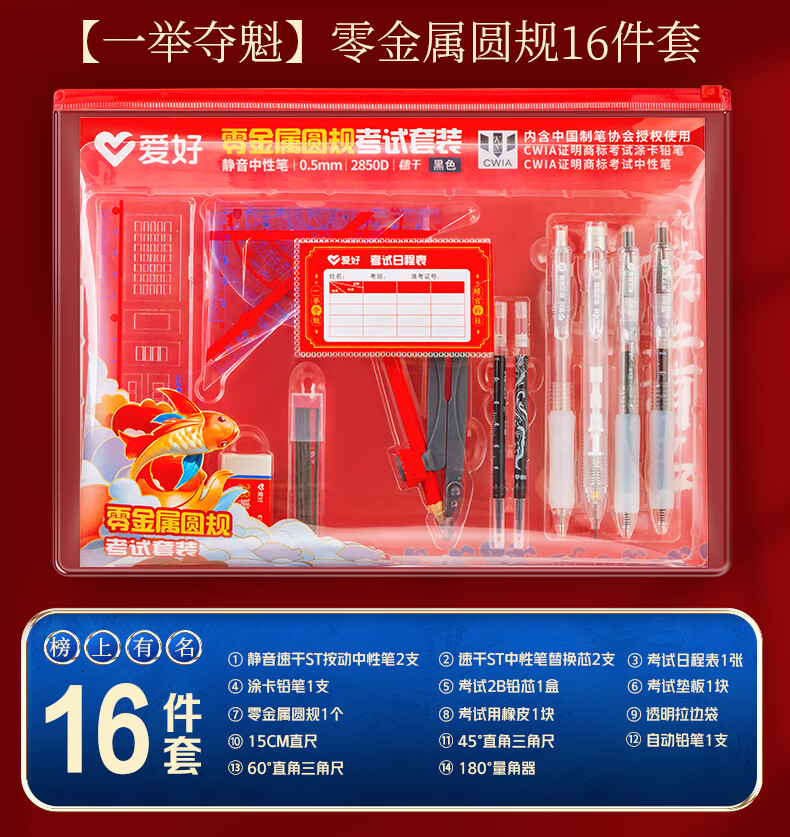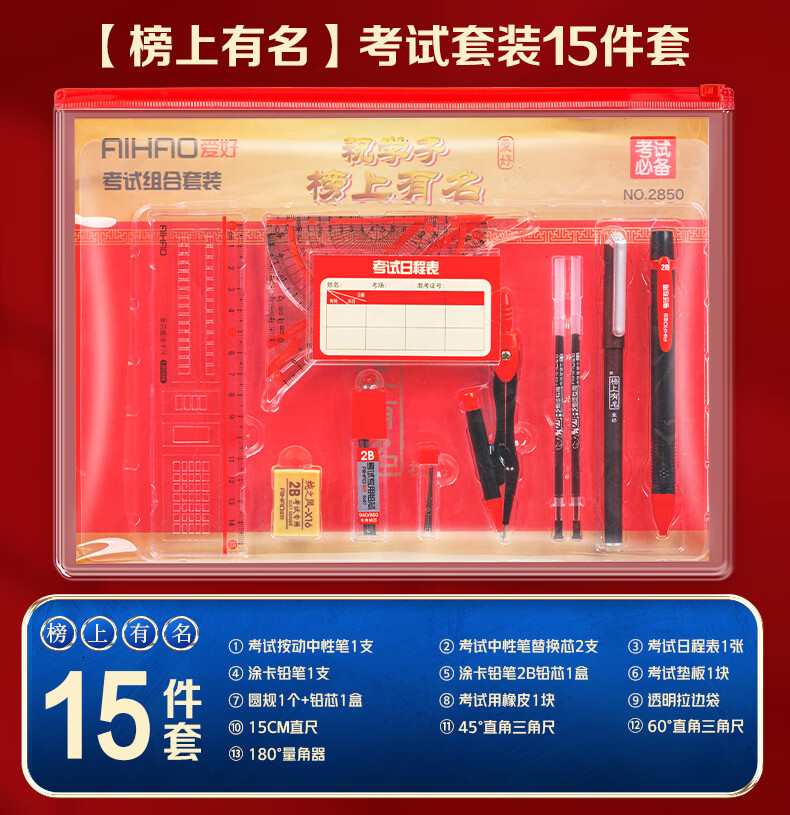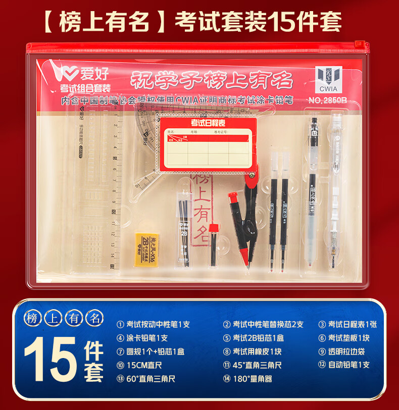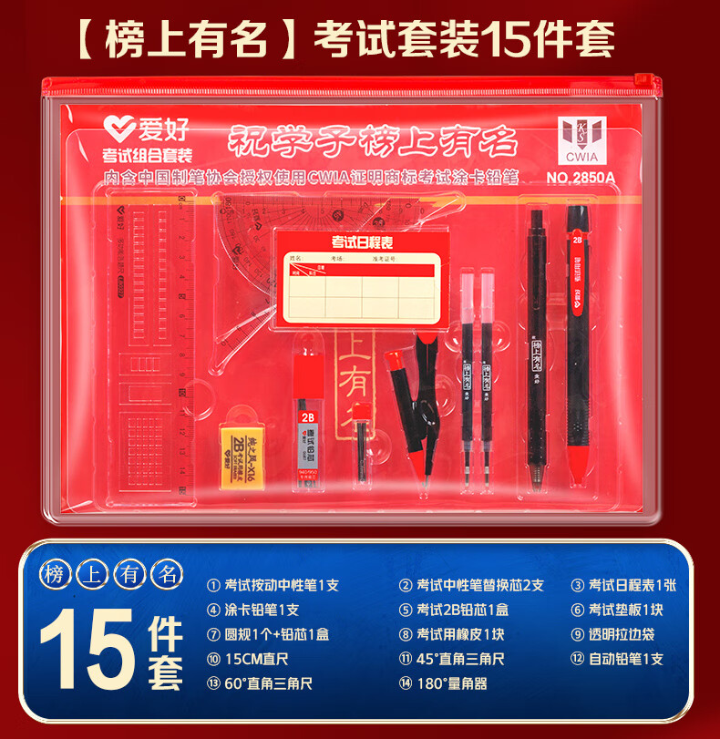 爱好(AIHAO)中高考文具16件套学生考试考研专用套装2B涂卡铅笔+套尺+橡皮+静音中性笔 2850 C【一举夺魁】静音考试16件套