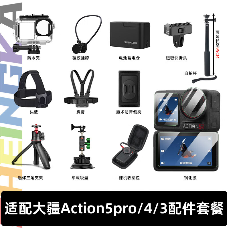 sheingka适配大疆Action6/5pro/4运动相机原装头戴挂脖支架自拍杆配件套餐套装机身收纳包便携保护盒防摔 Action6/5/5pro/4/3进阶套餐6