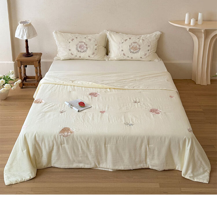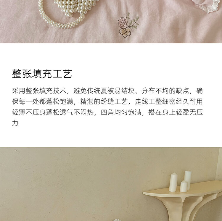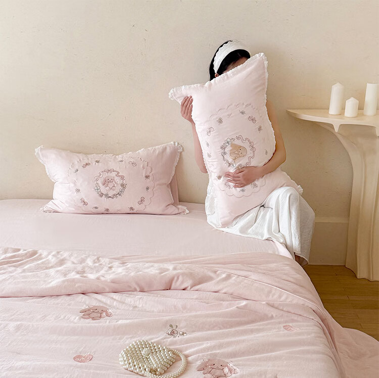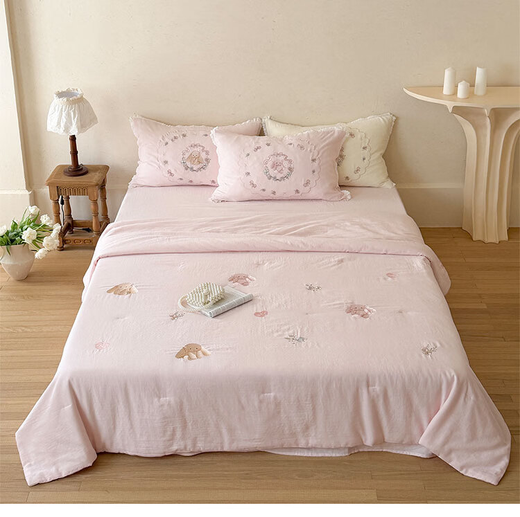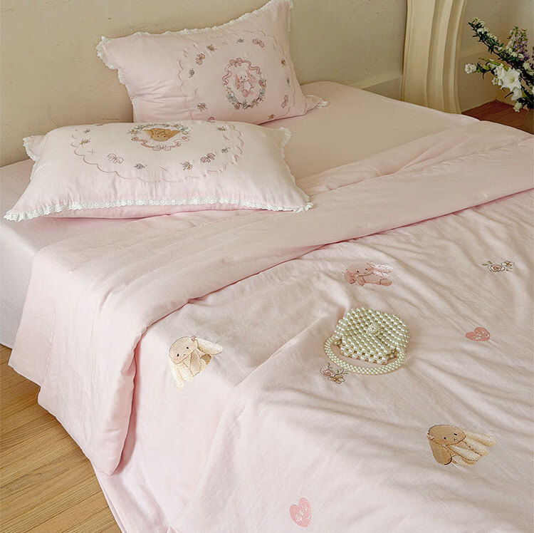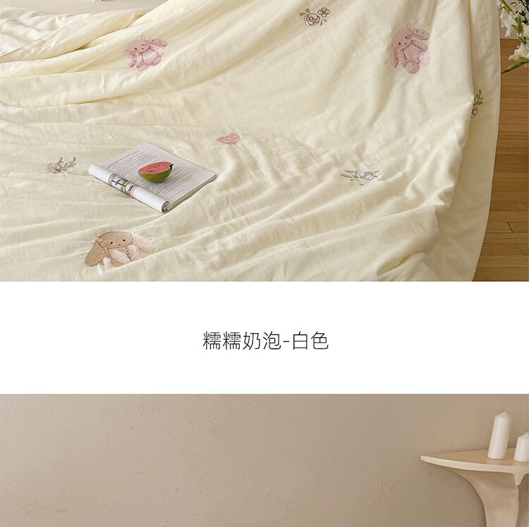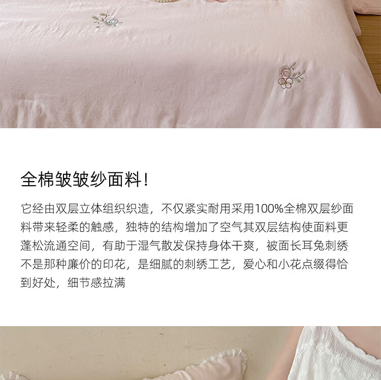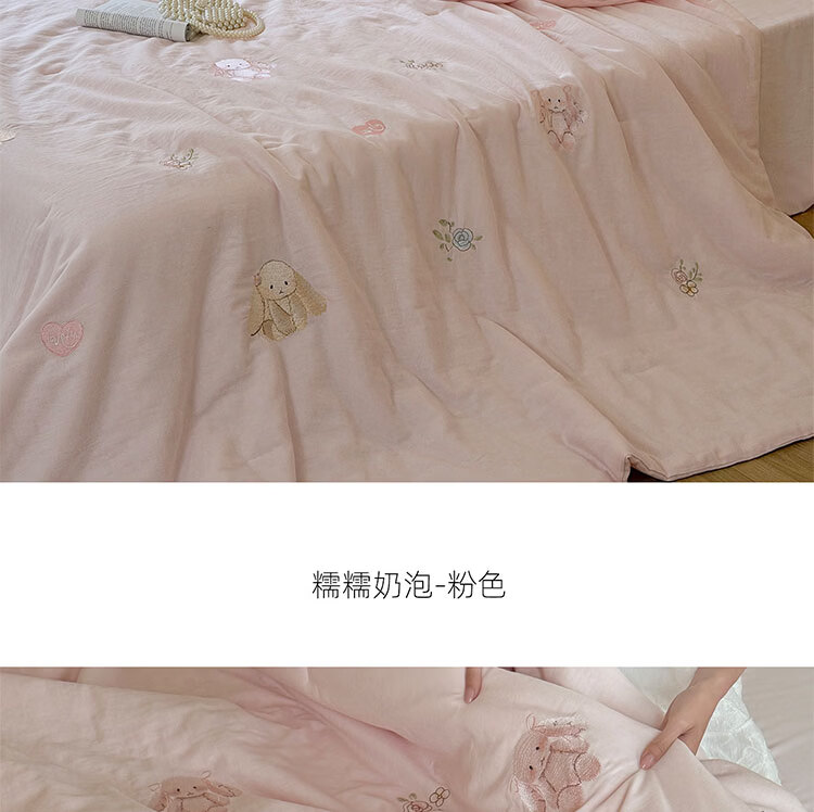 ROLAND LIVE全棉皱皱纱刺绣夏被小清新风空调被亲肤透气夏季薄被子夏被四件套 LB 全棉皱皱纱夏被-糯糯奶泡粉色 单夏被200cm*230cm