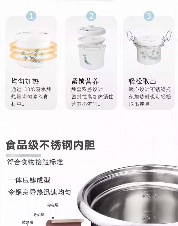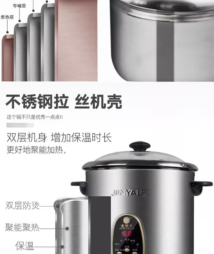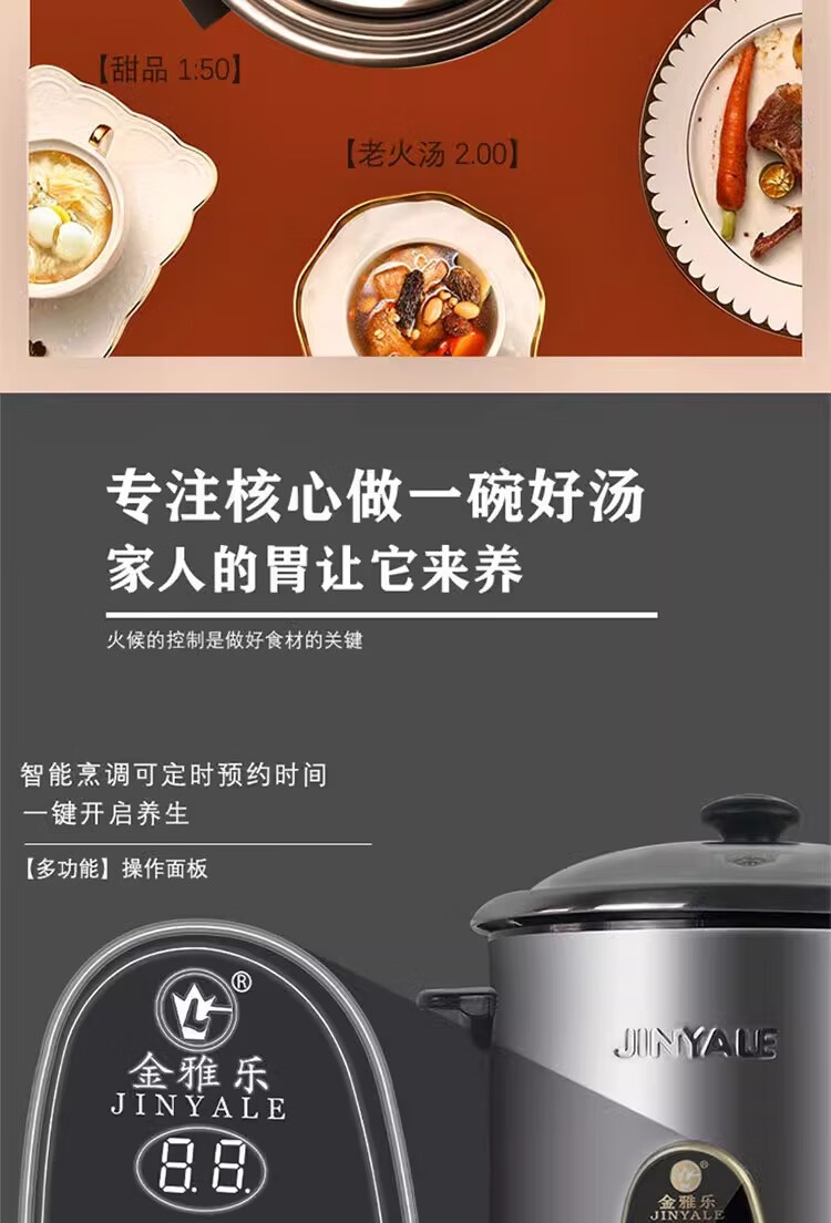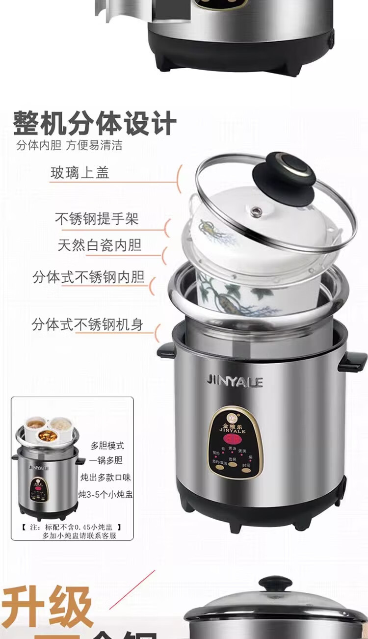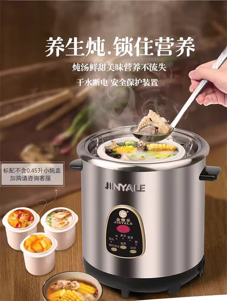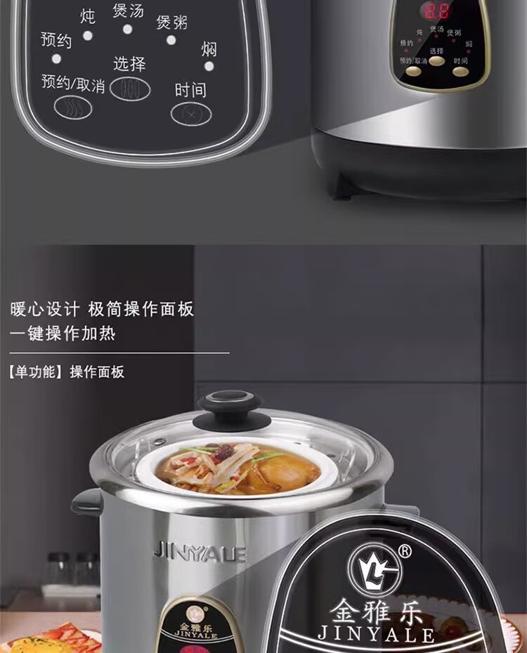 金雅乐电炖煲不锈钢煲汤煮粥锅陶瓷隔水炖锅家用商用大容量全自动 全钢多功能 6L 配2.5L炖盅/适3-5人