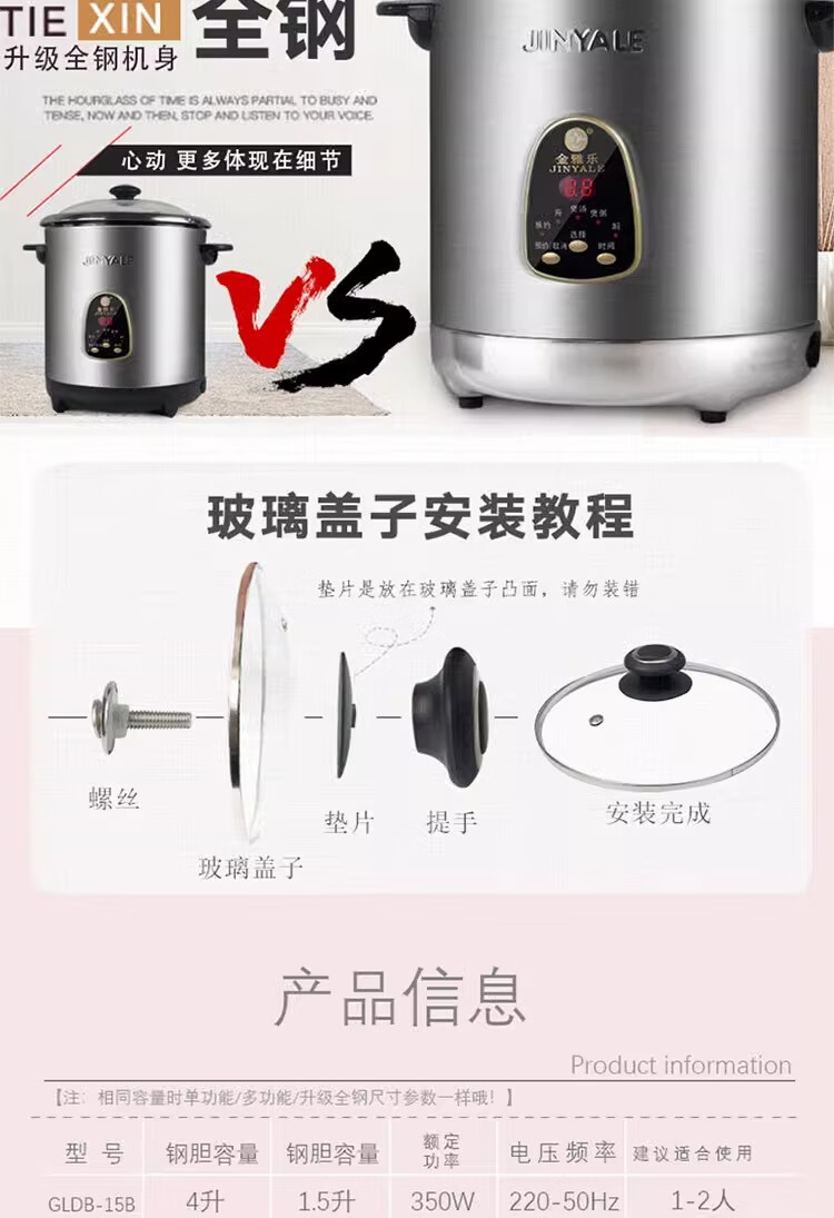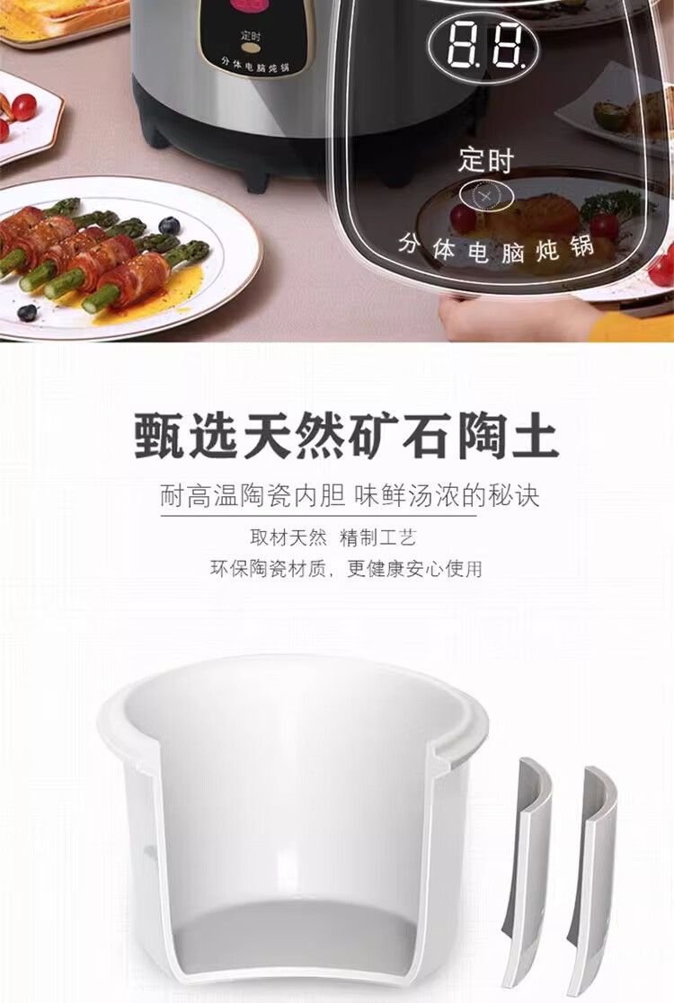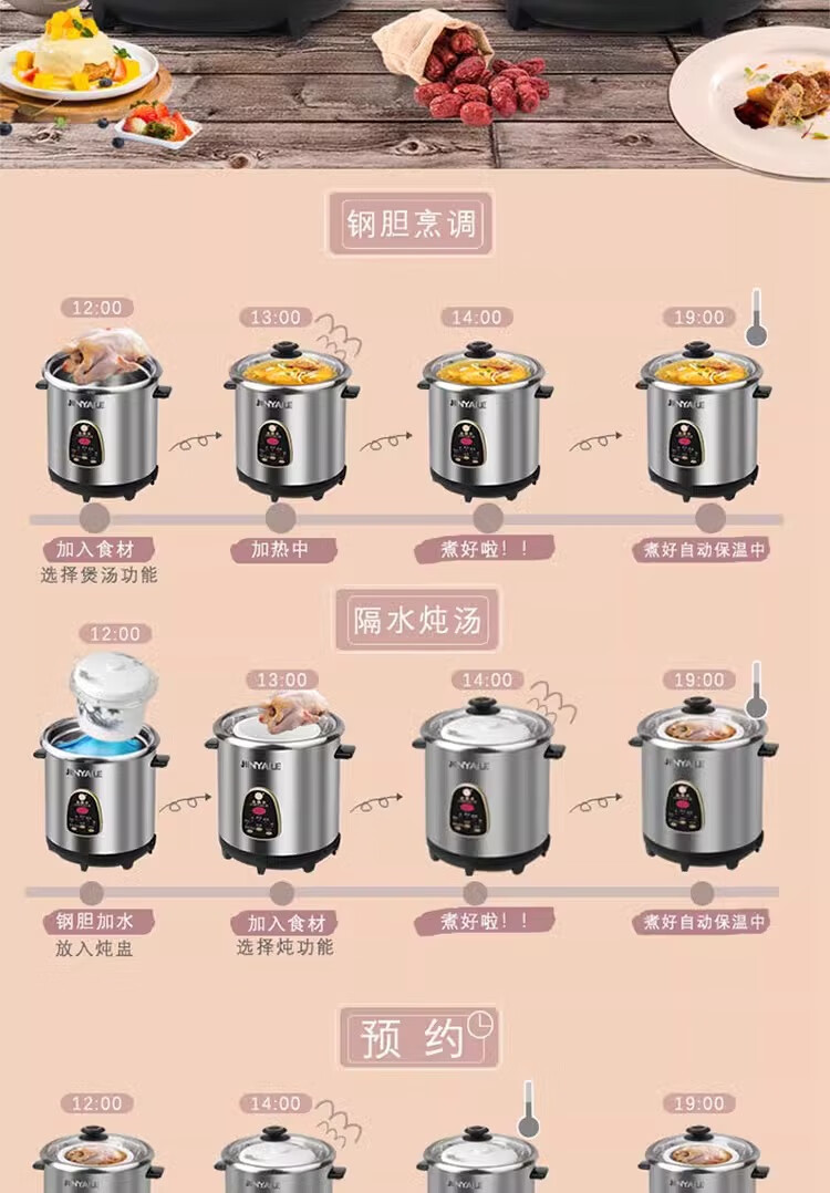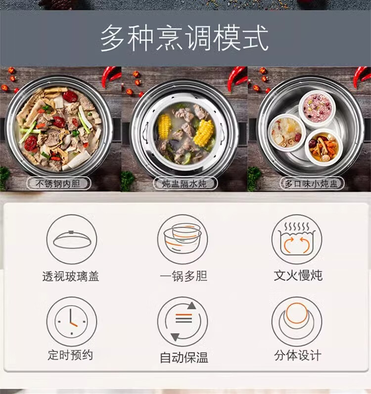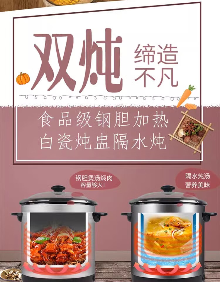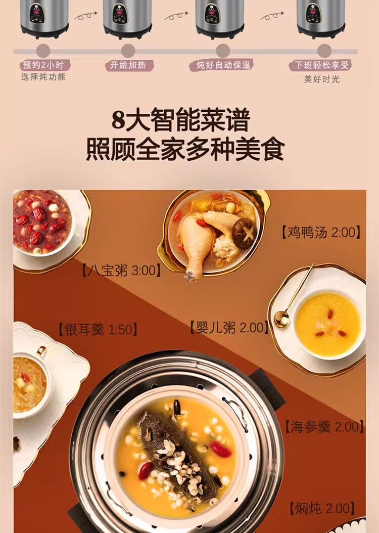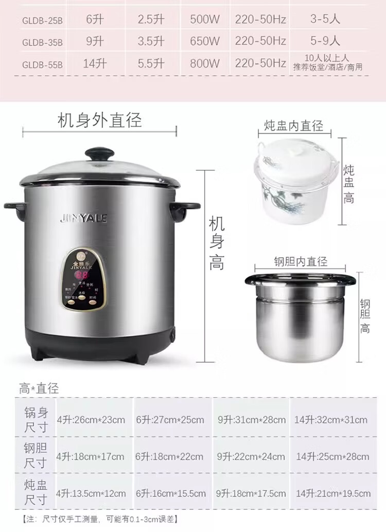 金雅乐电炖煲不锈钢煲汤煮粥锅陶瓷隔水炖锅家用商用大容量全自动 全钢多功能 6L 配2.5L炖盅/适3-5人