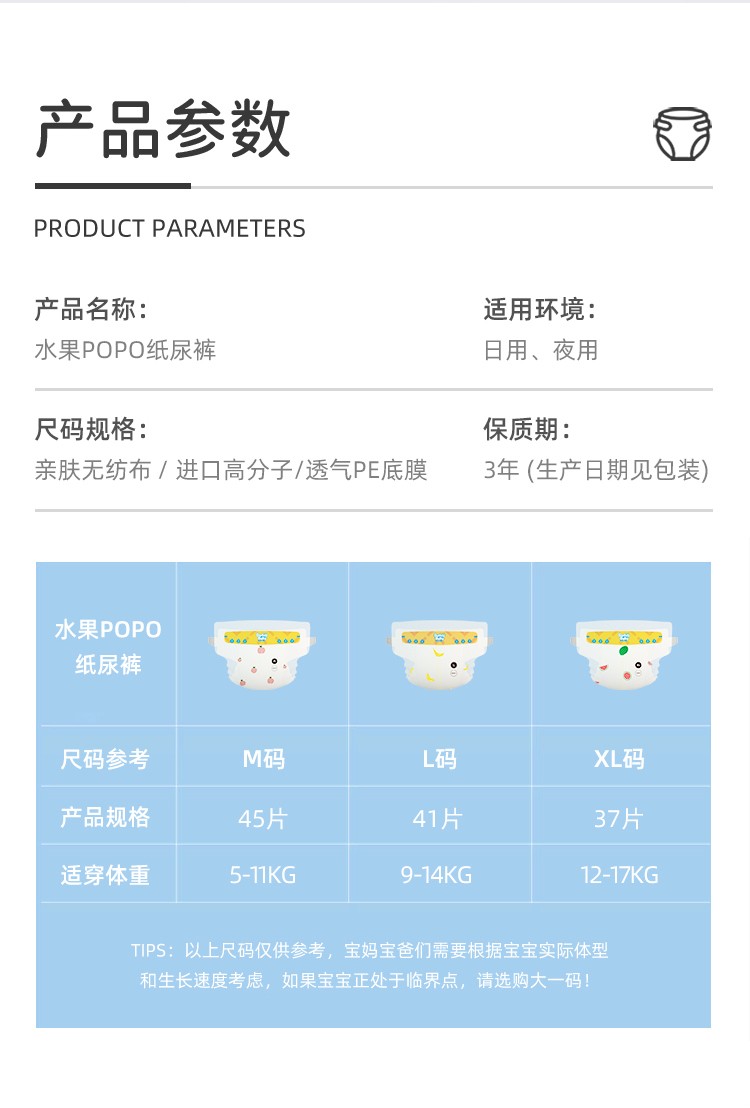 爹地宝贝 水果POPO纸尿裤 果萃弱酸呵护宝宝 XL74片