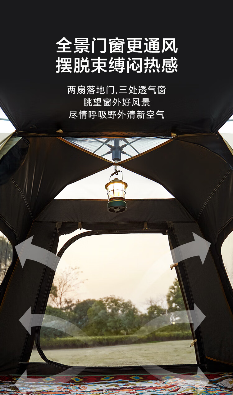 京东京造六角速开帐篷4.68㎡黑胶防晒户外露营公园帐篷加大空间4-5人