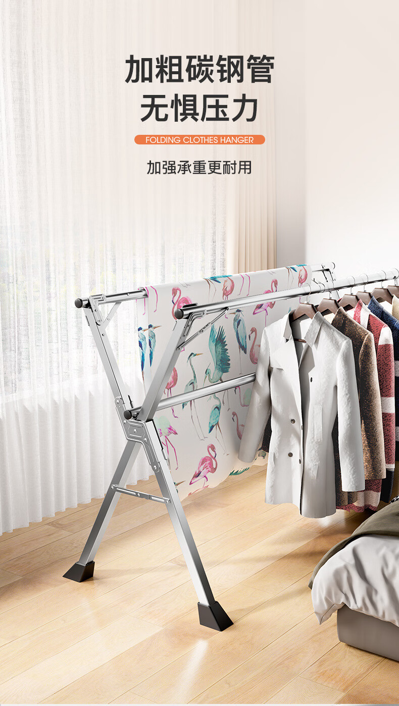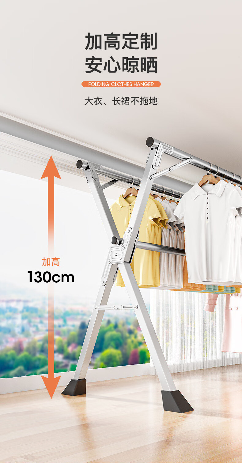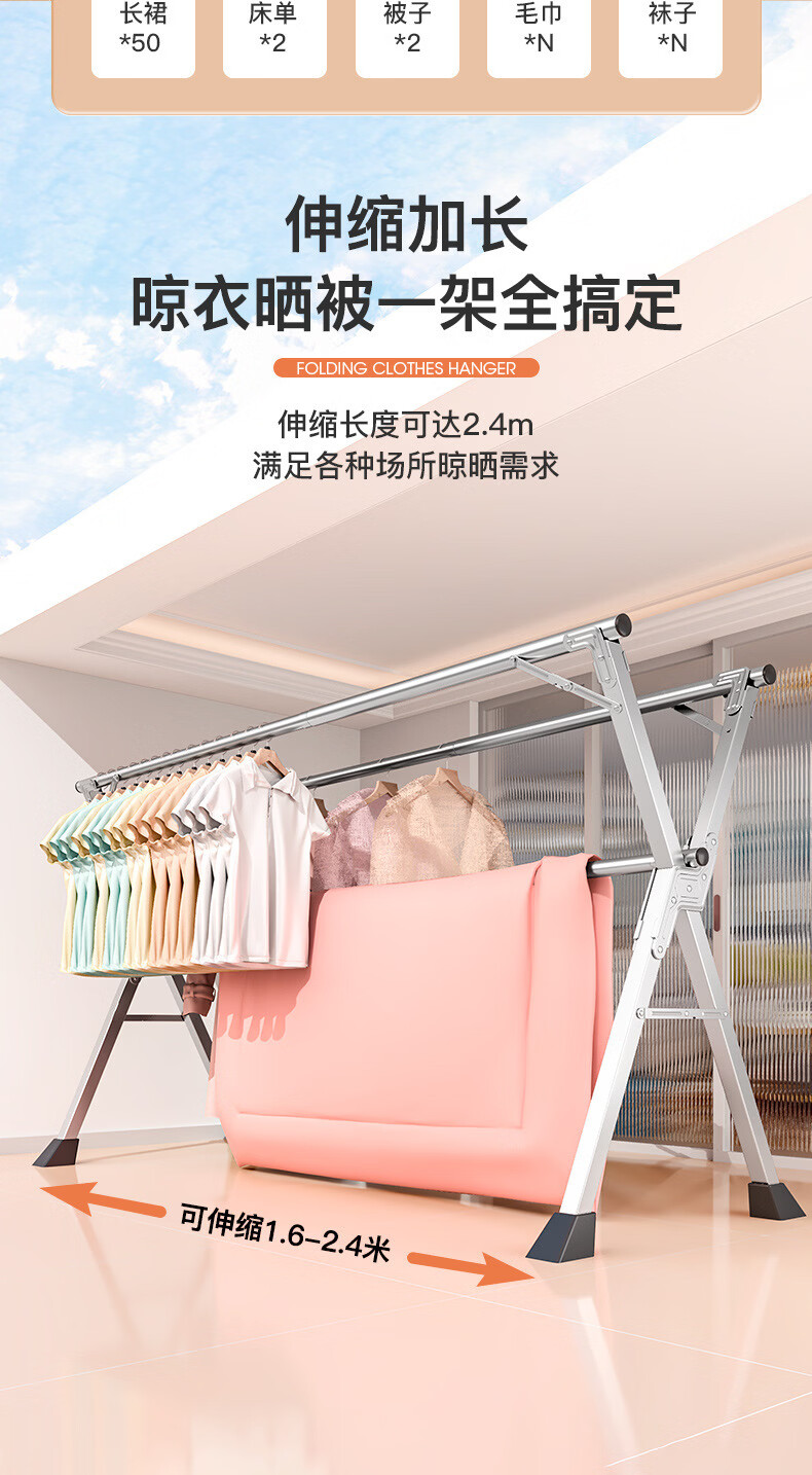 落地晾衣架家用宿舍伸缩折叠加厚室内外阳台卧室不锈钢 加粗加厚双杆1.6米可伸缩+20风钩