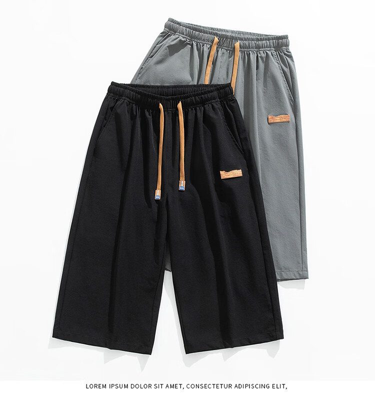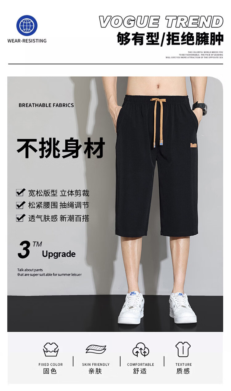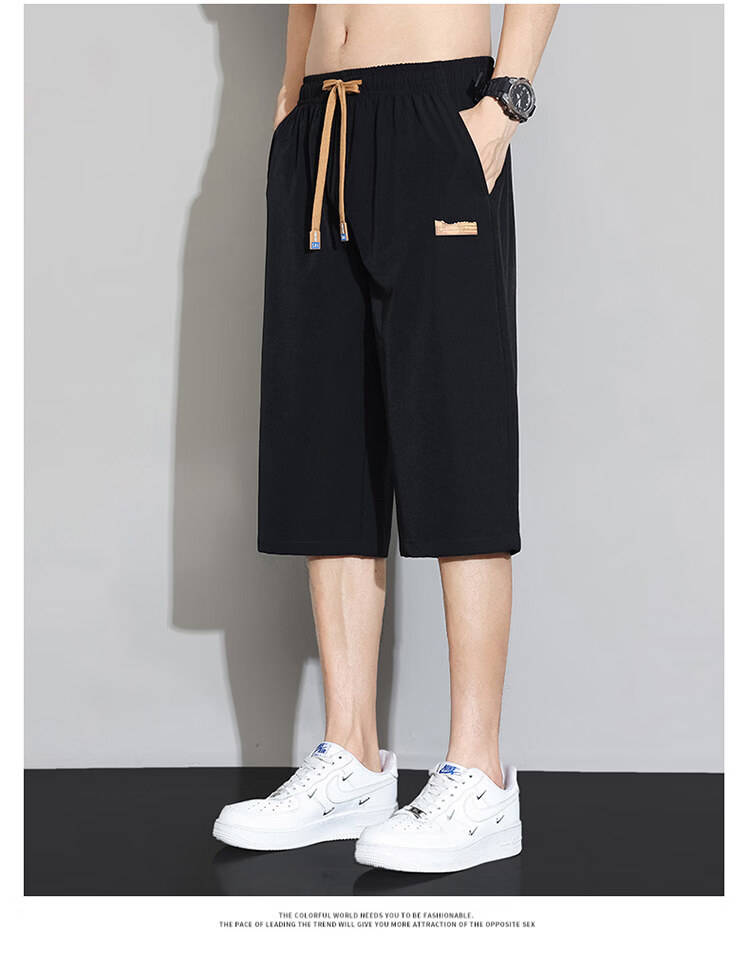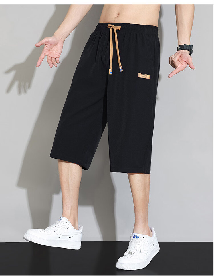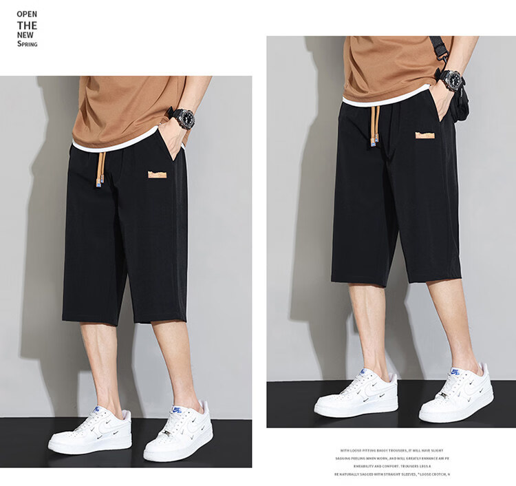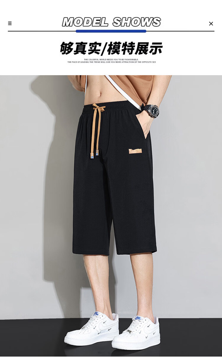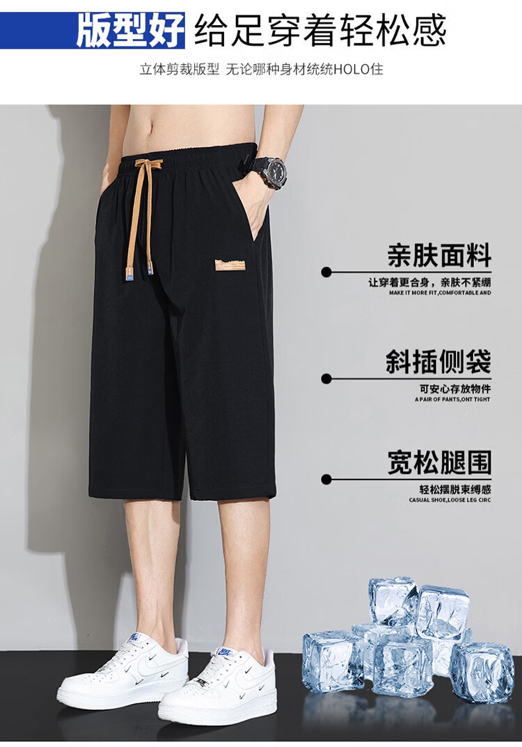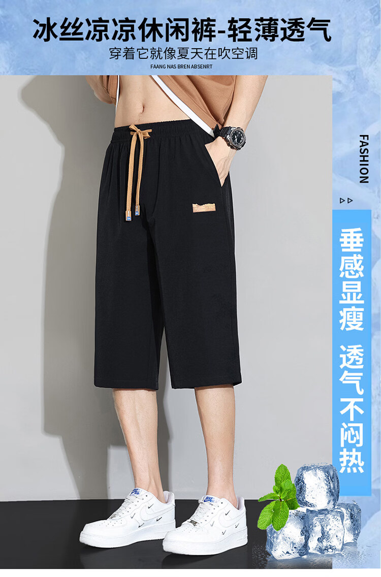 猫人(MiiOW)冰丝速干七分裤子男士夏季薄款外穿直筒马裤中裤宽松休闲运动短裤 720黑色 XL 【推荐120-135斤】