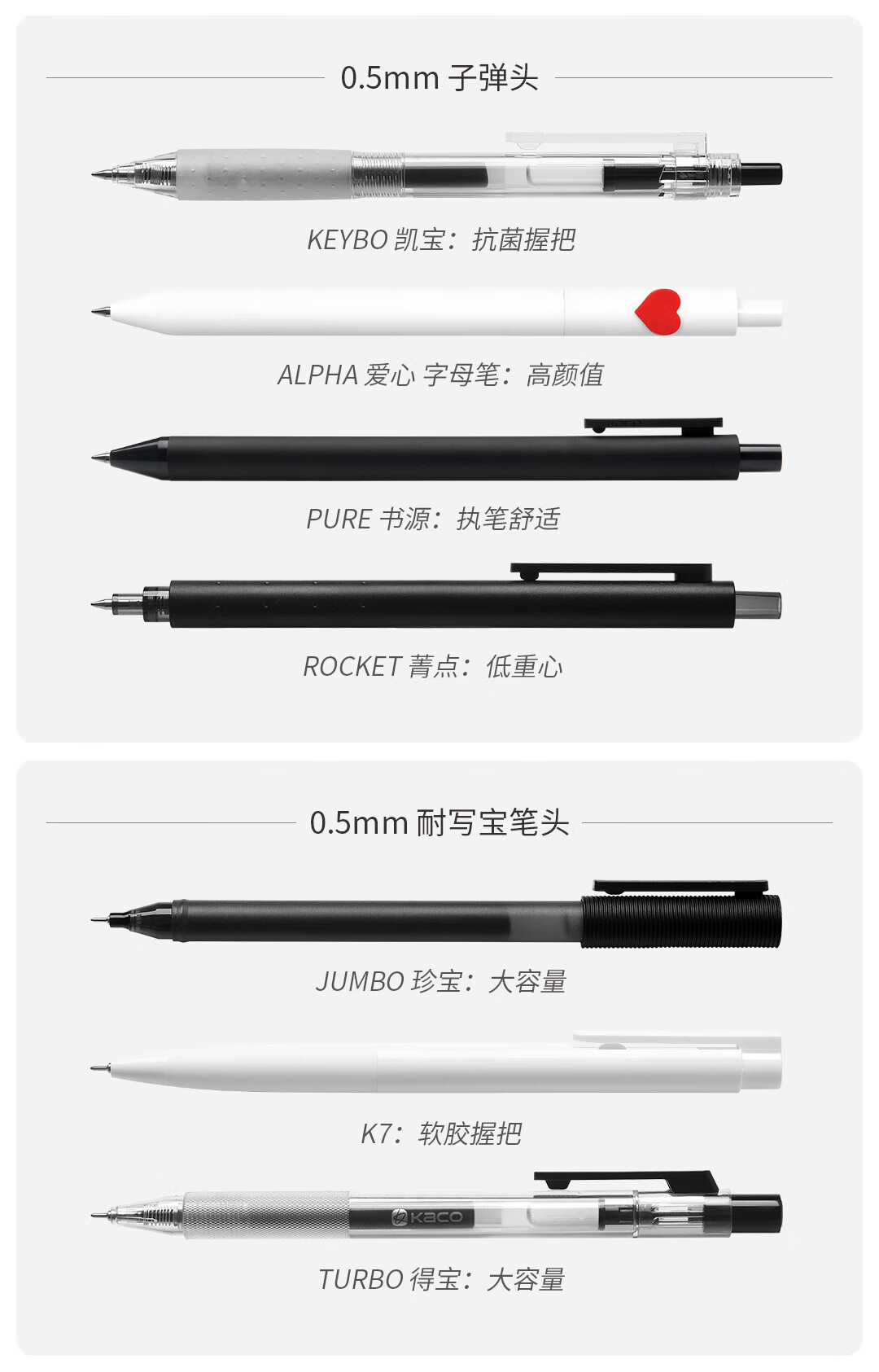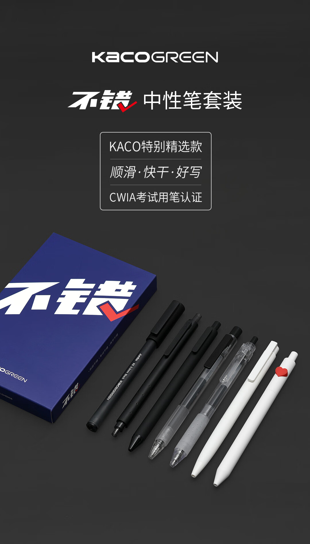KACO 不错中性笔套装0.5黑芯7支装 书源菁点凯宝珍宝得宝K7爱心字母笔组合学生考试刷题笔记文具 不错炫黑【6支】