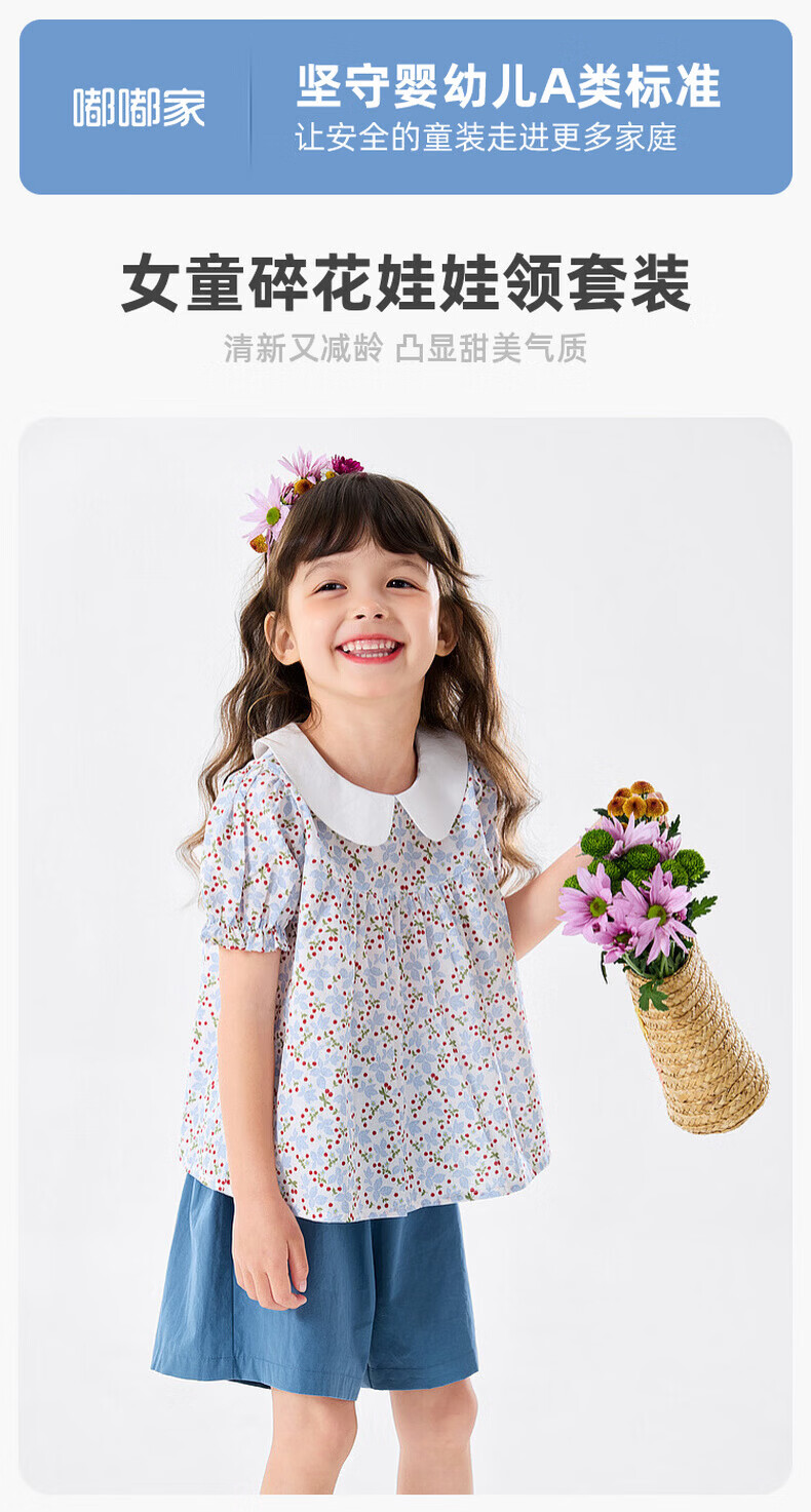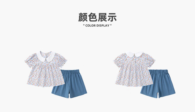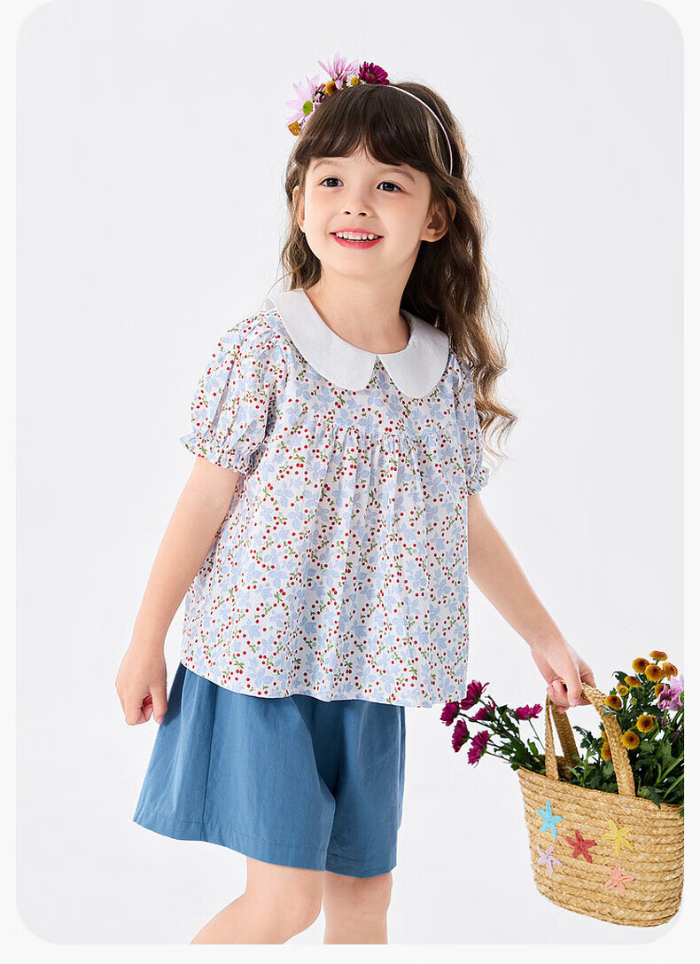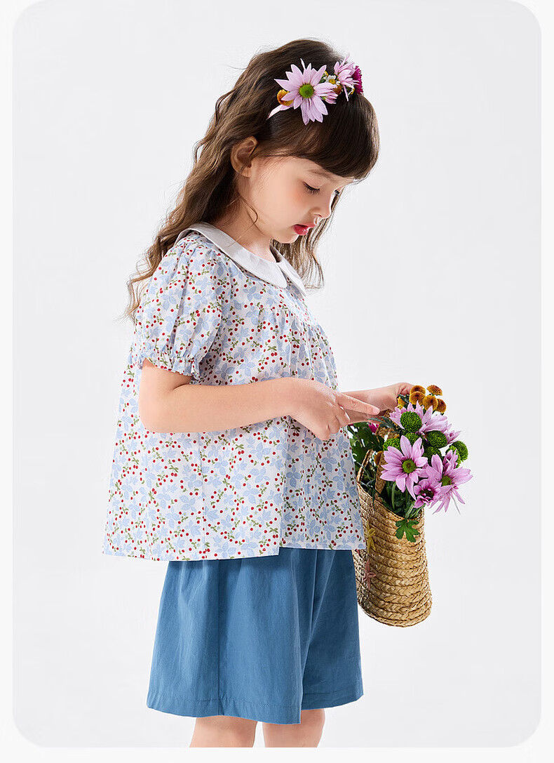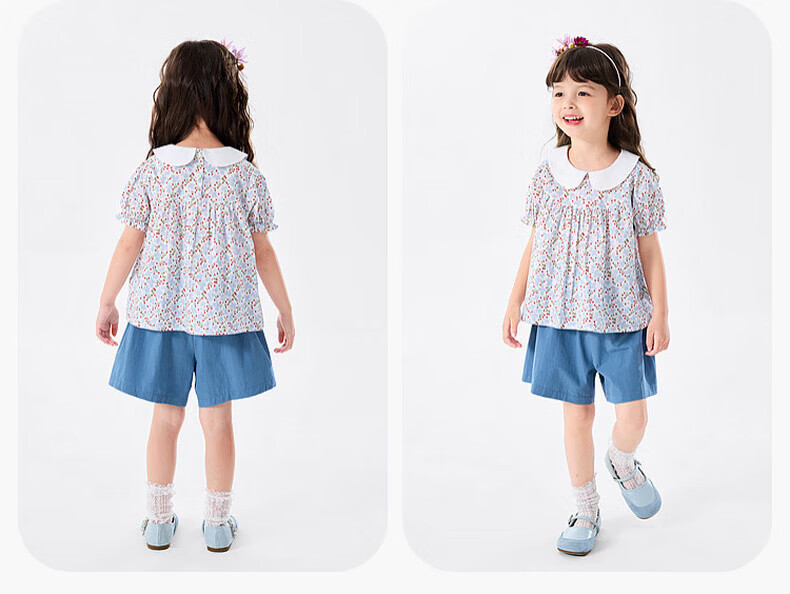 嘟嘟家【100%棉】女童森系套装女孩夏季纯棉短袖短裤女宝小碎花两件套潮 航线蓝 110