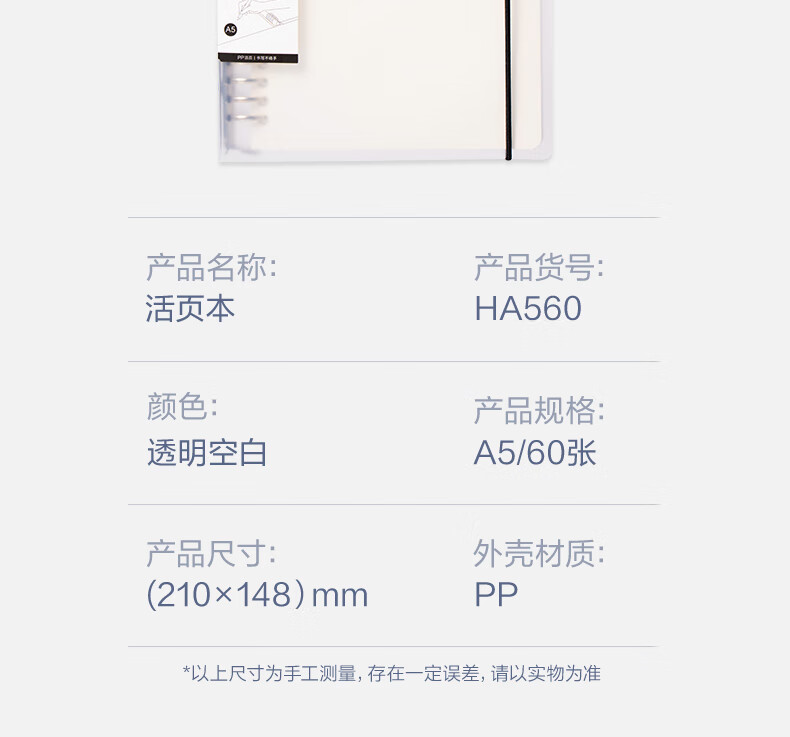 得力(deli)A5/60张活页本笔记本记事本子作业本可拆卸学生线圈本透明外壳空白内芯HA560