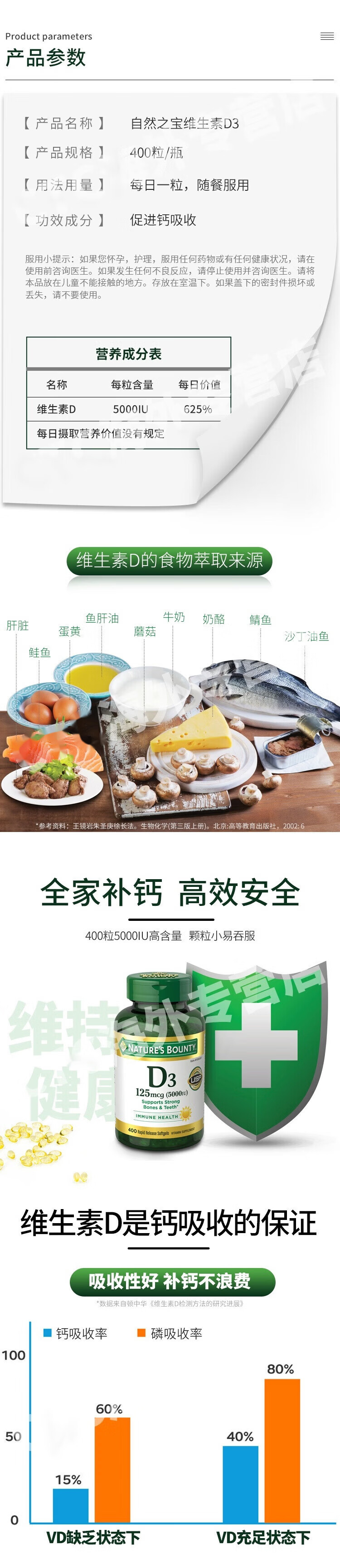 自然之宝(Nature's Bounty)维生素d3原装进口阳光瓶5000IU 成人中老年补钙促钙吸收 美国原装进口 400粒*1瓶