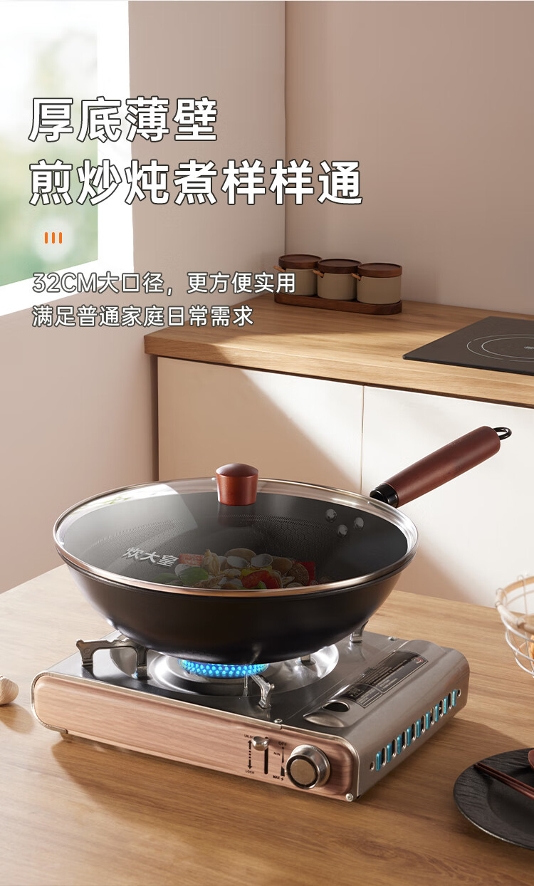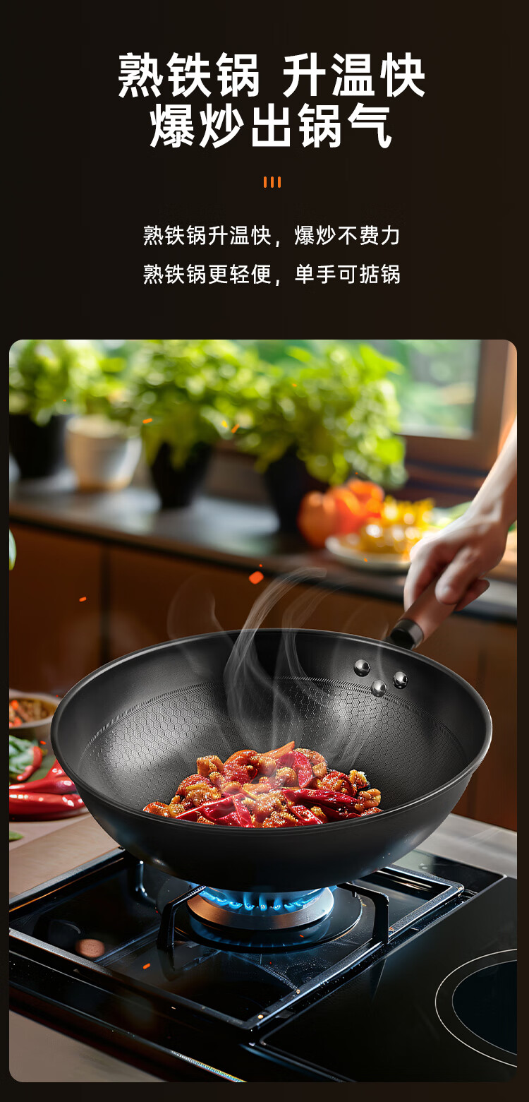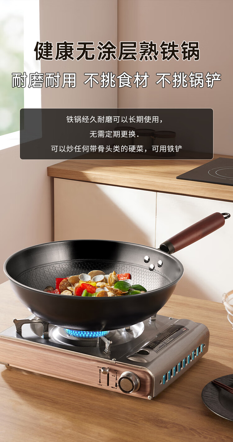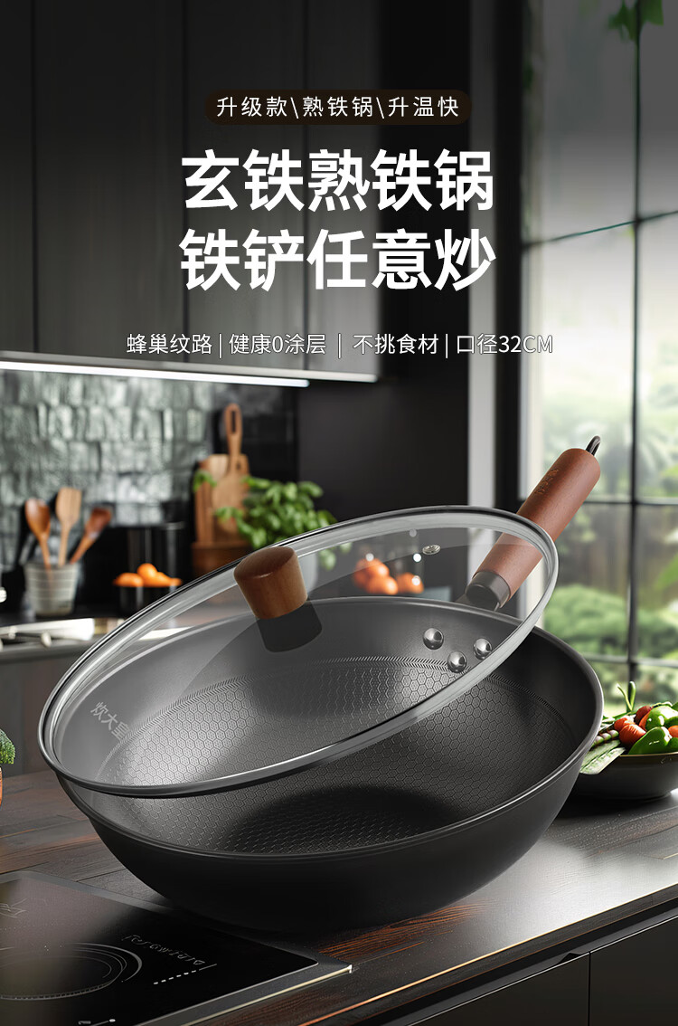 炊大皇炒锅铁锅健康0无涂层蜂窝纹32cm家用炒菜锅熟铁锅