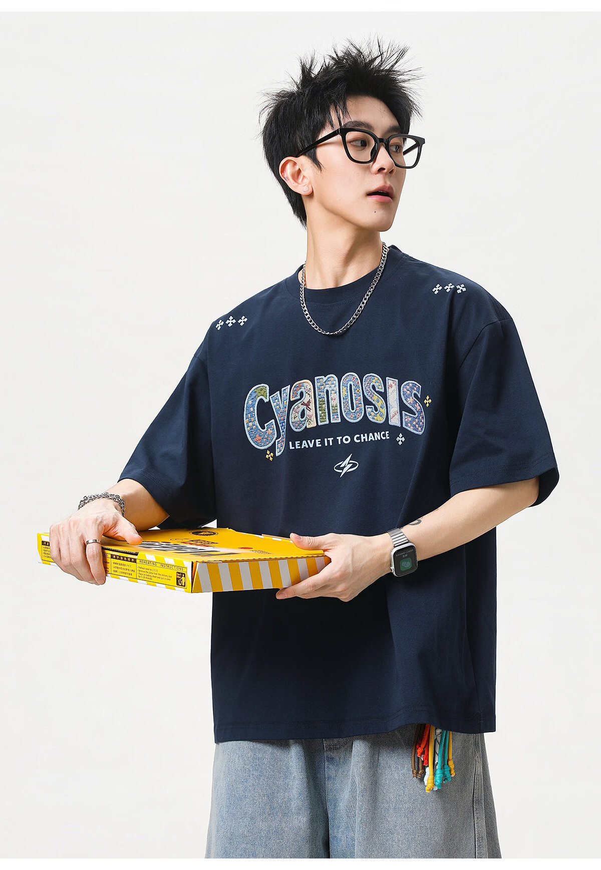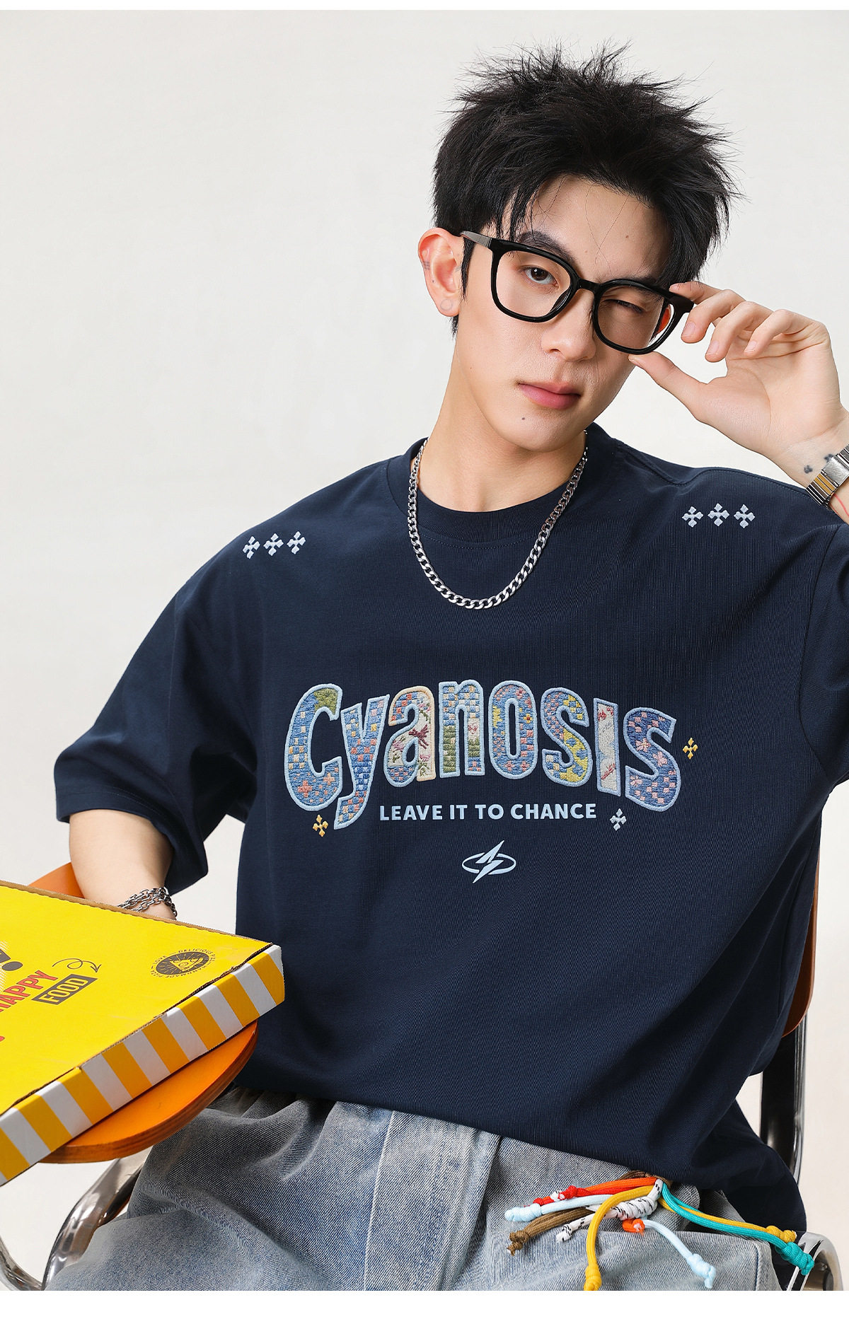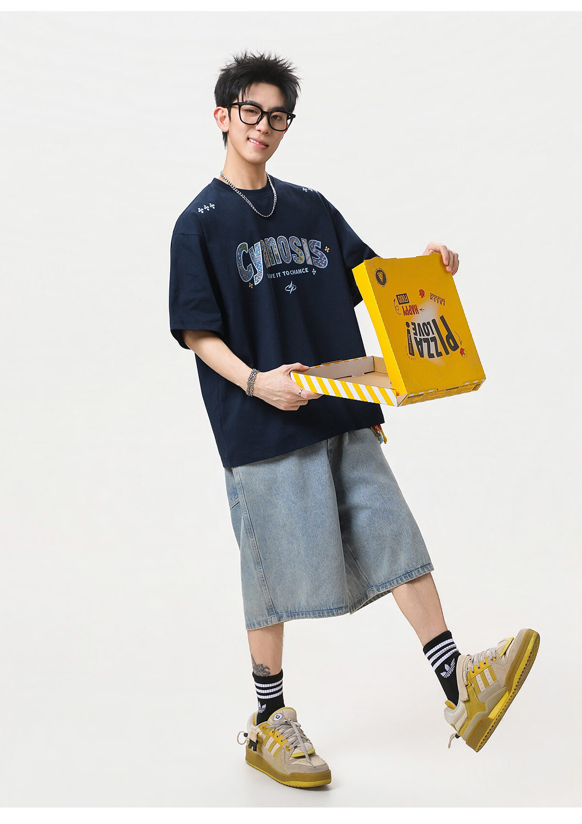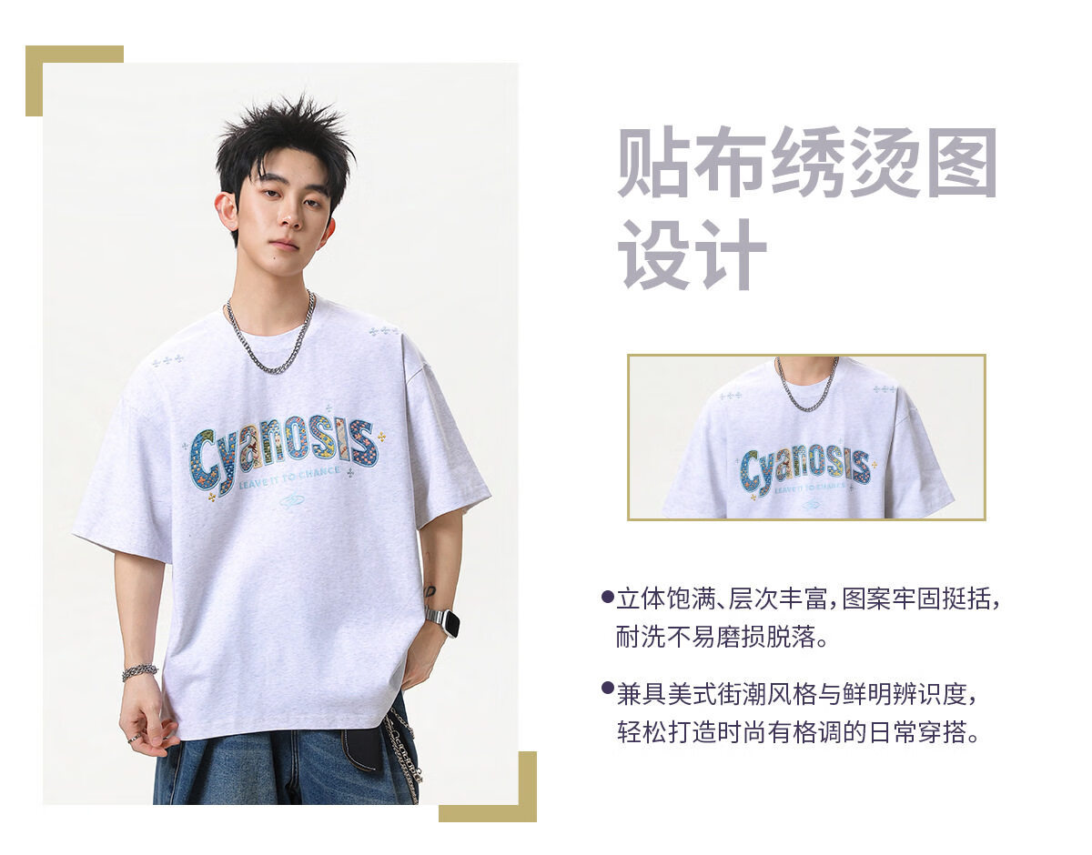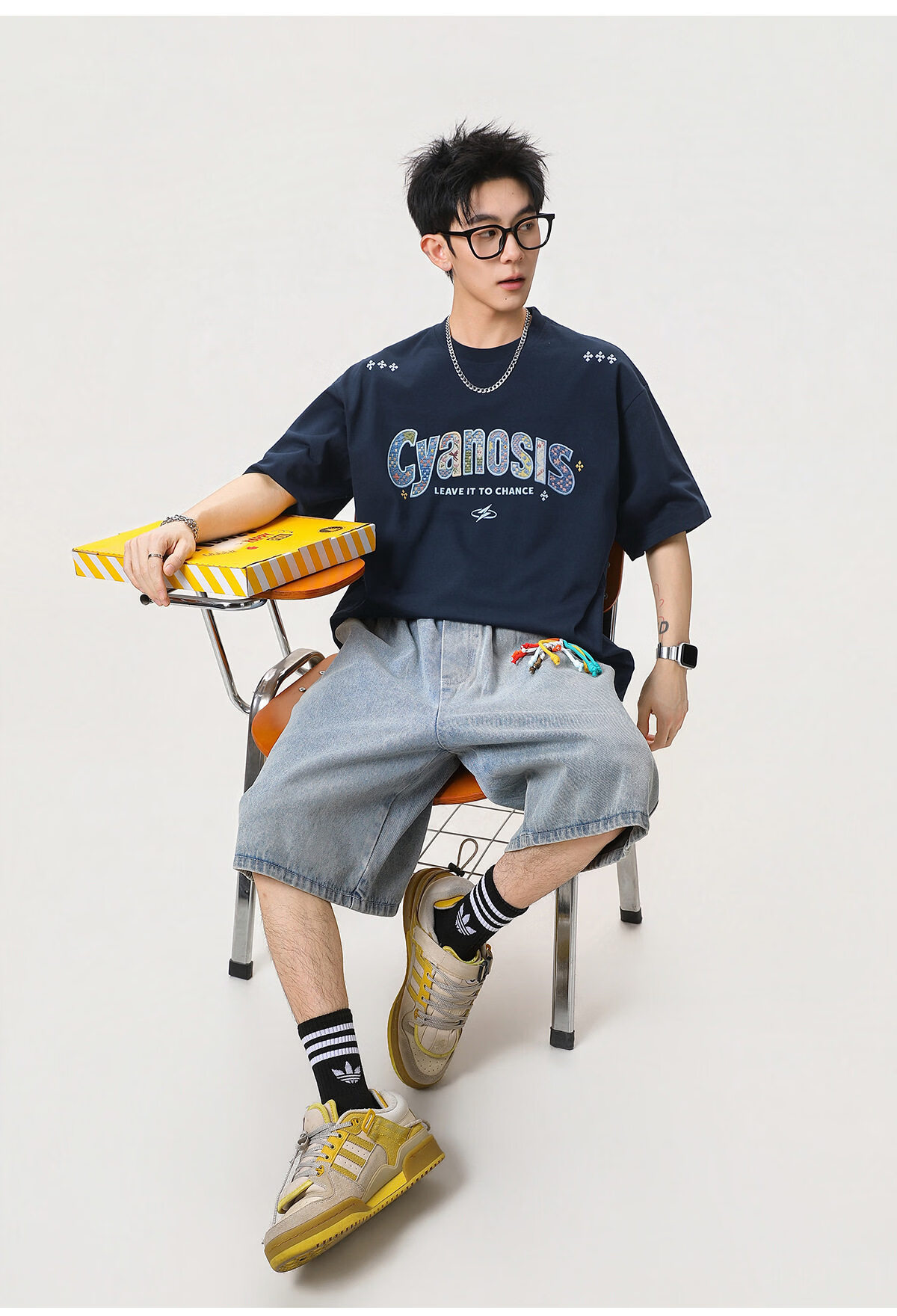NEW OR MODE美式高街字母圆领短袖t恤男夏季潮牌纯棉重磅宽松情侣五分袖T恤衫 藏青色【高品质】 M 【建议90-110斤】