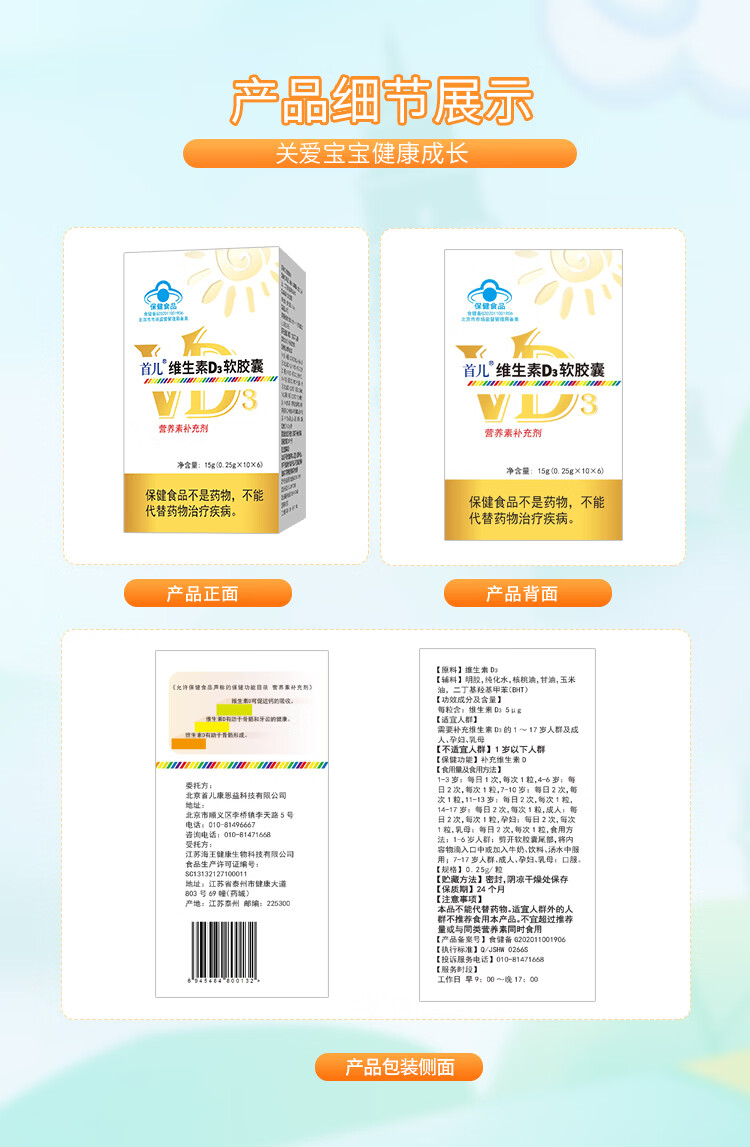 首儿维生素D3宝宝儿童补充维生素d60粒