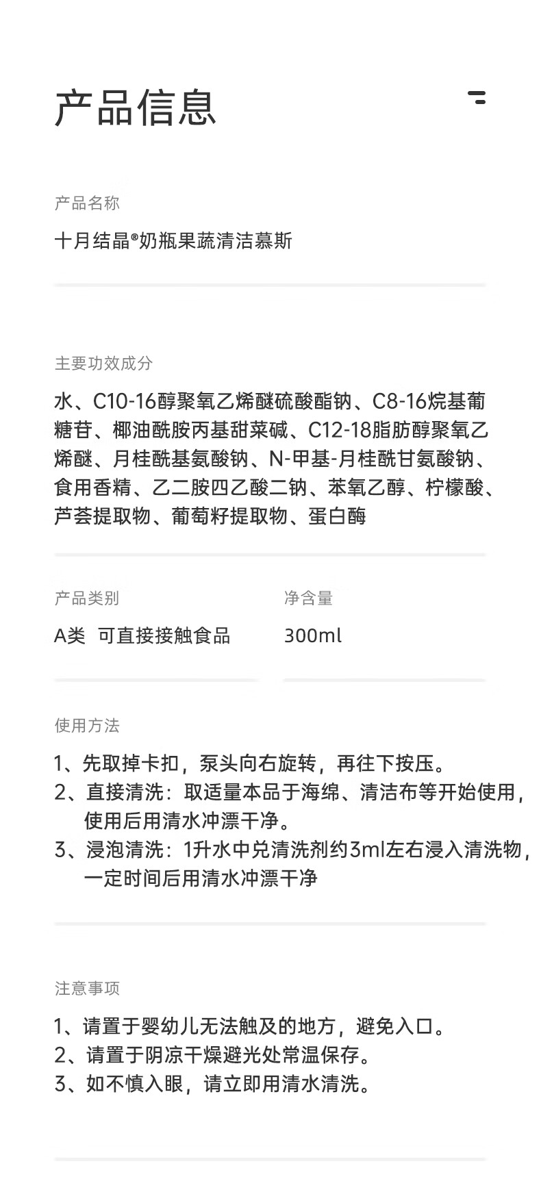 十月结晶奶瓶清洗剂 氨基酸果蔬清洗剂奶瓶奶嘴清洁慕斯300ml*2瓶