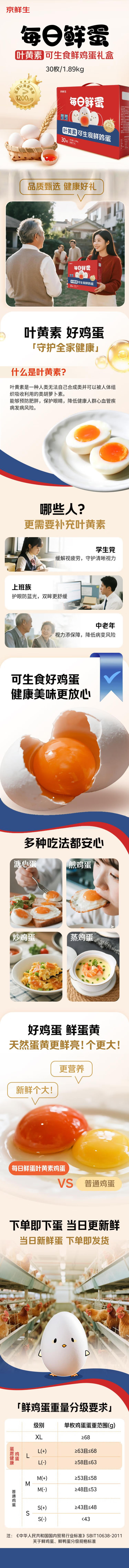 京鲜生【供港品质】【每日鲜蛋】叶黄素可生食鸡蛋30枚3.78斤/盒 礼盒