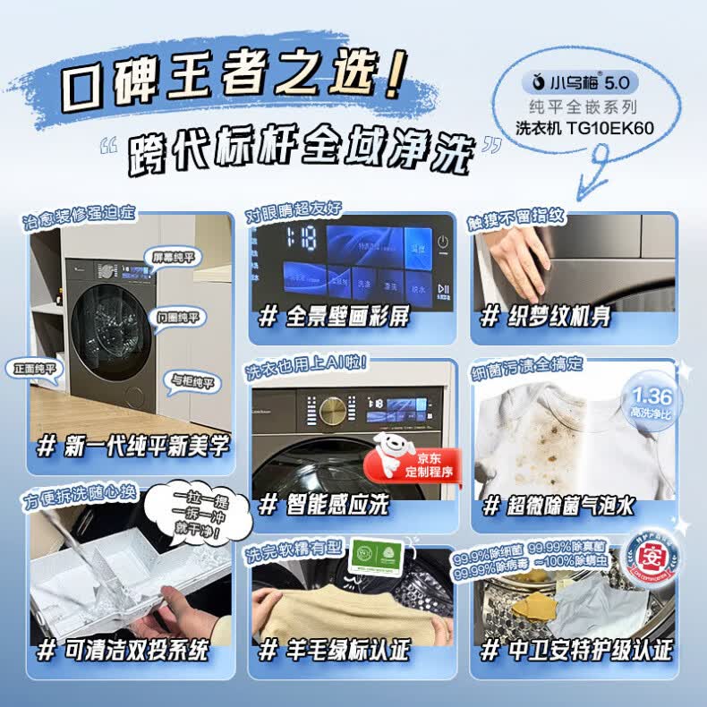 小天鹅(LittleSwan)小乌梅5.0跨代机皇 AWE同款 滚筒洗衣机全自动 10KG纯平全嵌 真1.36洗净比超微除菌气泡水以旧换新 【重磅新品】TG10EK60 滚筒