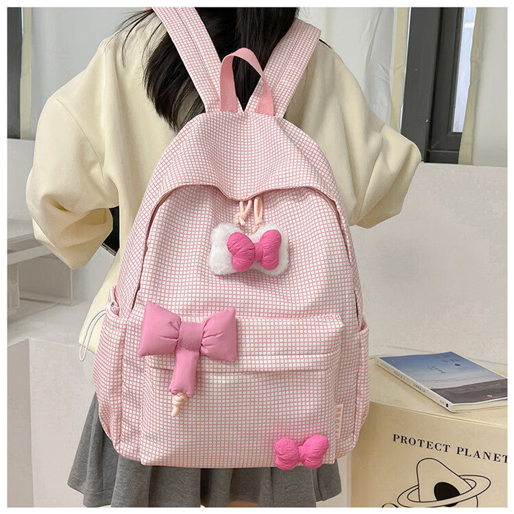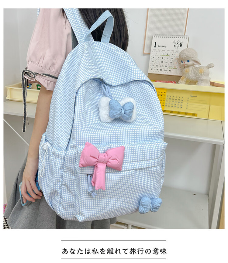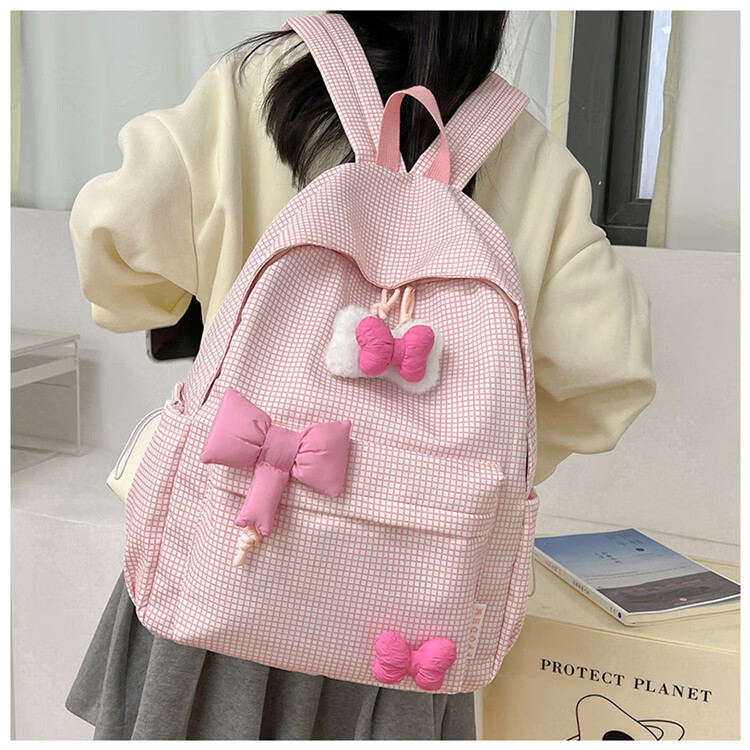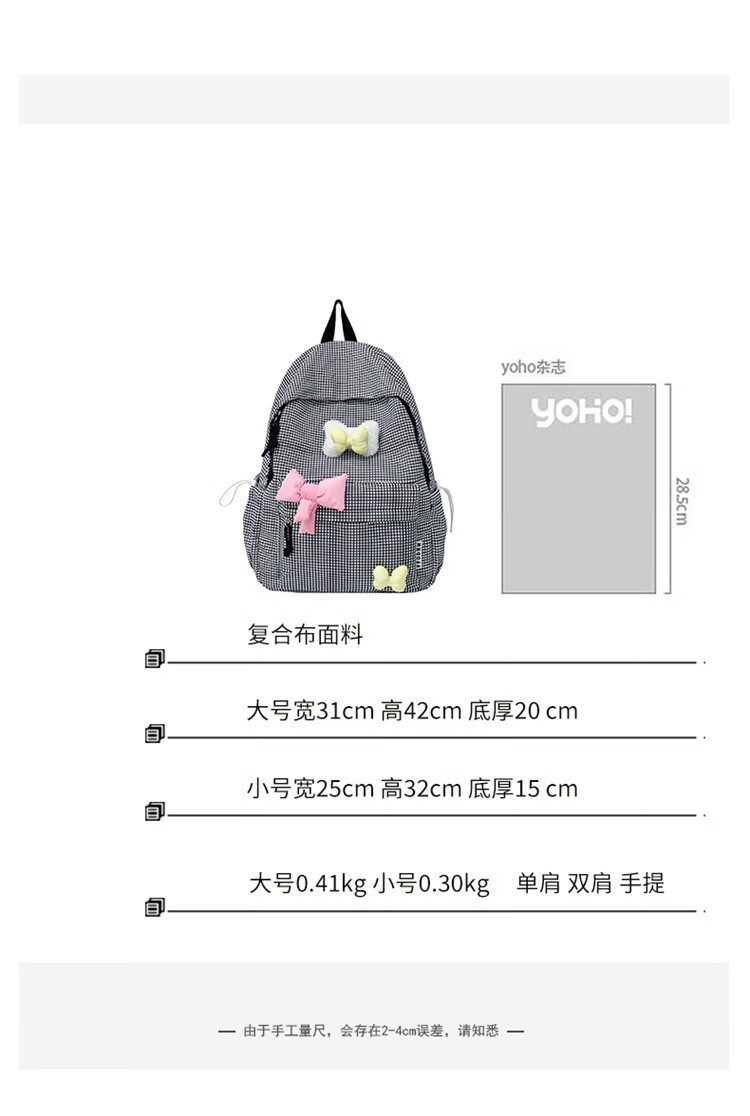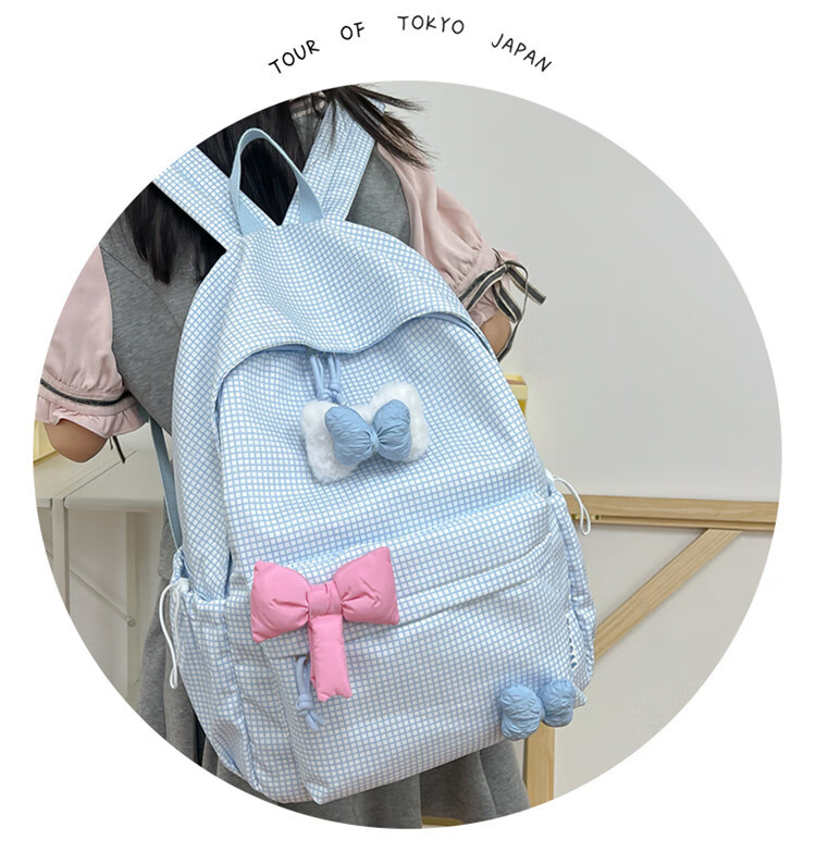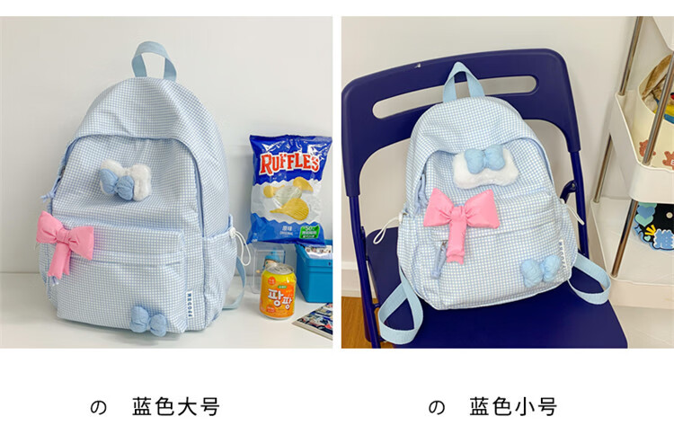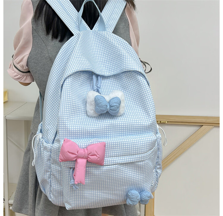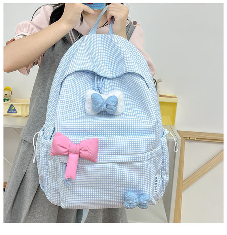 梵昇昱双肩包小清新格纹小学生书包初高中生可爱少女超轻减负出行背包 蓝色格纹双肩包【带蝴蝶结】小号