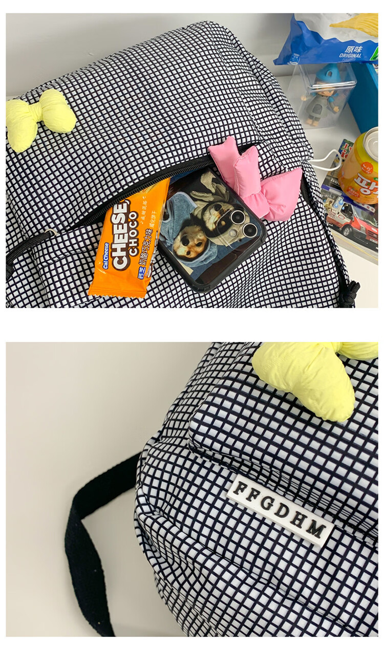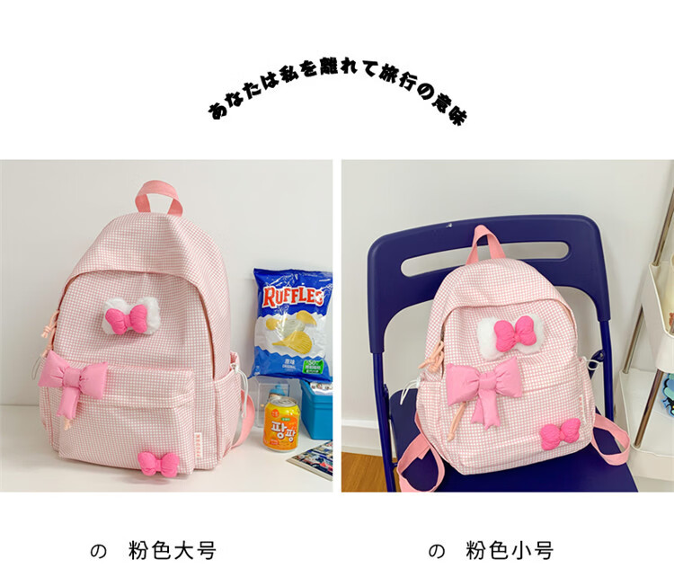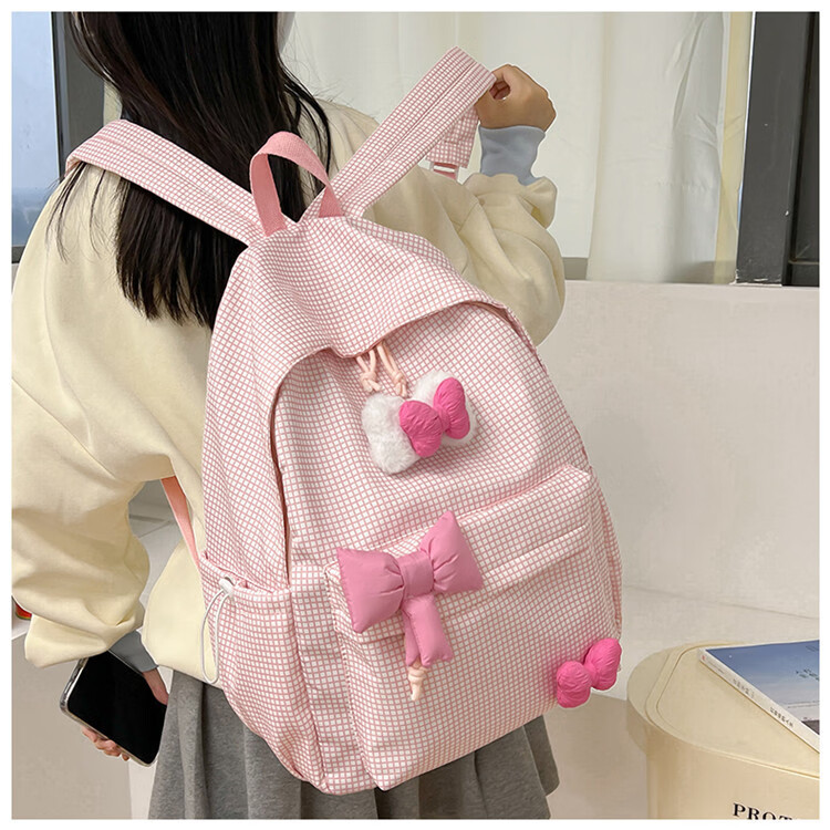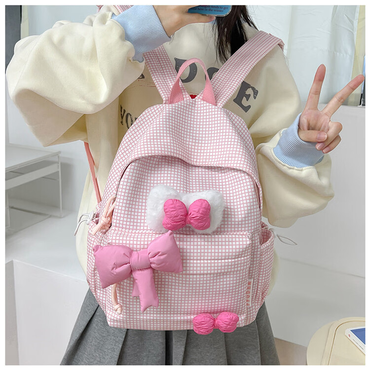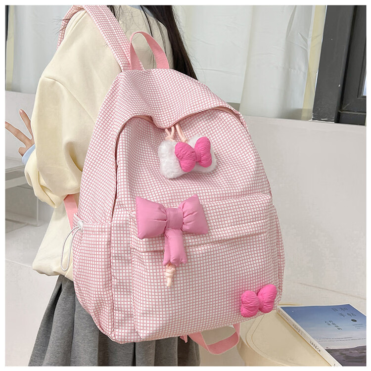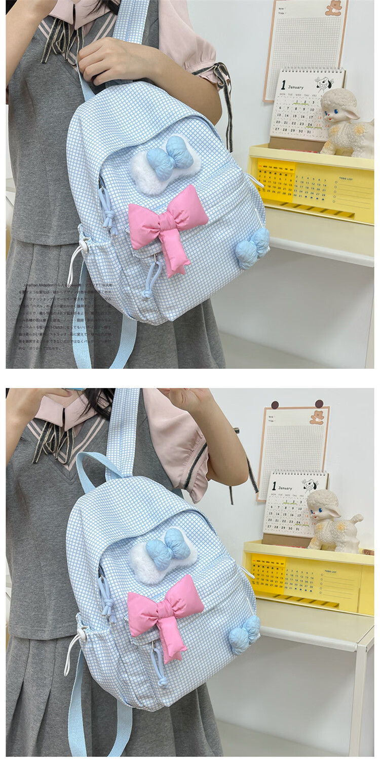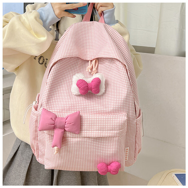 梵昇昱双肩包小清新格纹小学生书包初高中生可爱少女超轻减负出行背包 蓝色格纹双肩包【带蝴蝶结】小号
