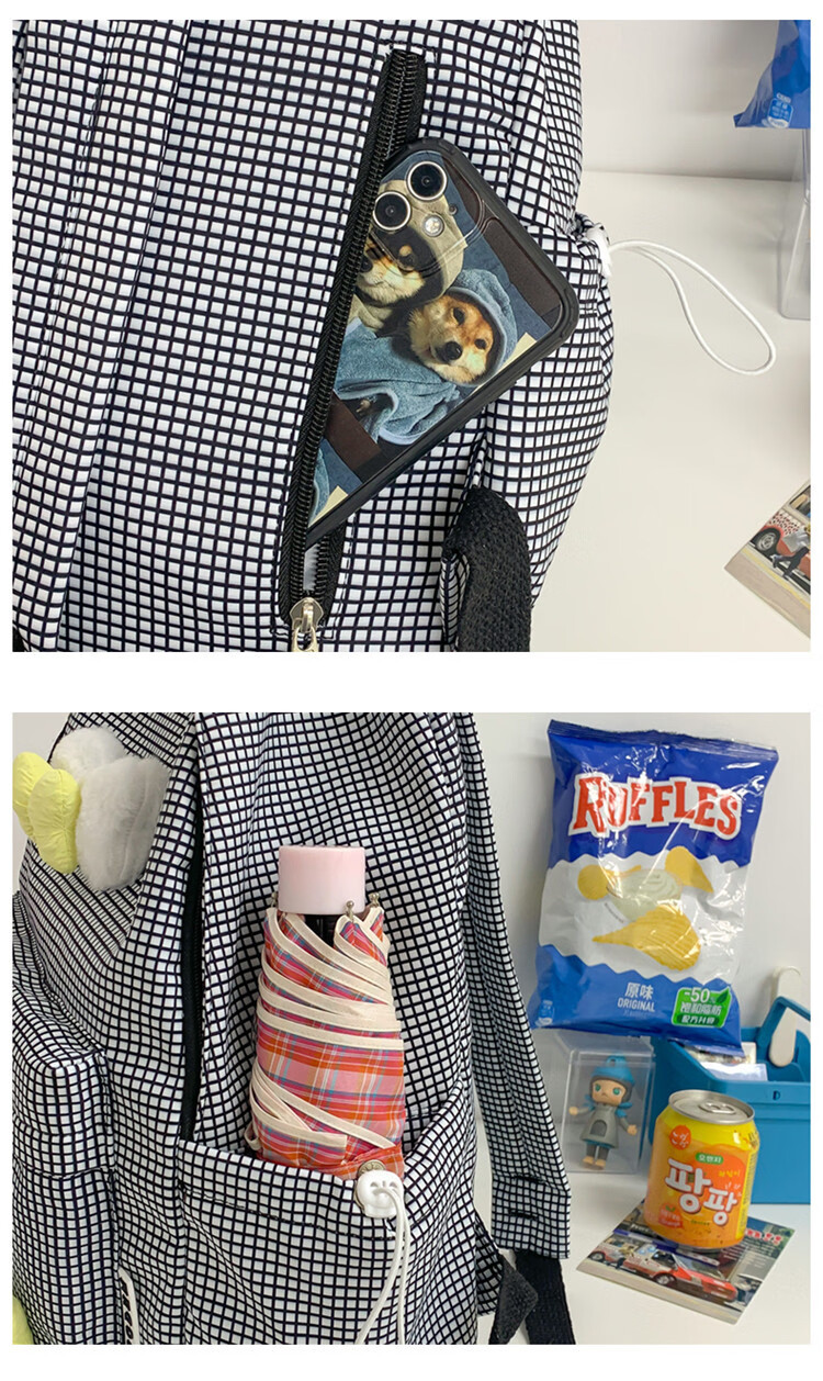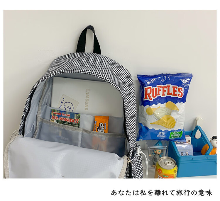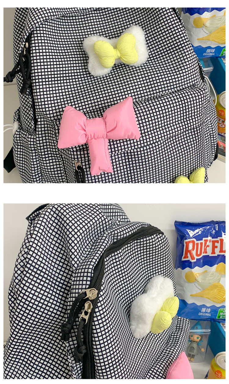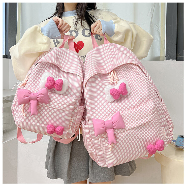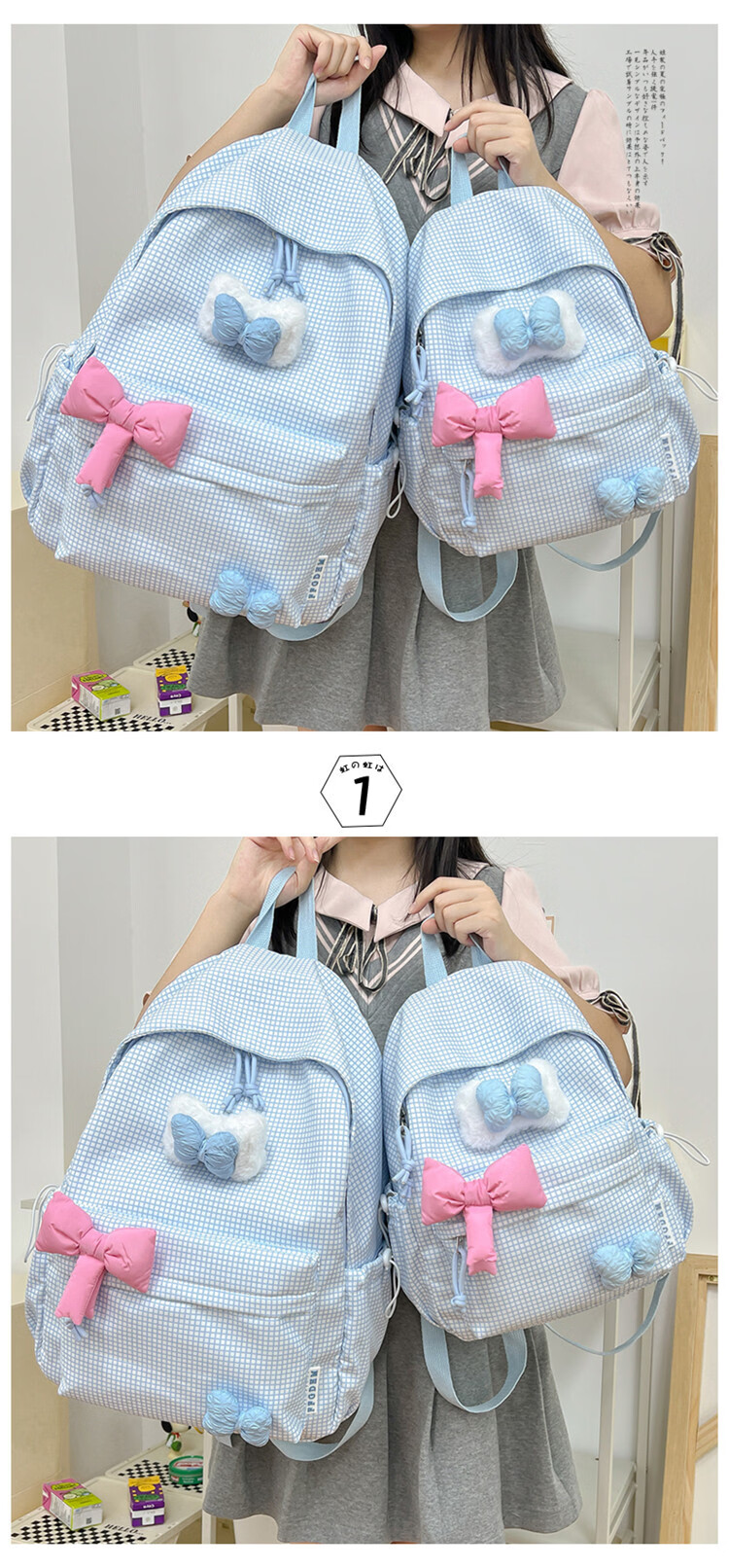 梵昇昱双肩包小清新格纹小学生书包初高中生可爱少女超轻减负出行背包 蓝色格纹双肩包【带蝴蝶结】小号