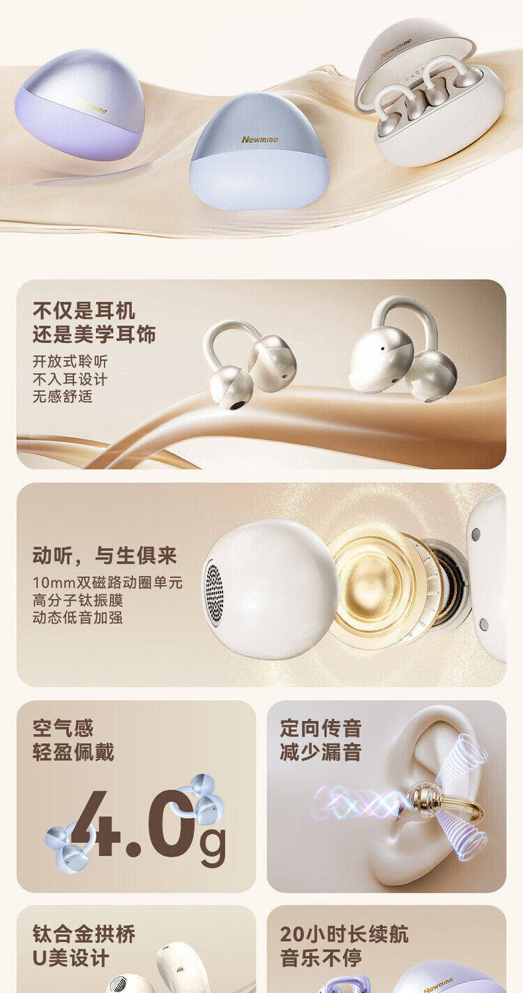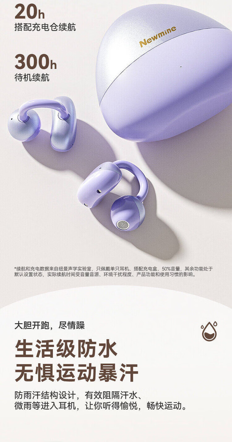 纽曼(Newmine)【2026顶配丨720°全景云感环绕音】蓝牙耳机耳夹式骨传导真无线不入耳运动跑步通话降噪超长续航 【720°空间环绕立体音丨无感佩戴丨超长续航】紫色