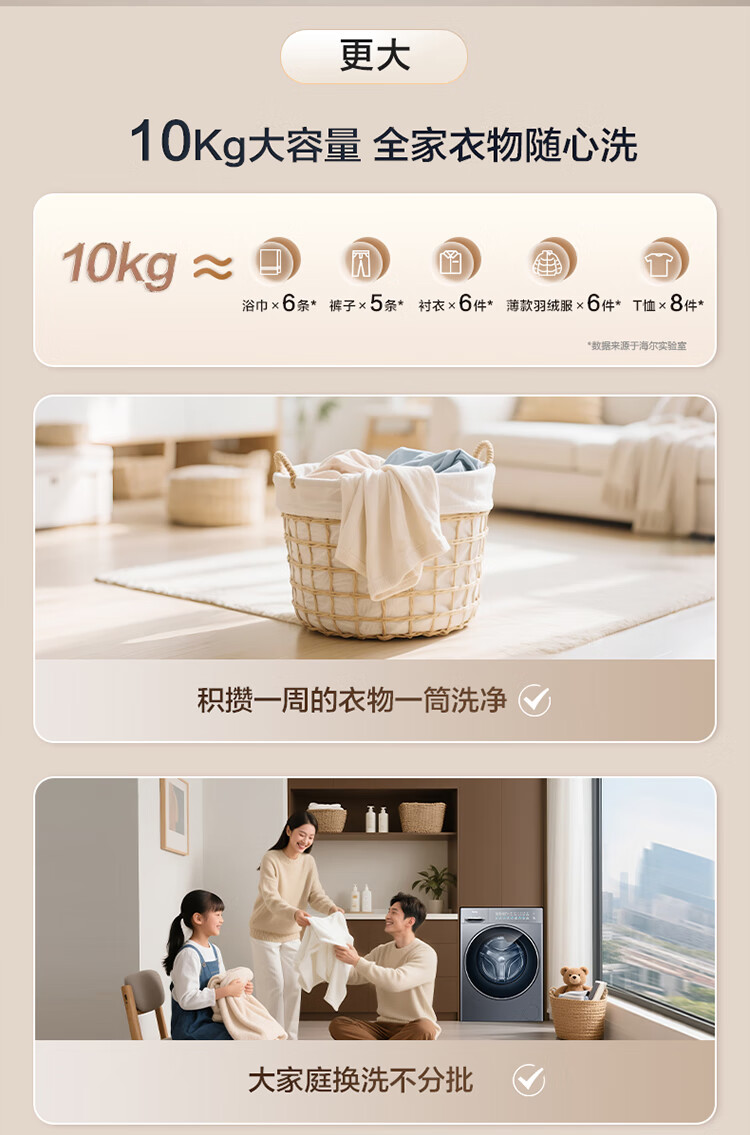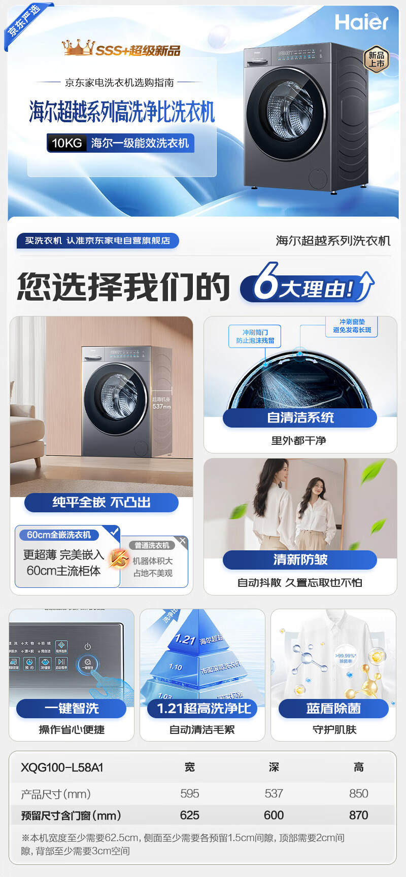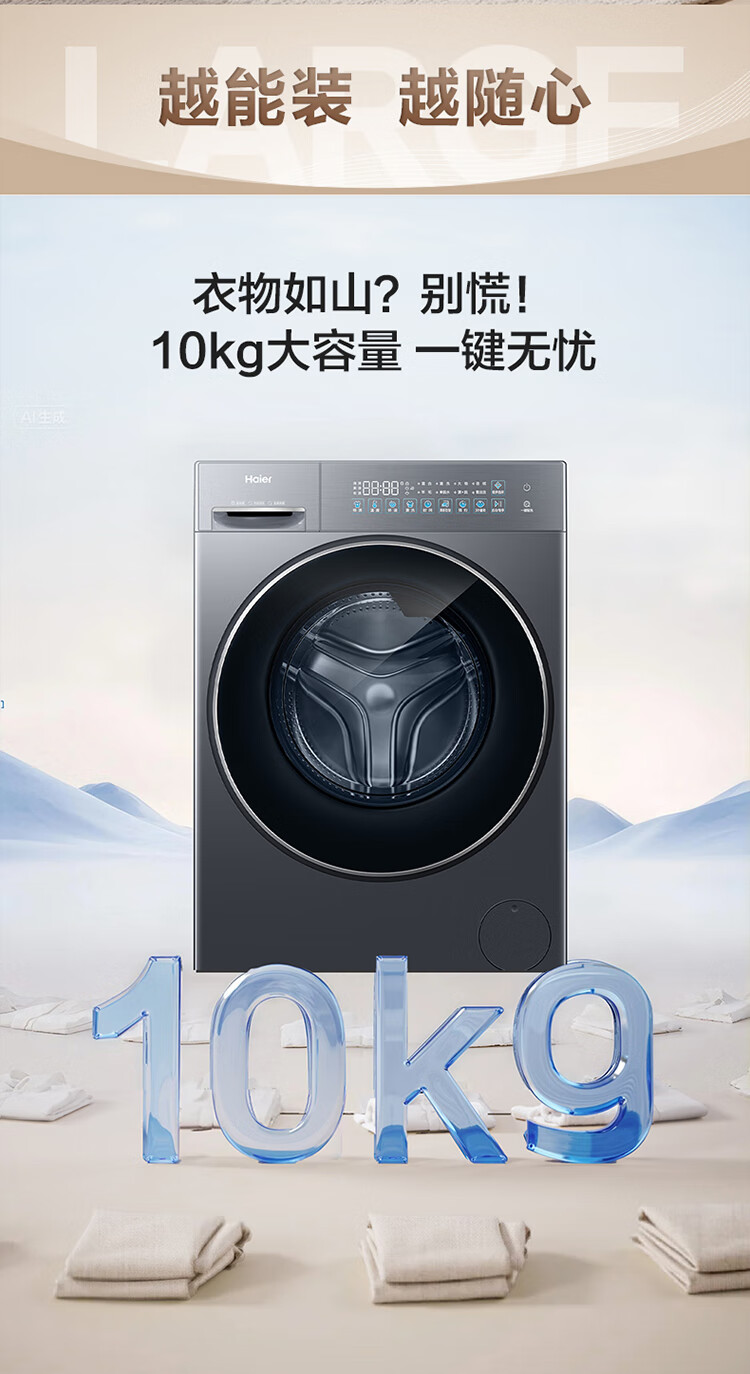 海尔滚筒洗衣机全自动10kg 新品 537超薄平嵌 蓝盾除菌 525大筒径 商场同款 20年防生锈XQG100-L58A1