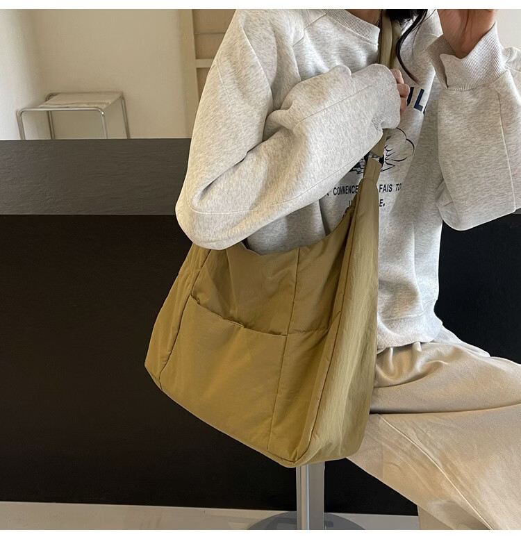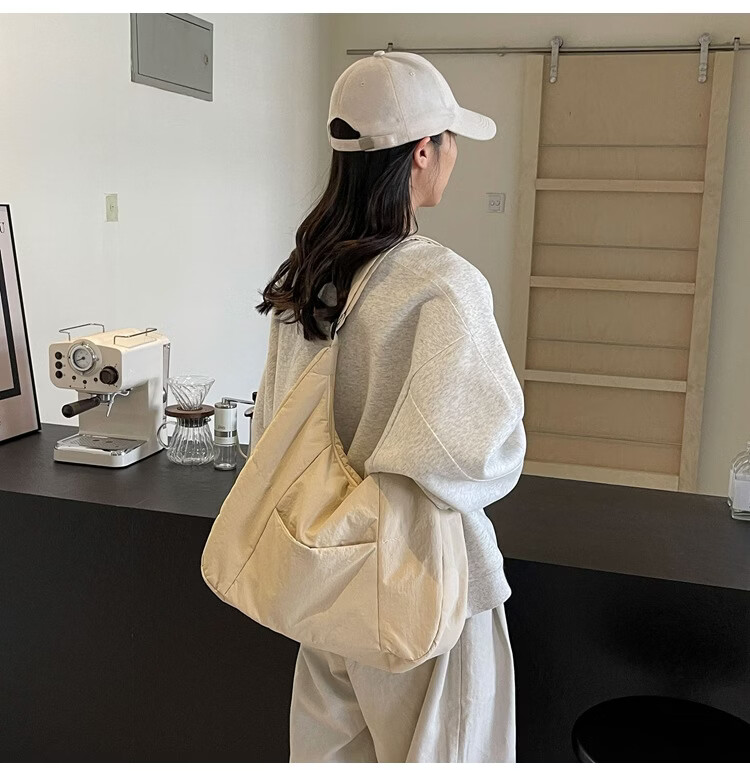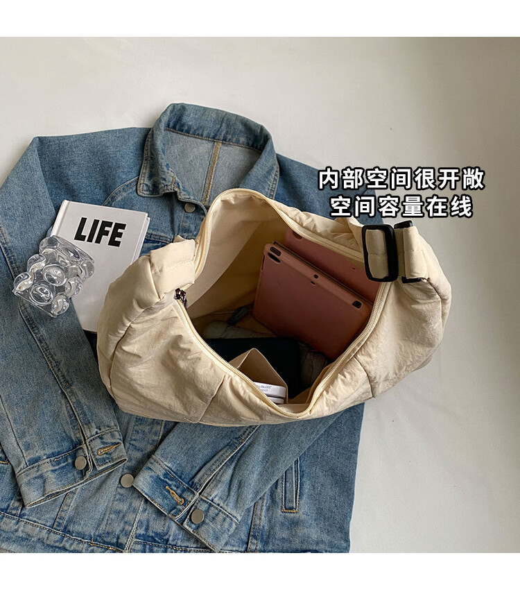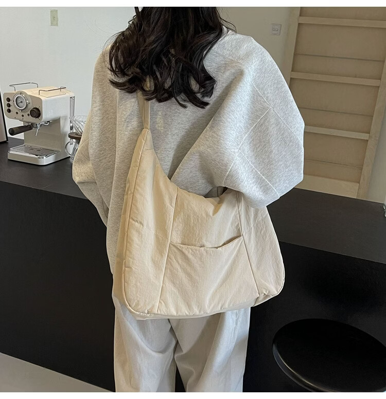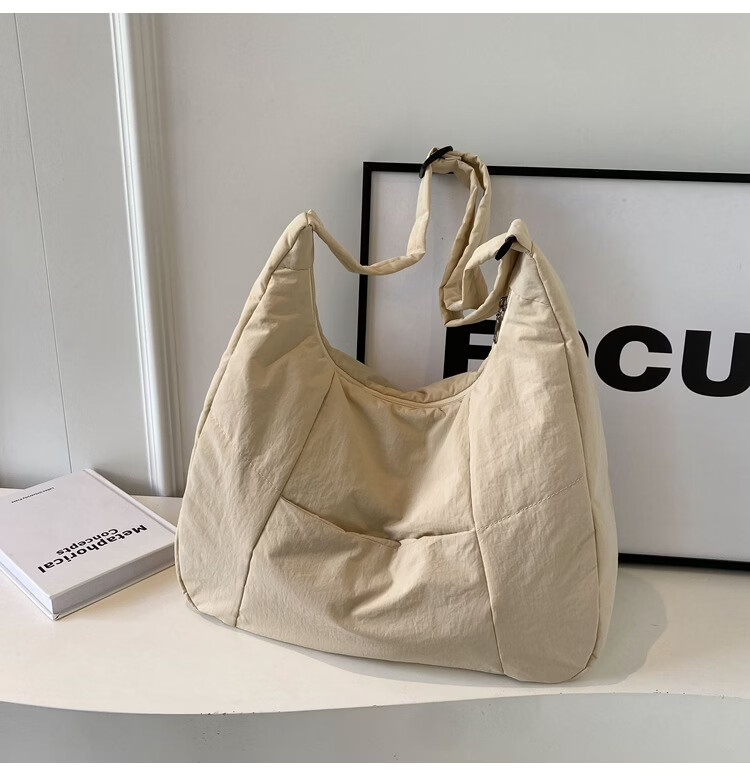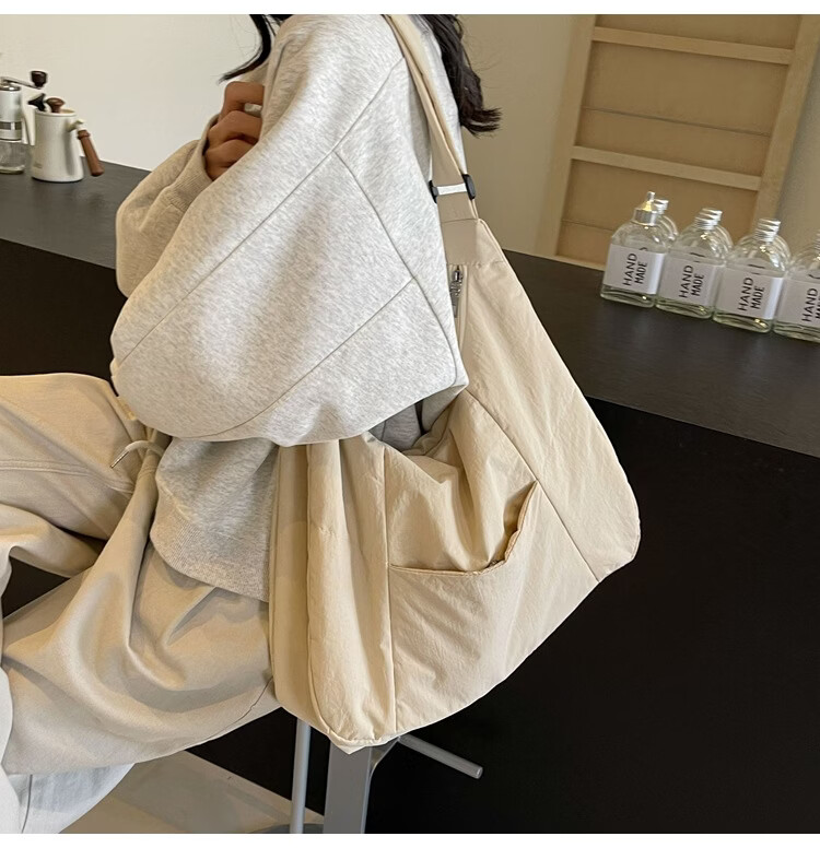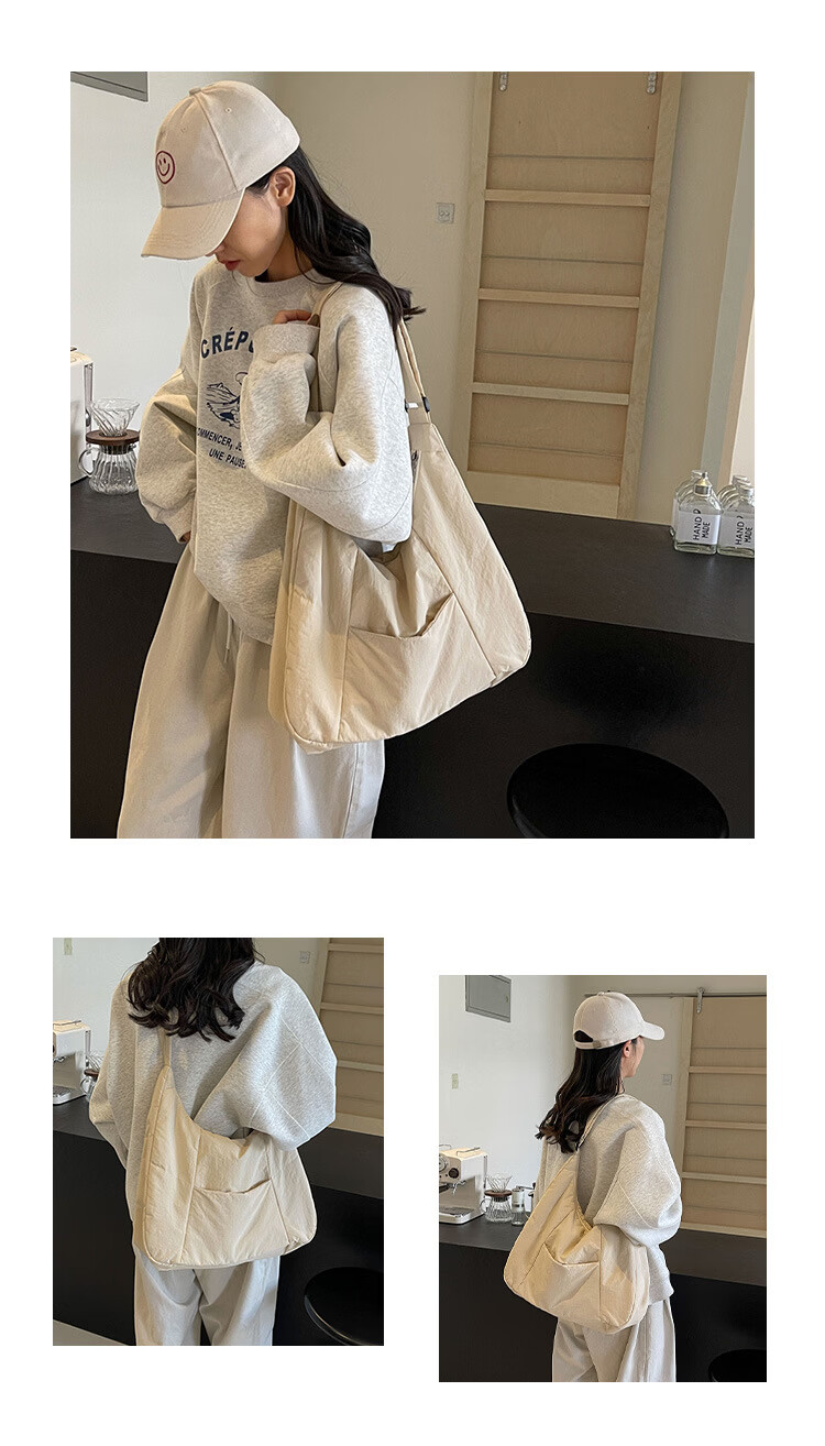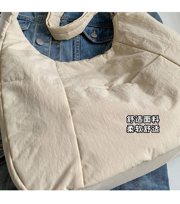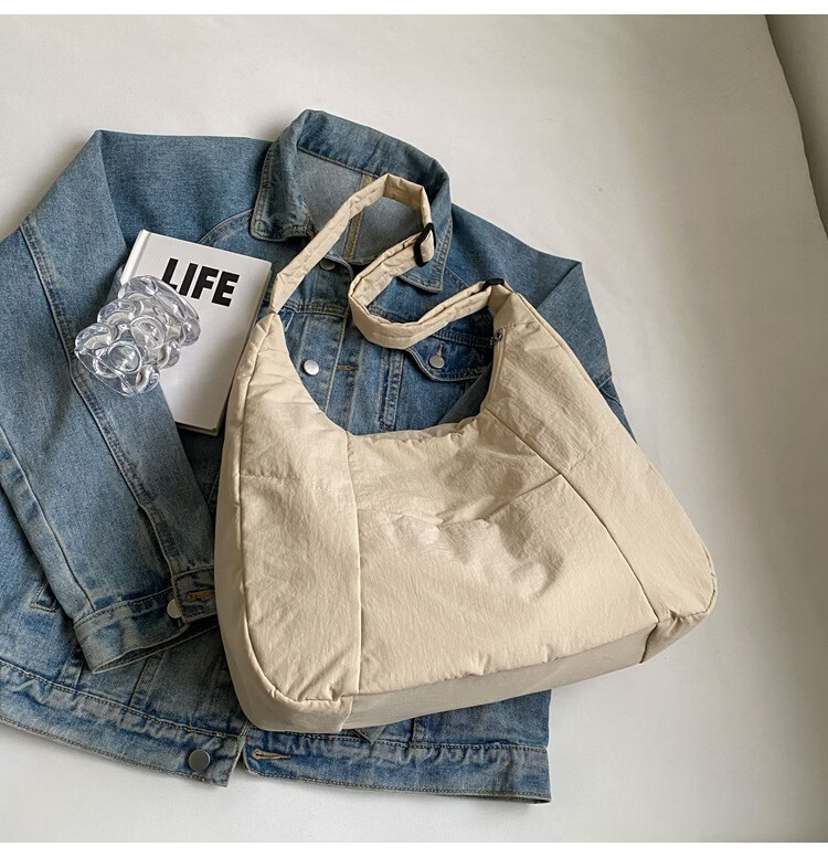 【精选】新款托特包女大学生上课斜挎包上班通勤单肩包尼龙布包棉 米白色