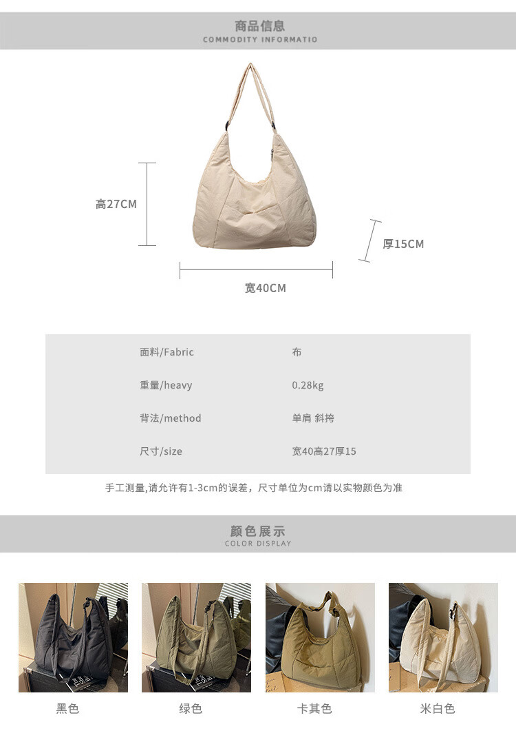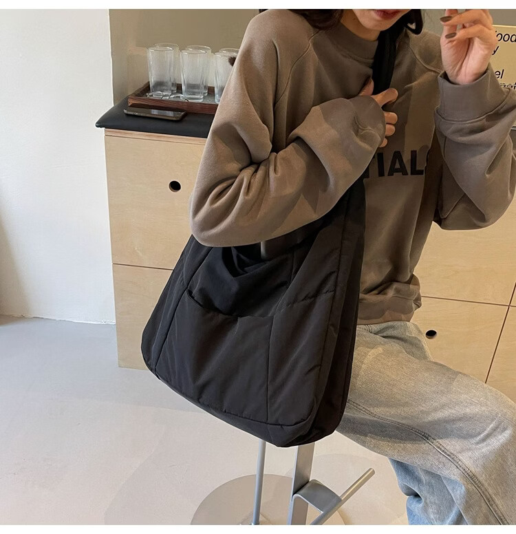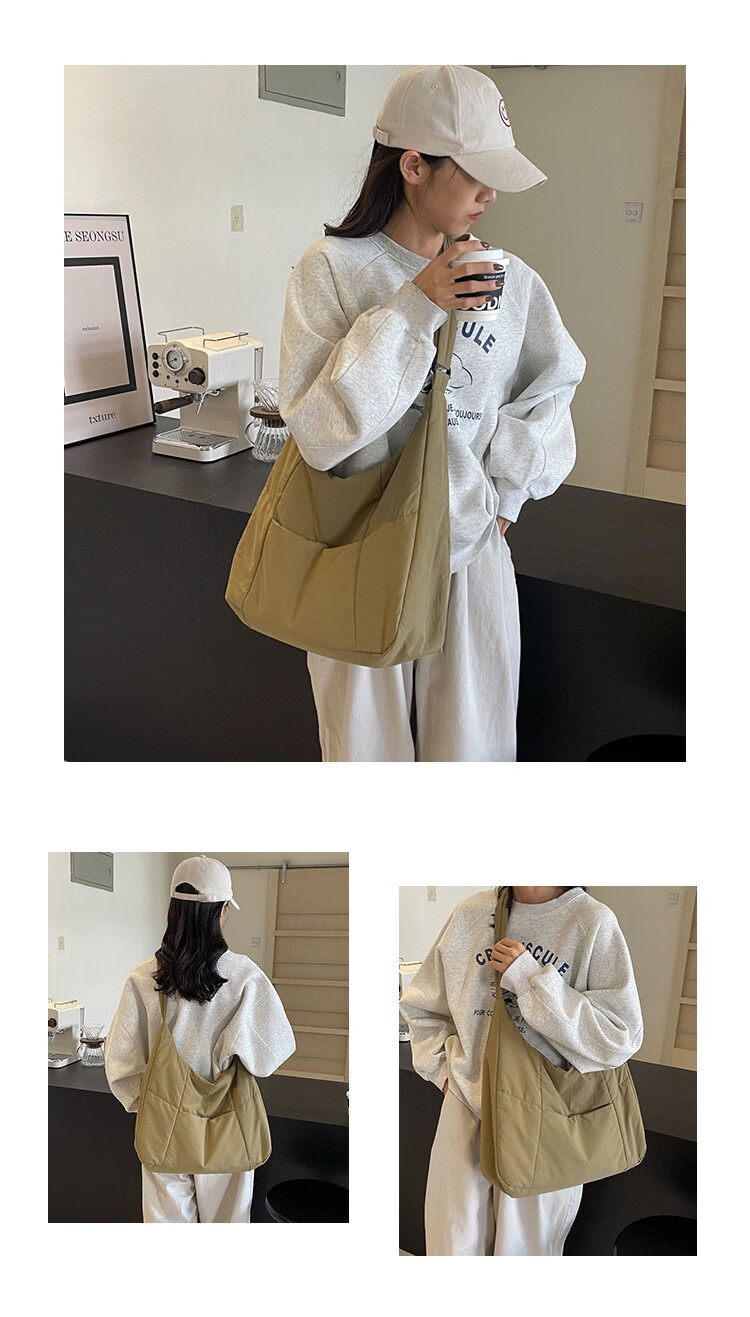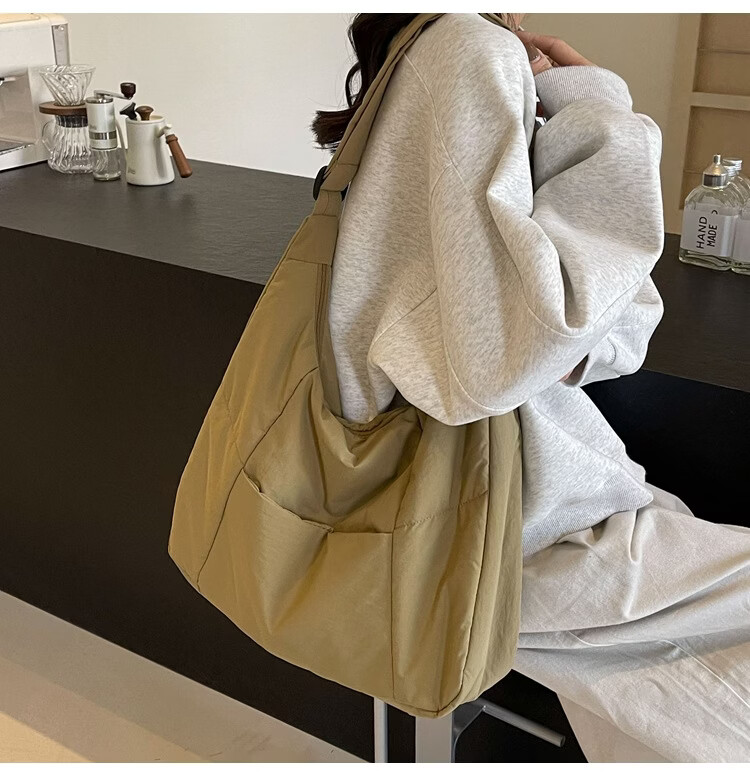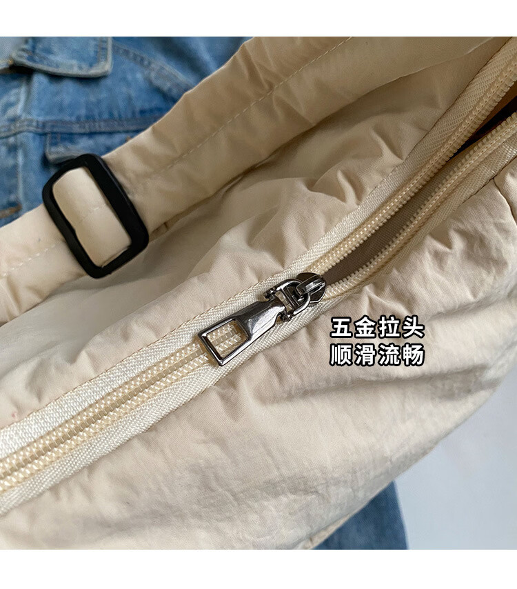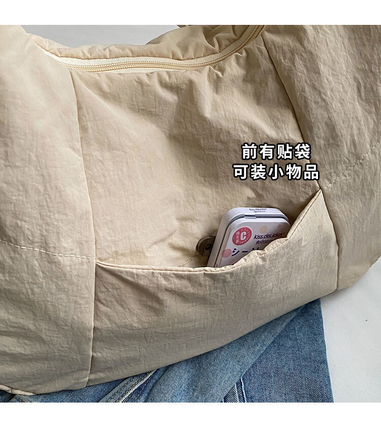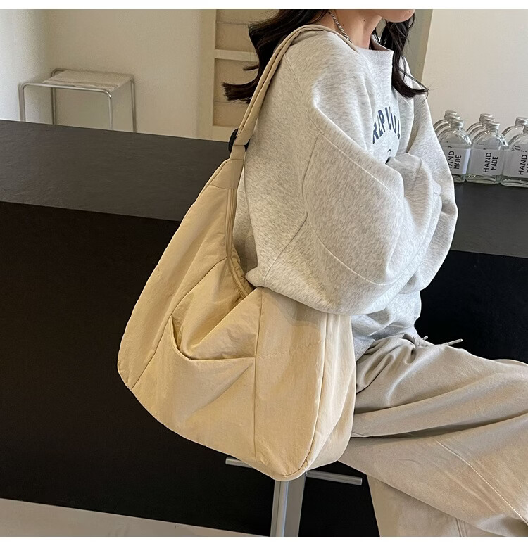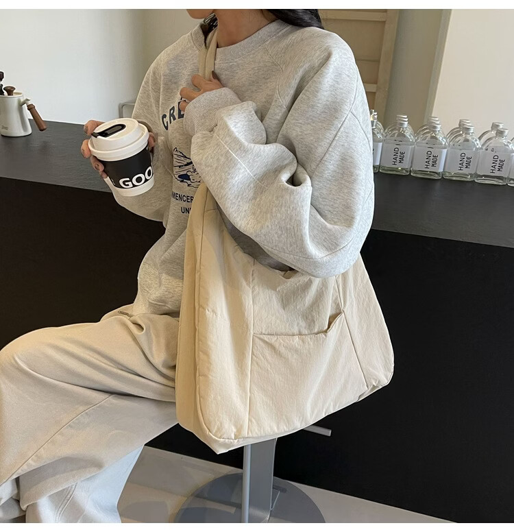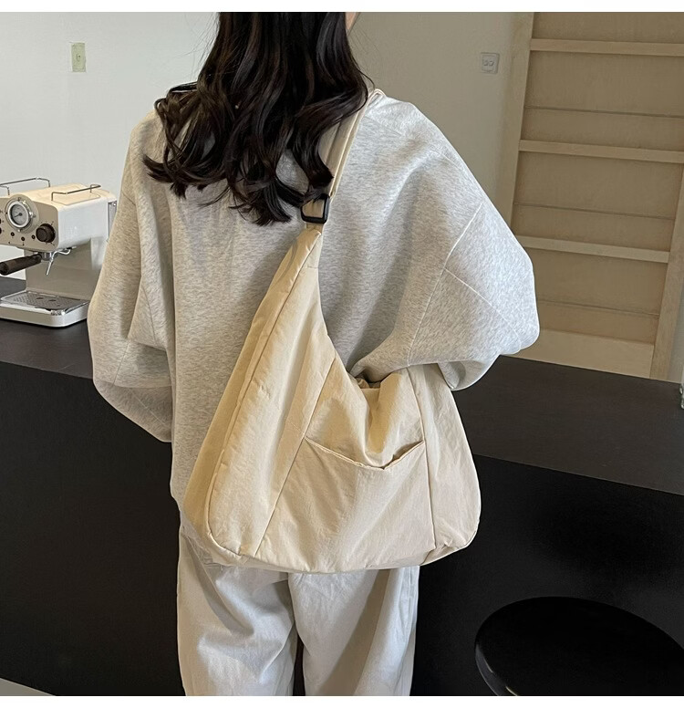 【精选】新款托特包女大学生上课斜挎包上班通勤单肩包尼龙布包棉 米白色
