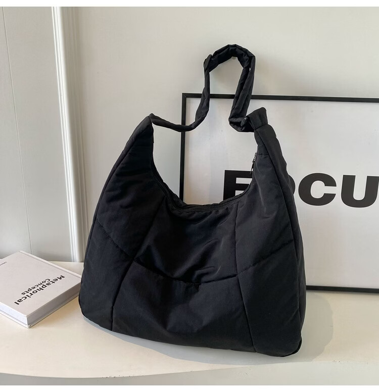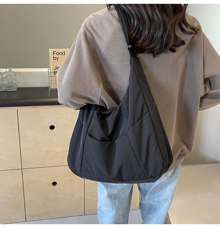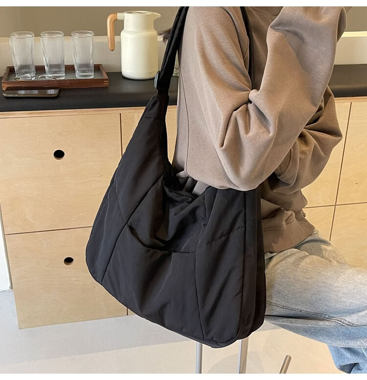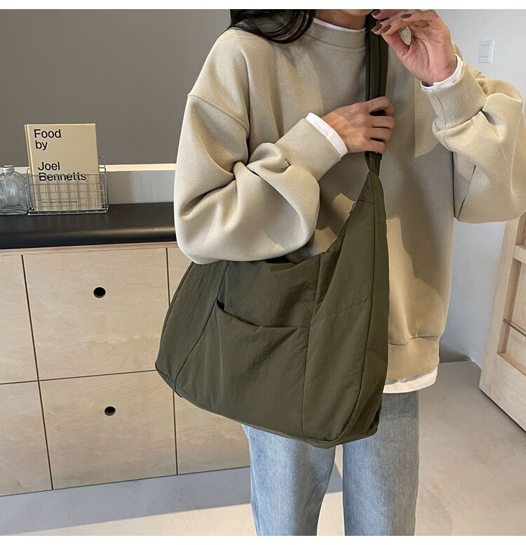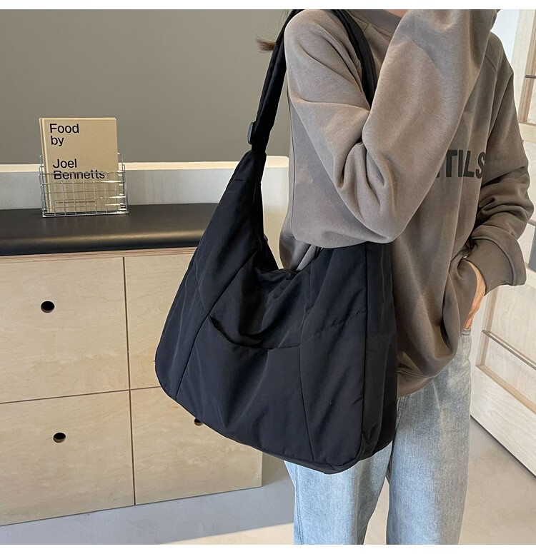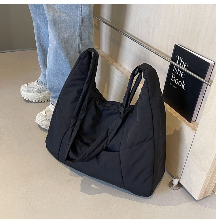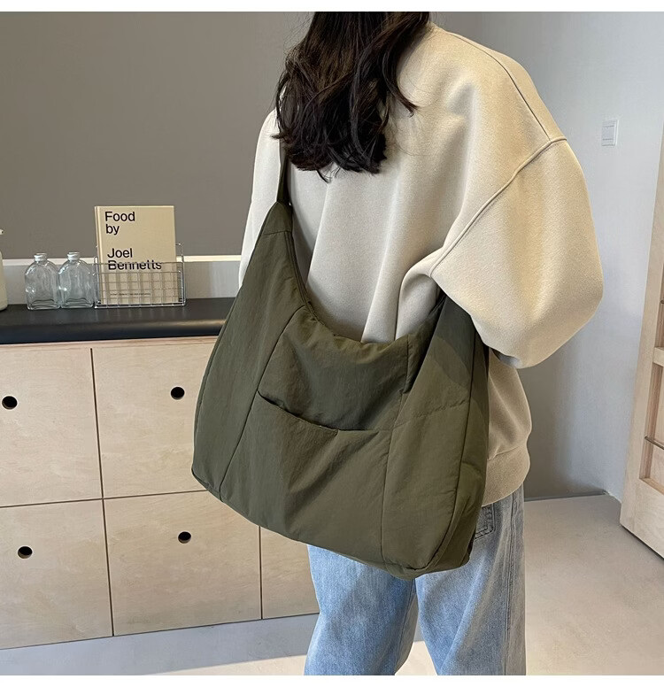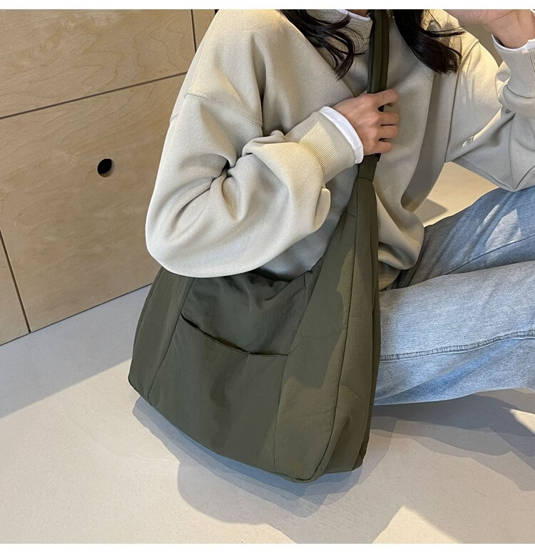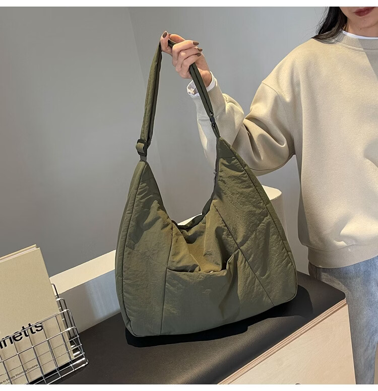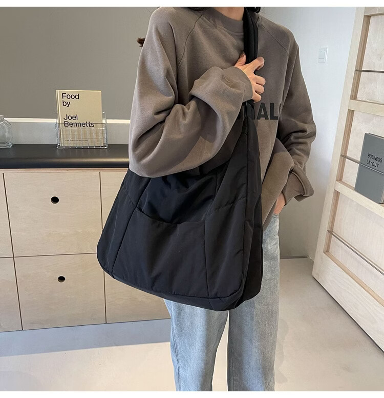 【精选】新款托特包女大学生上课斜挎包上班通勤单肩包尼龙布包棉 米白色