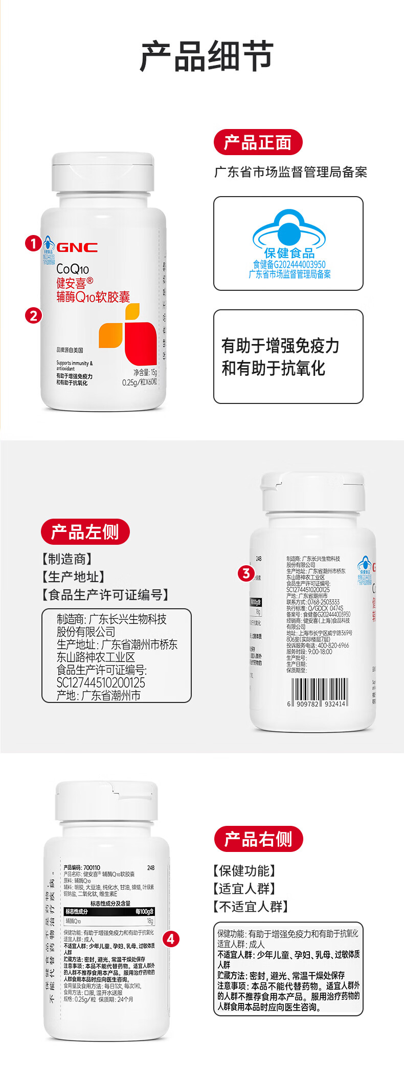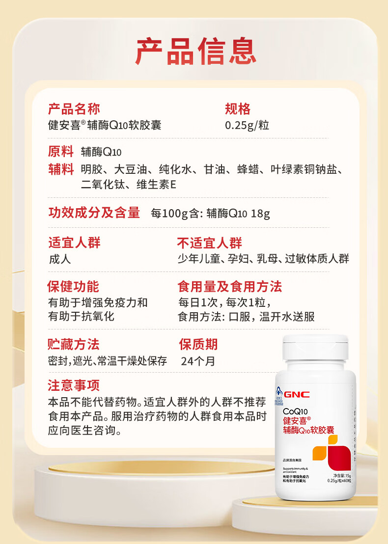 健安喜(GNC)辅酶Q10软胶囊60粒 含维生素E VE 有助于增强免疫力 抗氧化 成人 60粒*1瓶