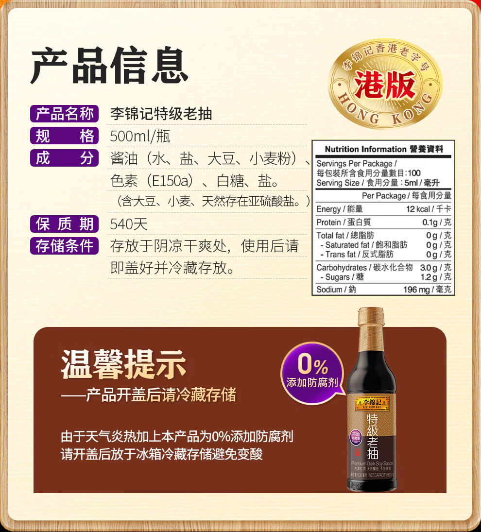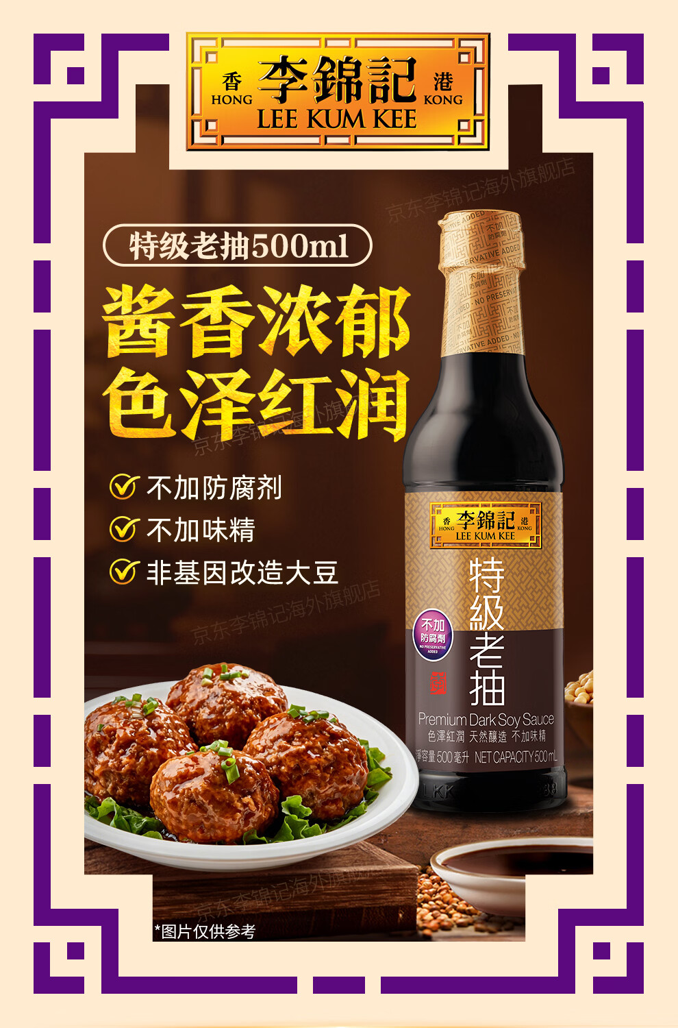 李锦记(LEE KUM KEE)特级老抽500ml 酿造酱油厨房调味红烧提鲜上色家用 港货 塑料瓶装500ml