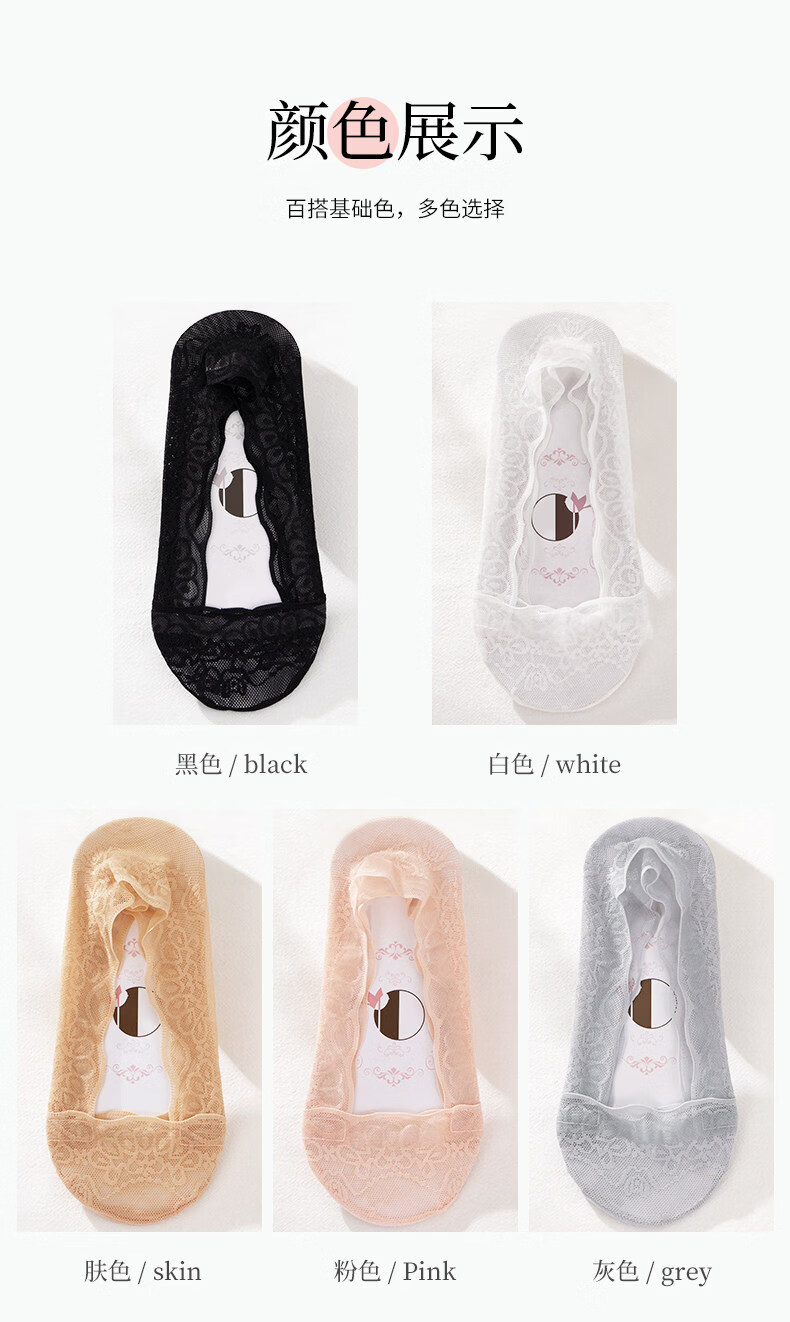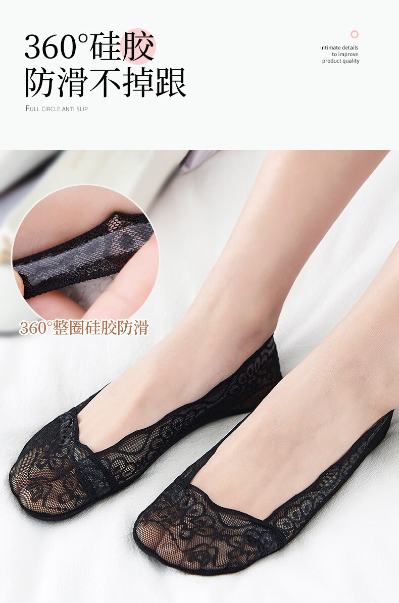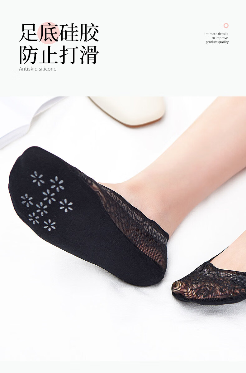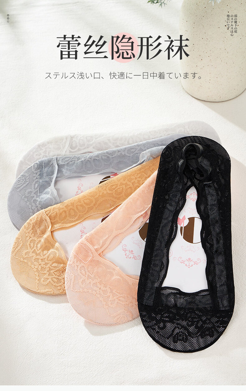 贝可棉袜子女隐形浅口防滑不掉跟隐形女士高跟鞋袜子单鞋脚底专用丝袜 蕾丝隐形袜5双(黑3肤2) 34-39码