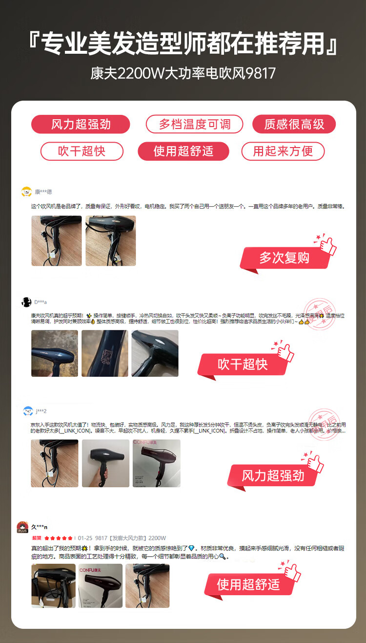 康夫(CONFU)小家电吹风机家用发廊理发店专业大风力恒温护发大功率速干吹风筒生日礼物 9817【发廊大风力款】2200W