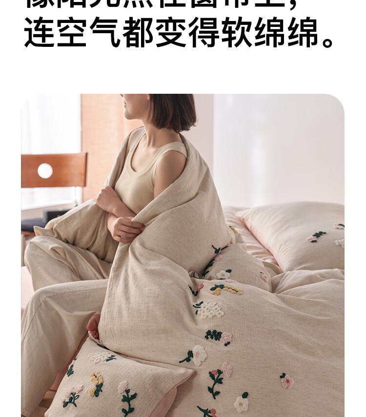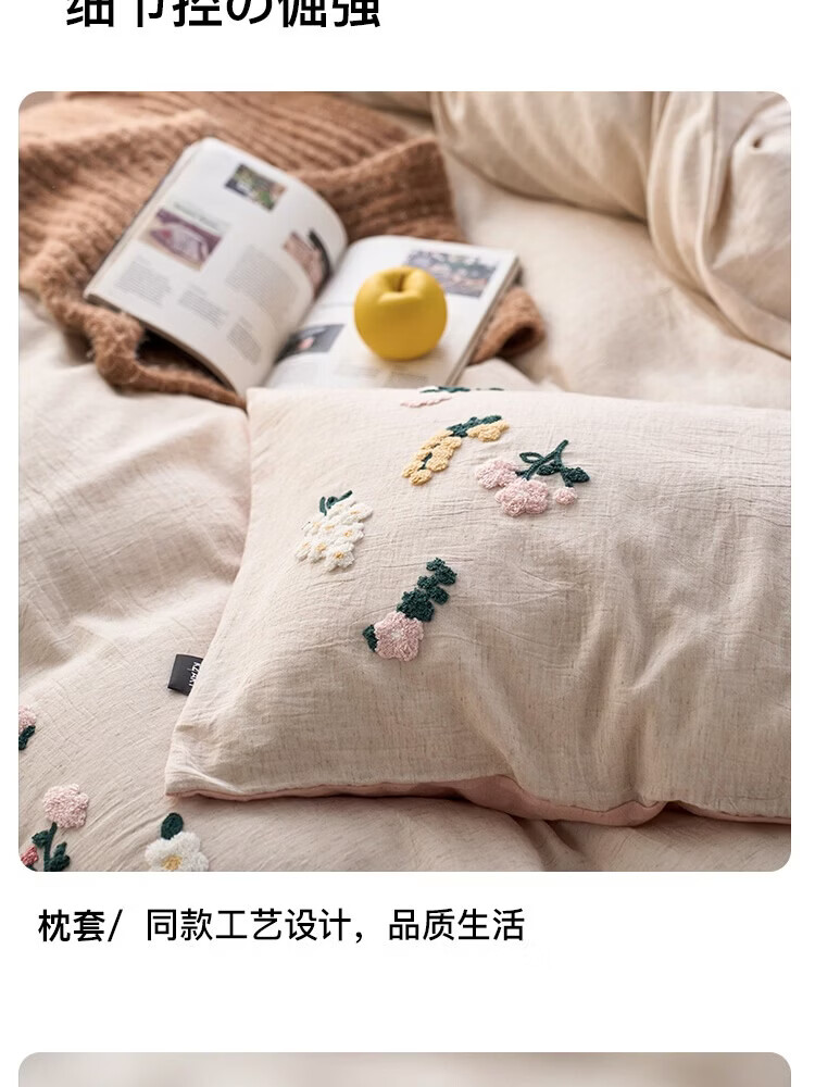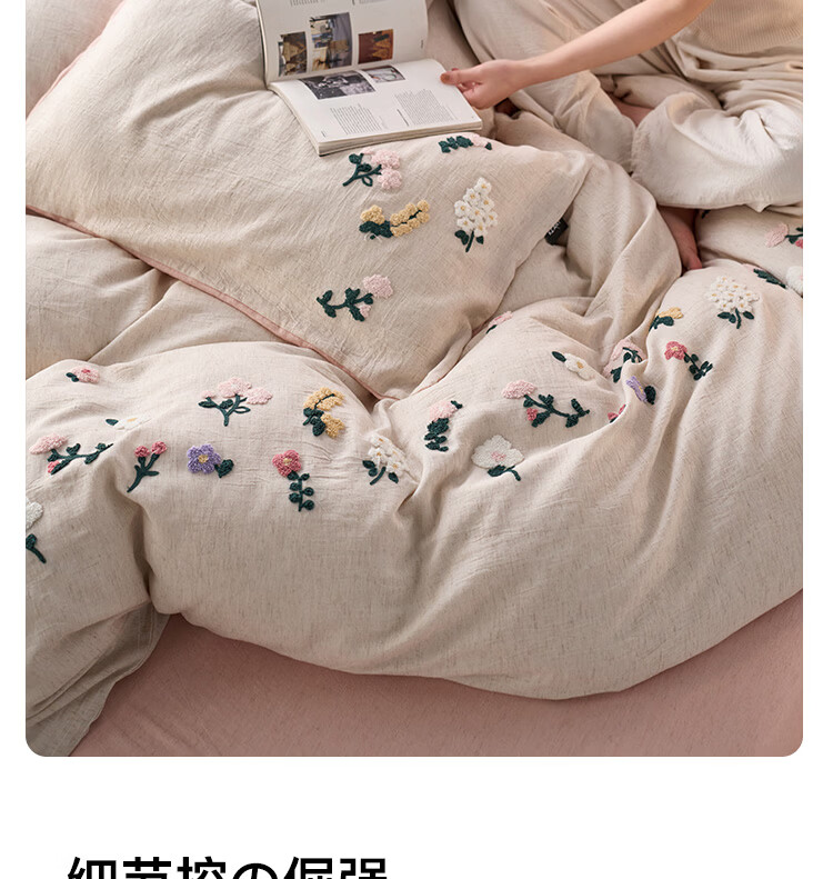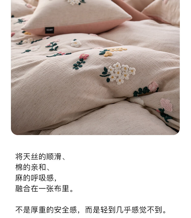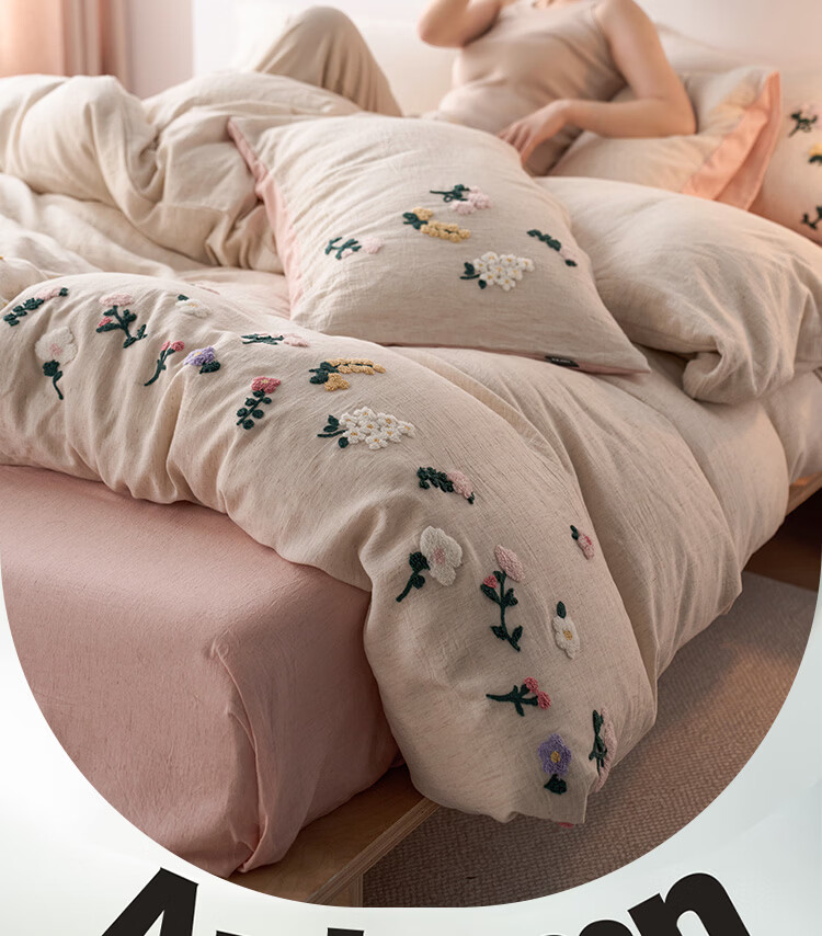 ROLAND LIVE天丝棉麻四件套春夏新款透气花朵刺绣被套床单家用卧室床上用品 KZ 天丝棉麻四件套-紫茉白 1.8米床 床笠款 【被套200*230cm】