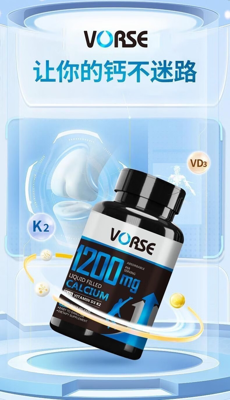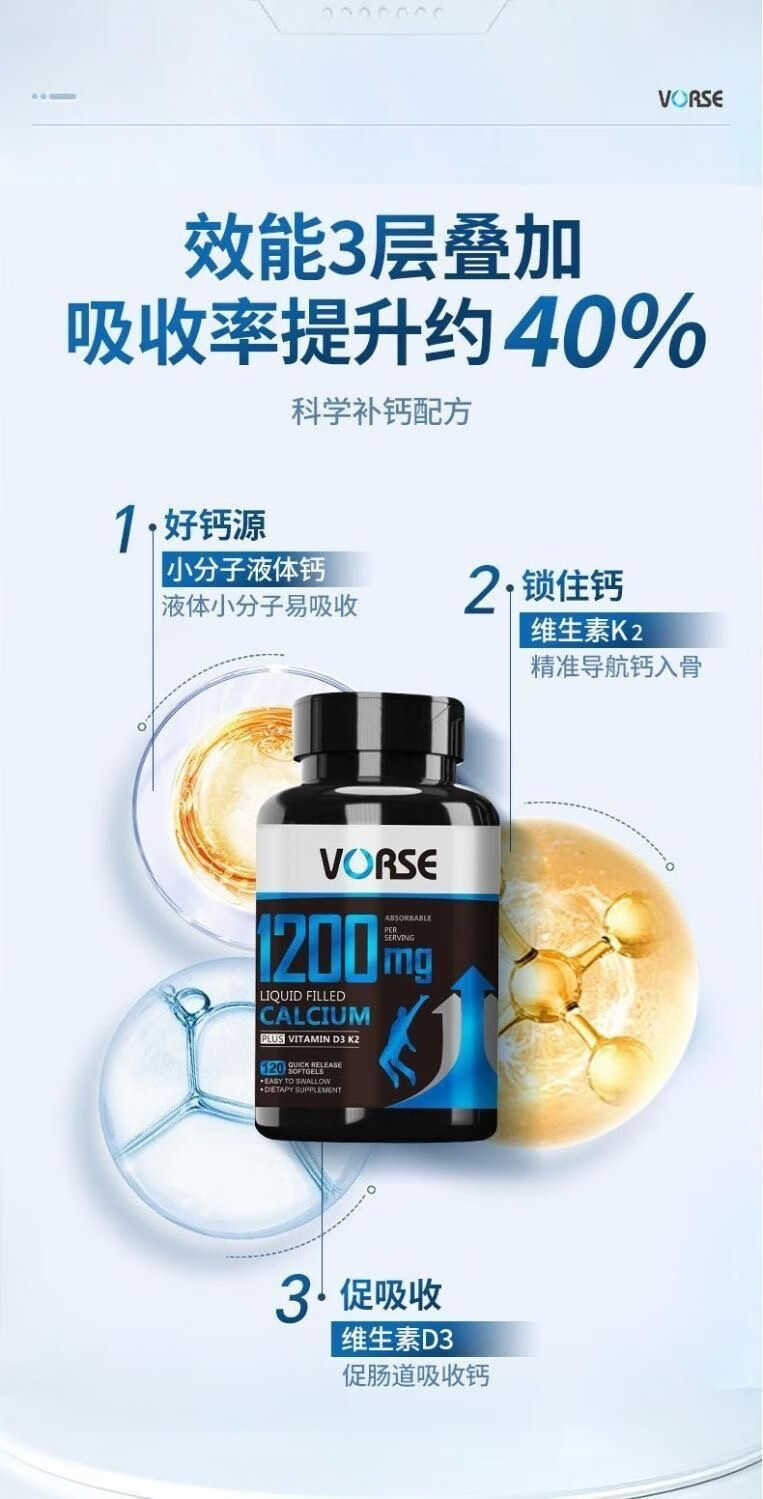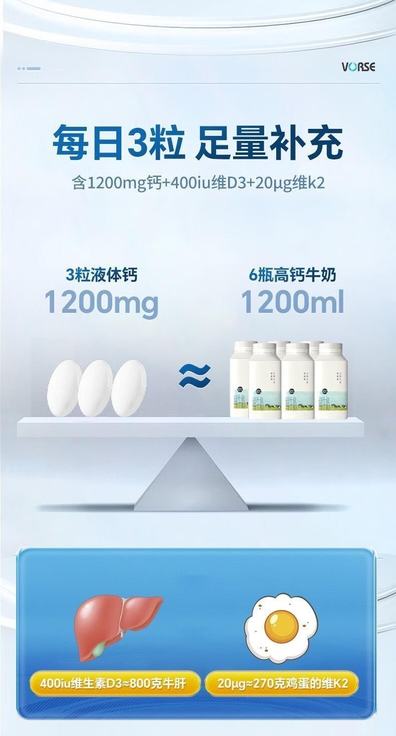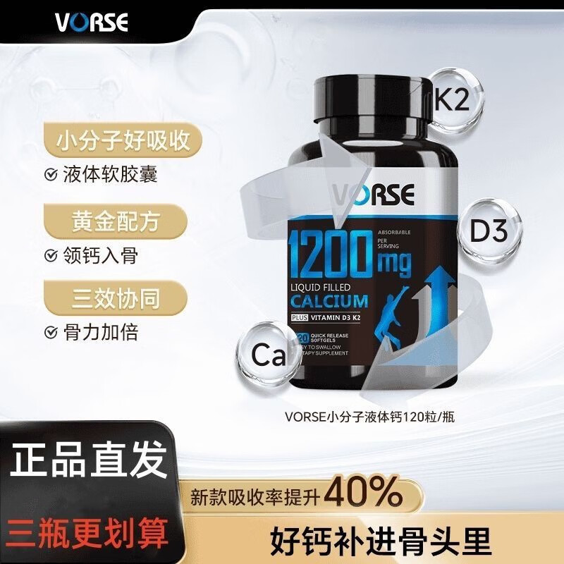 VORSE升级款小分子液体钙维生素D3+K2软胶囊高含量1200mg易吸收120粒瓶 【周期装】 120粒*3瓶