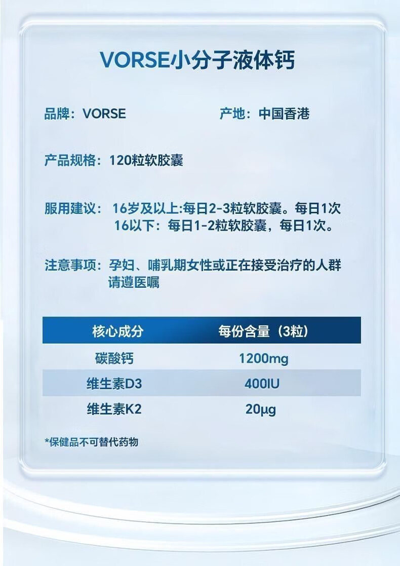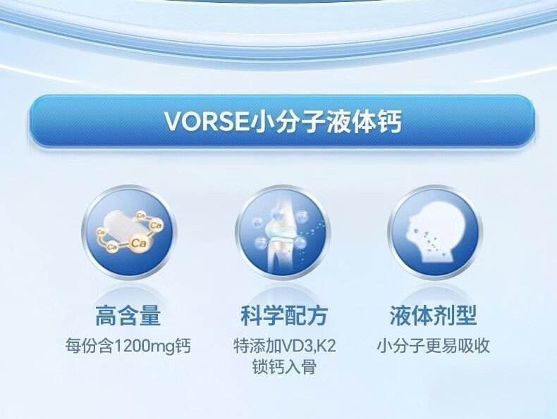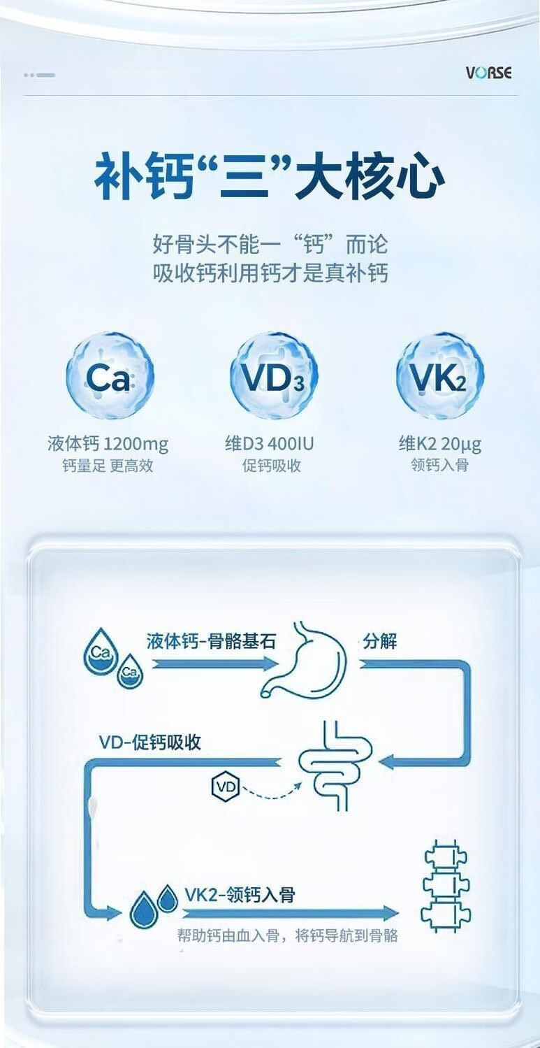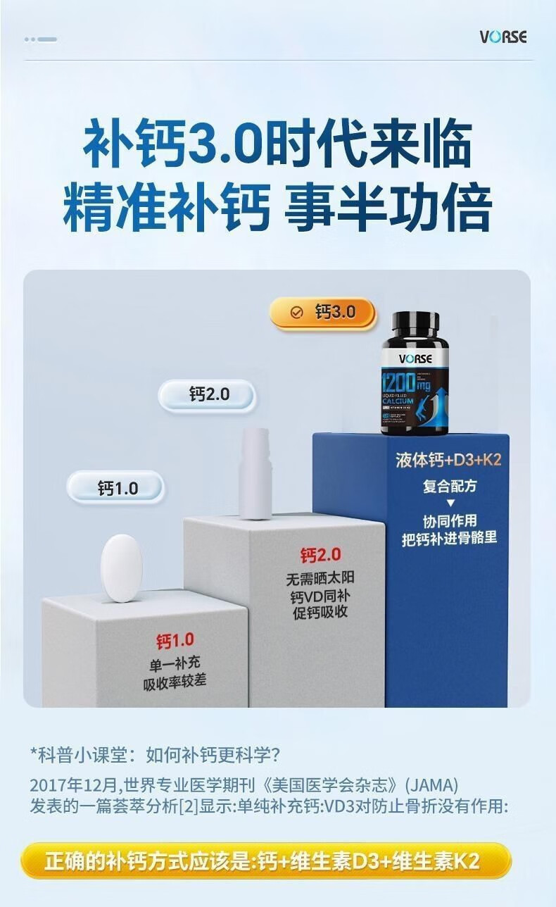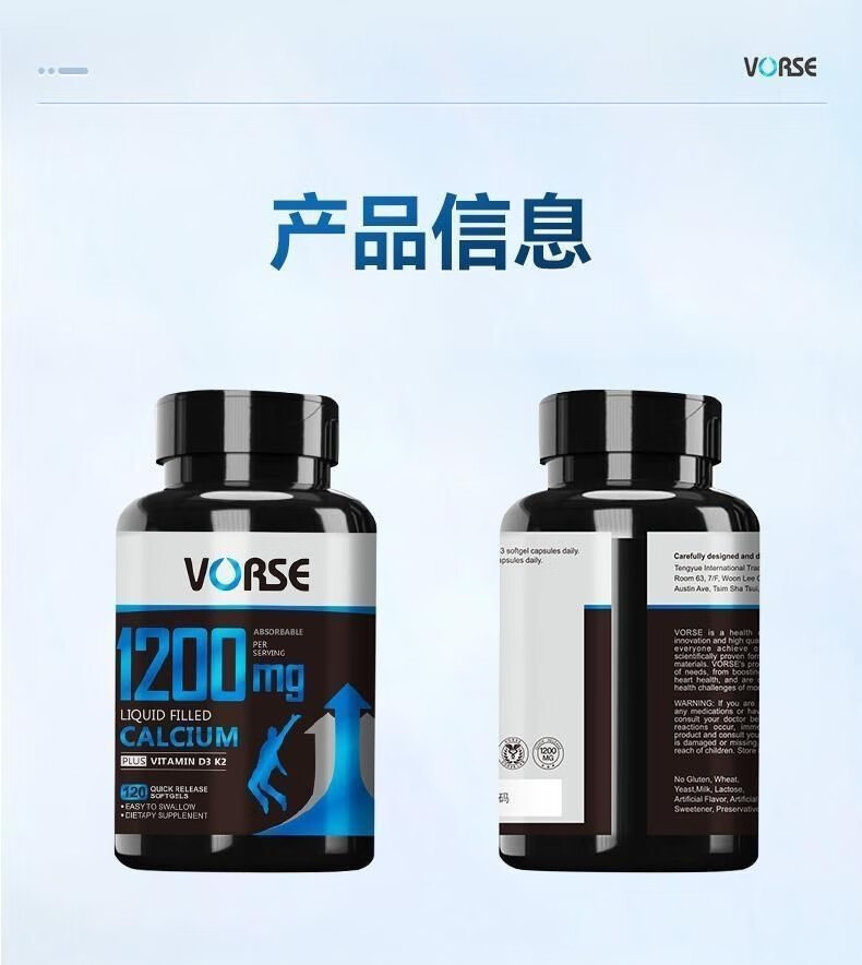VORSE升级款小分子液体钙维生素D3+K2软胶囊高含量1200mg易吸收120粒瓶 【周期装】 120粒*3瓶
