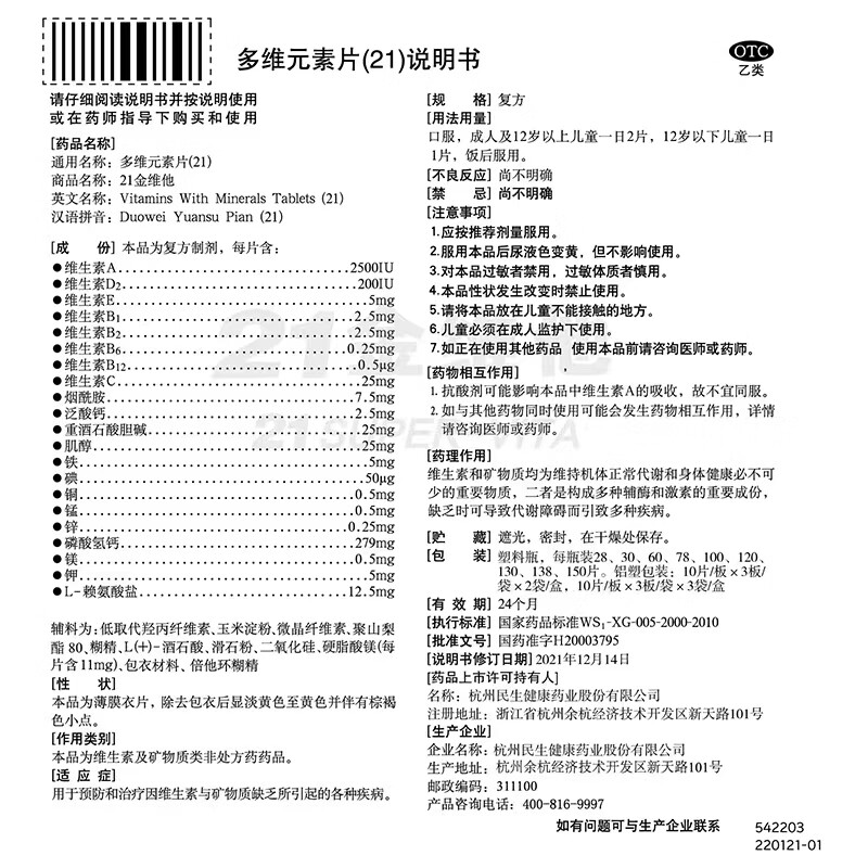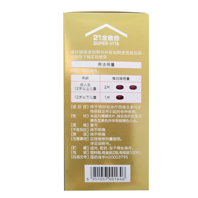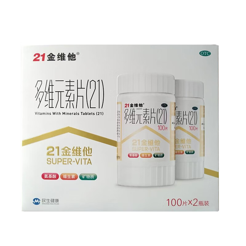 21金维他 多维元素片(21) 100片*2瓶复合维生素B族补充成人赖氨酸维C维E钙铁锌AD儿童中老年多种维生素矿物质