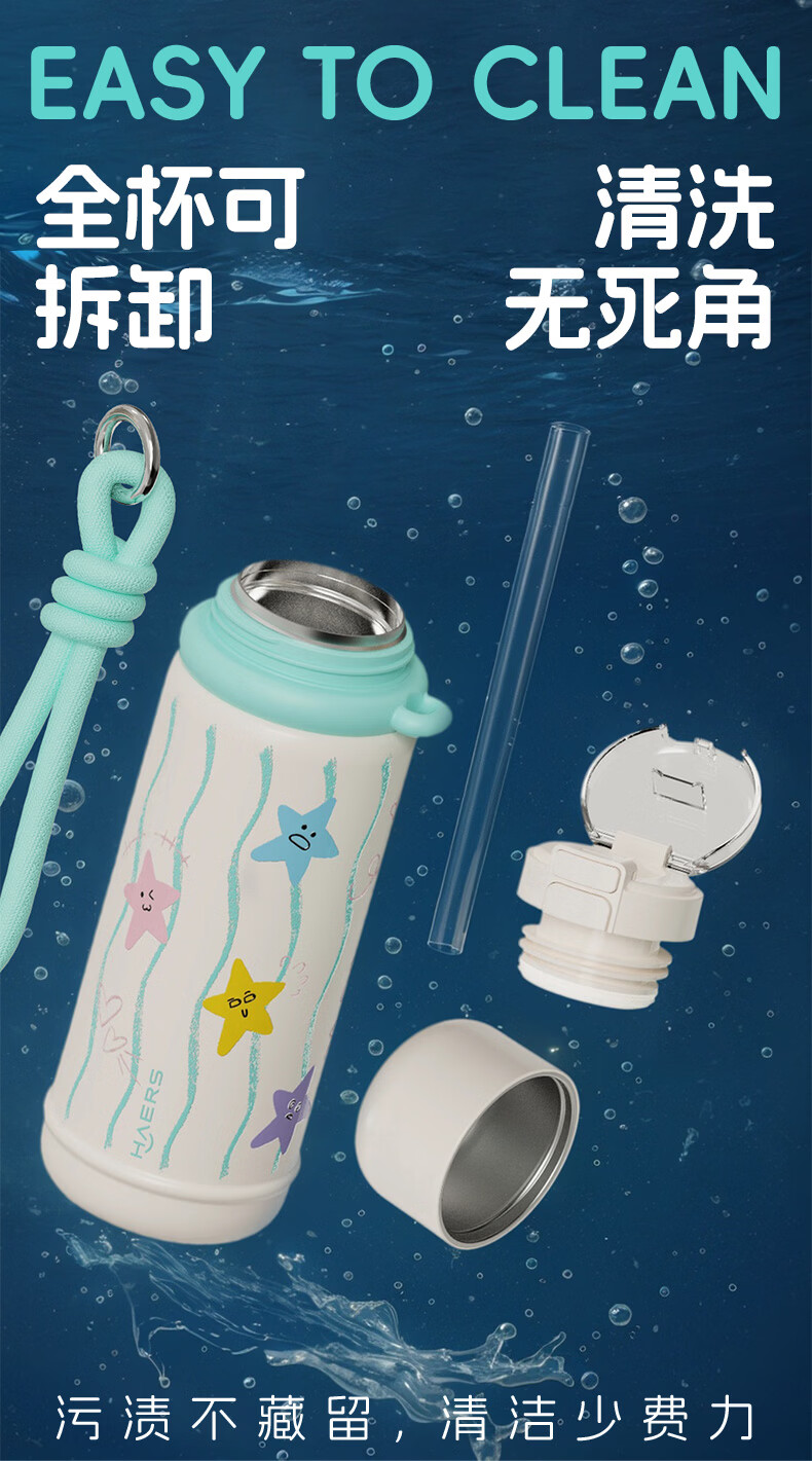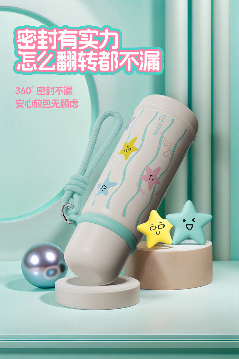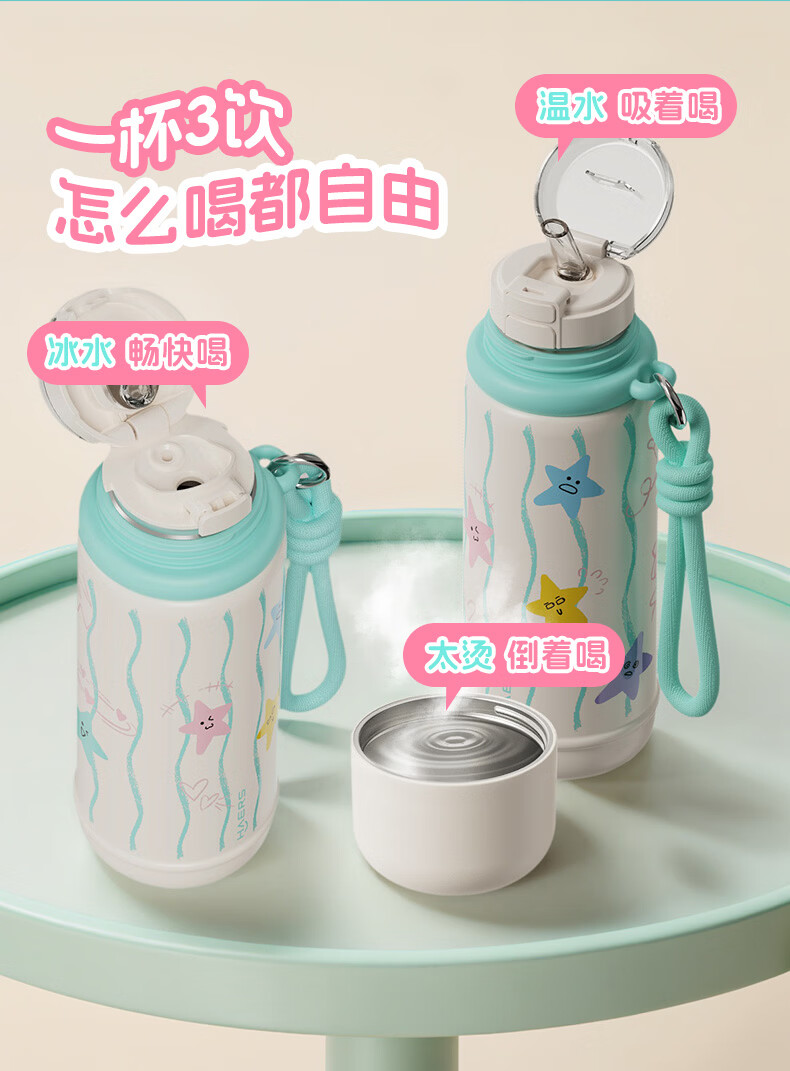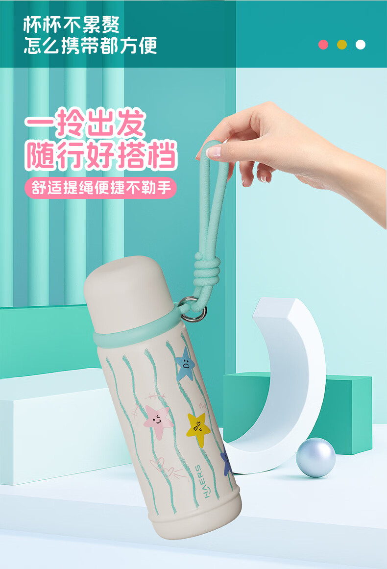 哈尔斯(HAERS)保温杯儿童6-12岁上学专用女生高颜值水杯吸管杯316L三饮水壶提绳