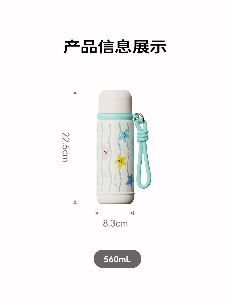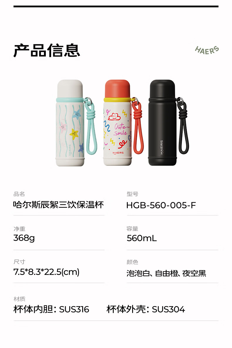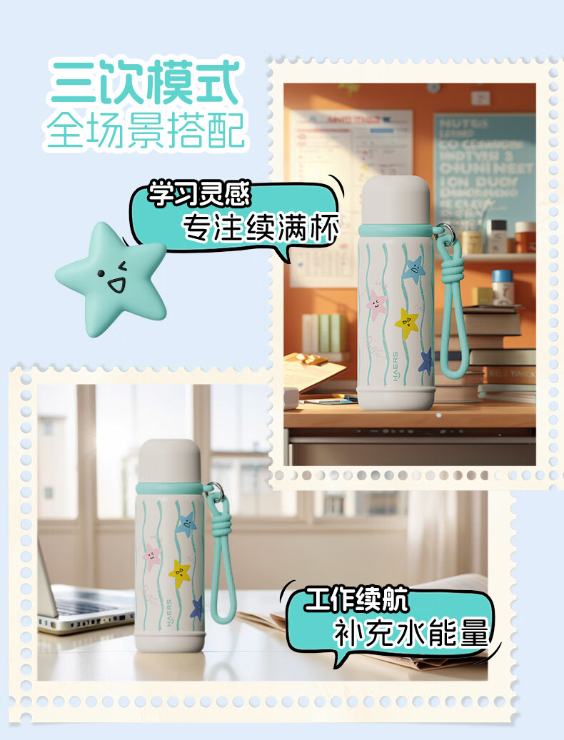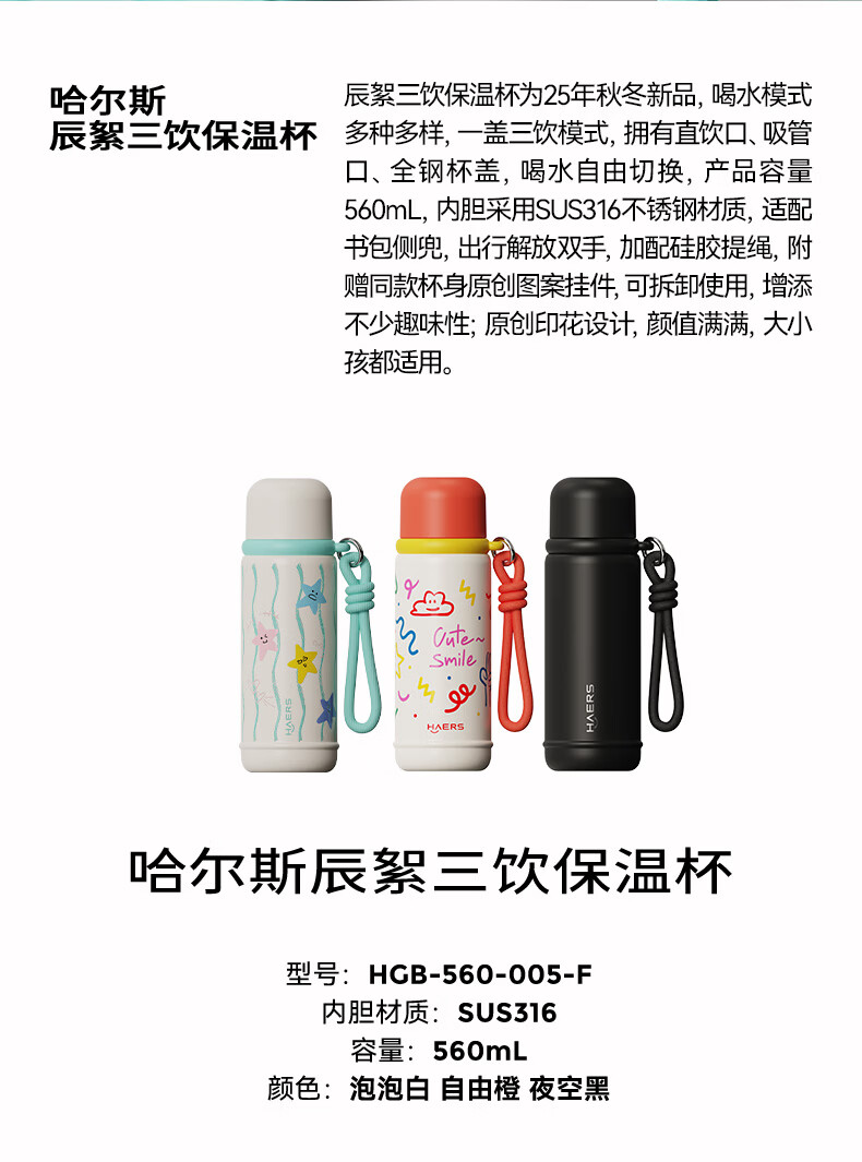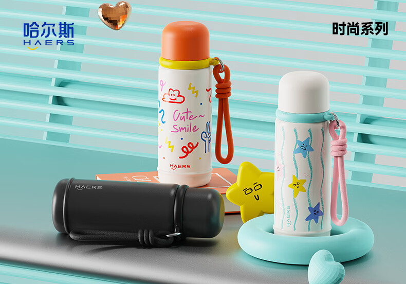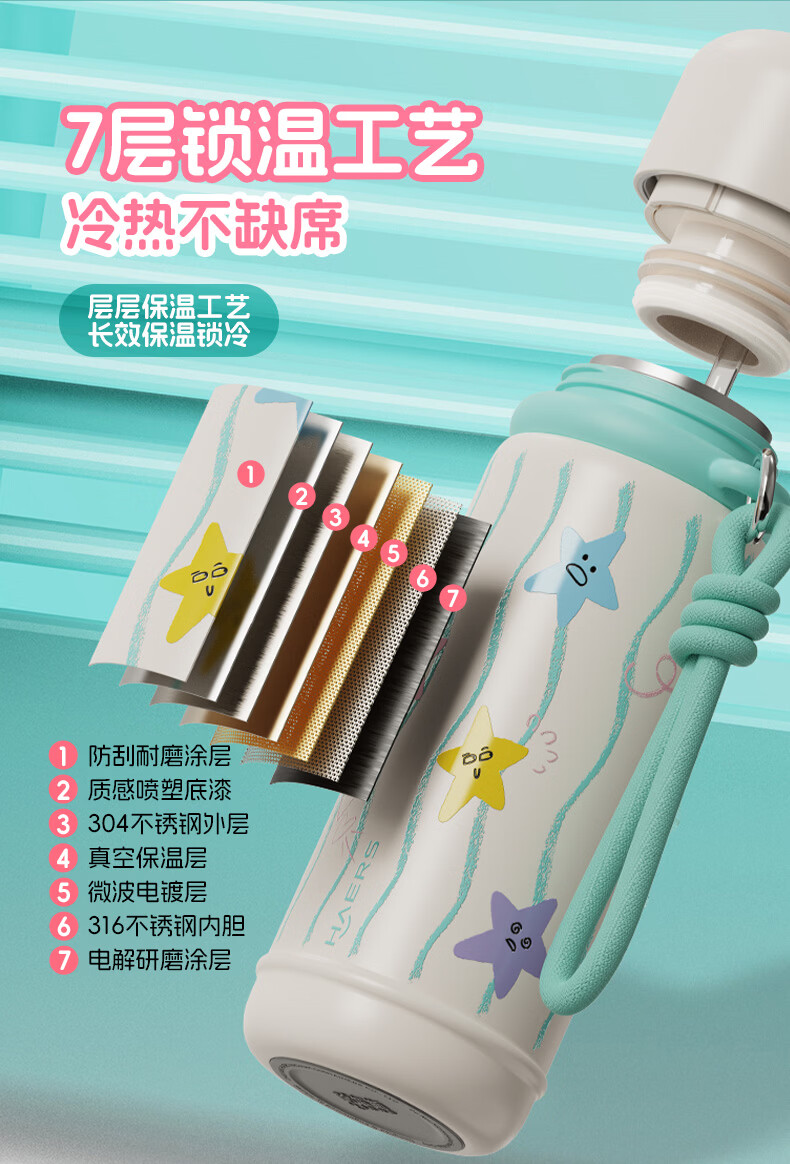 哈尔斯(HAERS)保温杯儿童6-12岁上学专用女生高颜值水杯吸管杯316L三饮水壶提绳