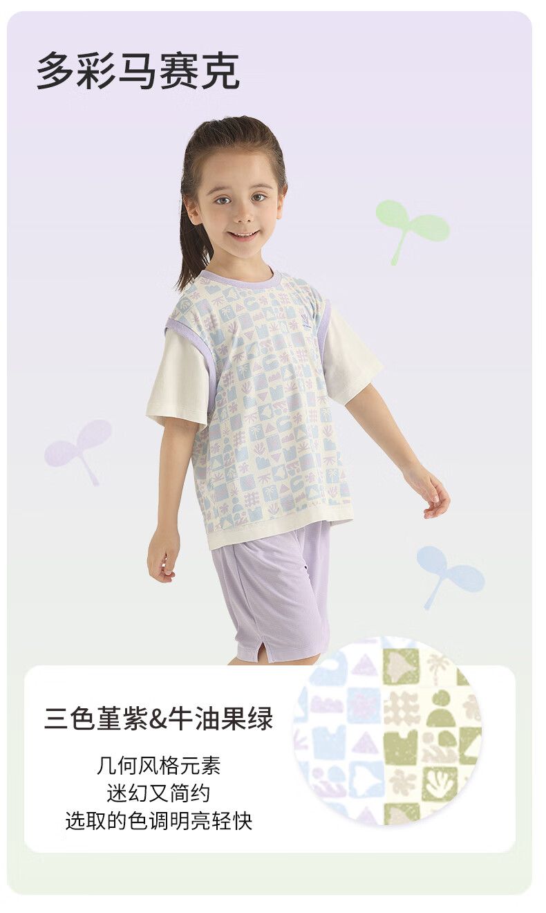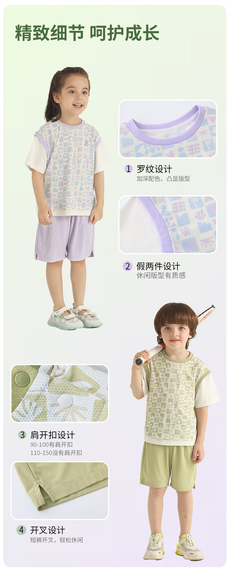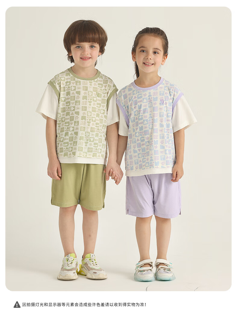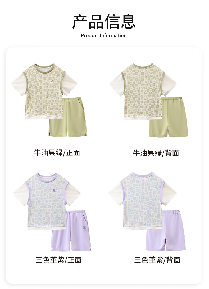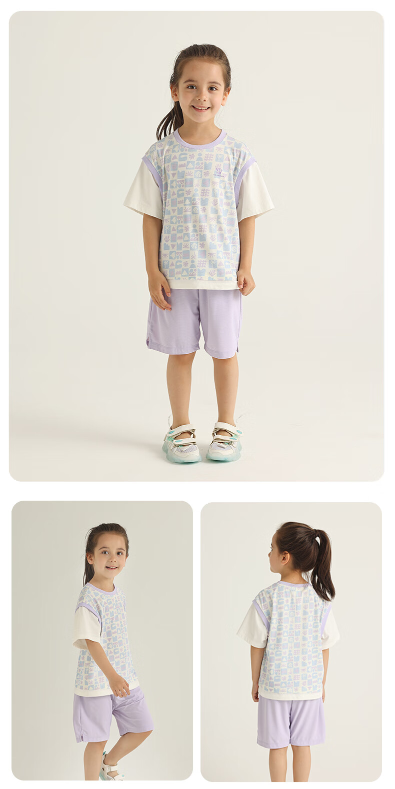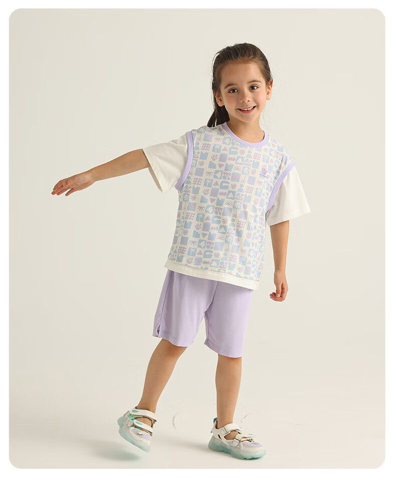 丽婴房儿童运动短袖套装印花速干假两件短袖中裤套装儿童套装 三色堇紫 110 cm